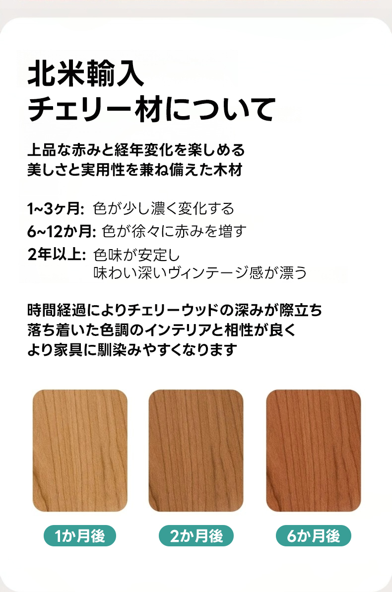 - 【自然な風合いと色合い】:ライトブラウンとベージュの落ち着いた色合いが、ナチュラルで高級感のある生活空間を演出します。チェリー材の自然な風合いが、どんなインテリアにも調和し、上品な雰囲気を醸し出します。