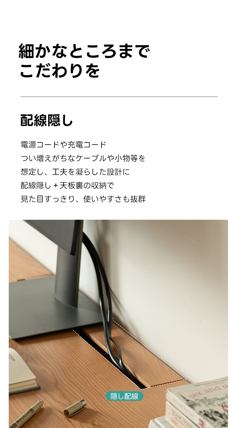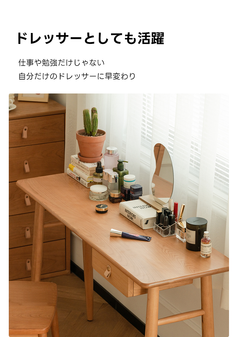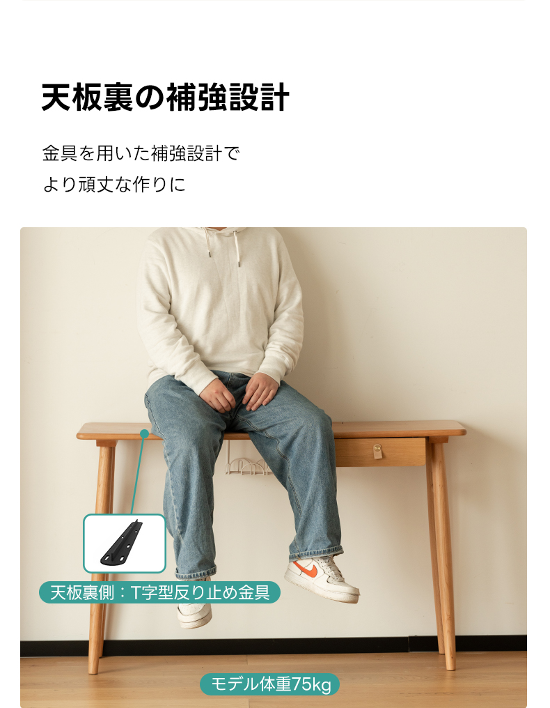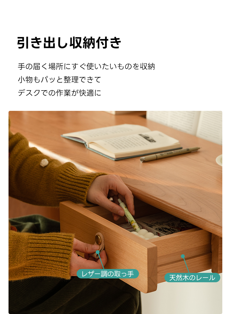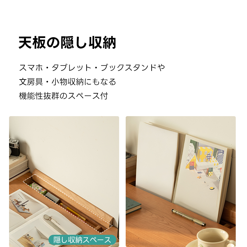 - 【便利な収納機能】天板裏には隠し収納スペースがあり、スマホやタブレット、文房具、小物の収納に便利です。引き出しにはレザー調の取っ手が付いており、使いやすさとデザイン性を兼ね備えています。