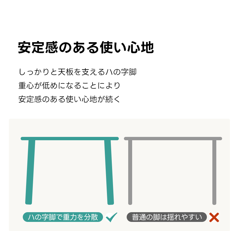 - 【安全で安心な設計】八の字脚のデザインにより、重心が低く安定感があります。天板裏の補強設計で、耐久性も抜群です。組立品なので、簡単に設置することができ、すぐに使用を開始できます。
