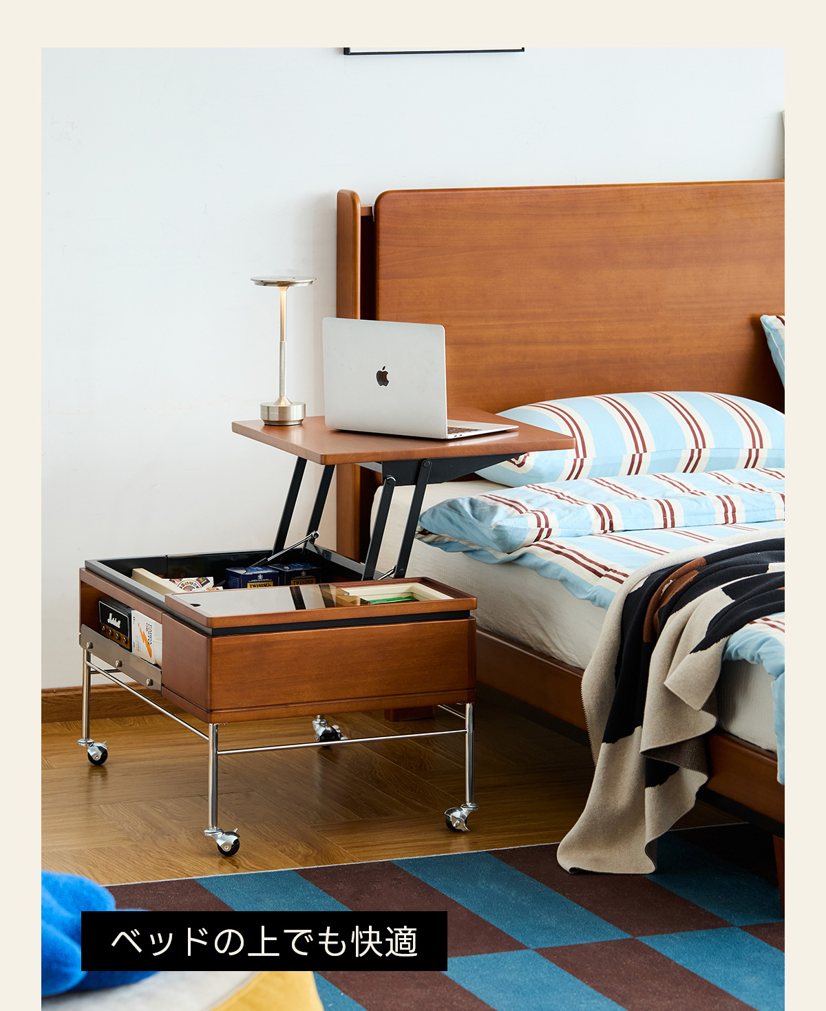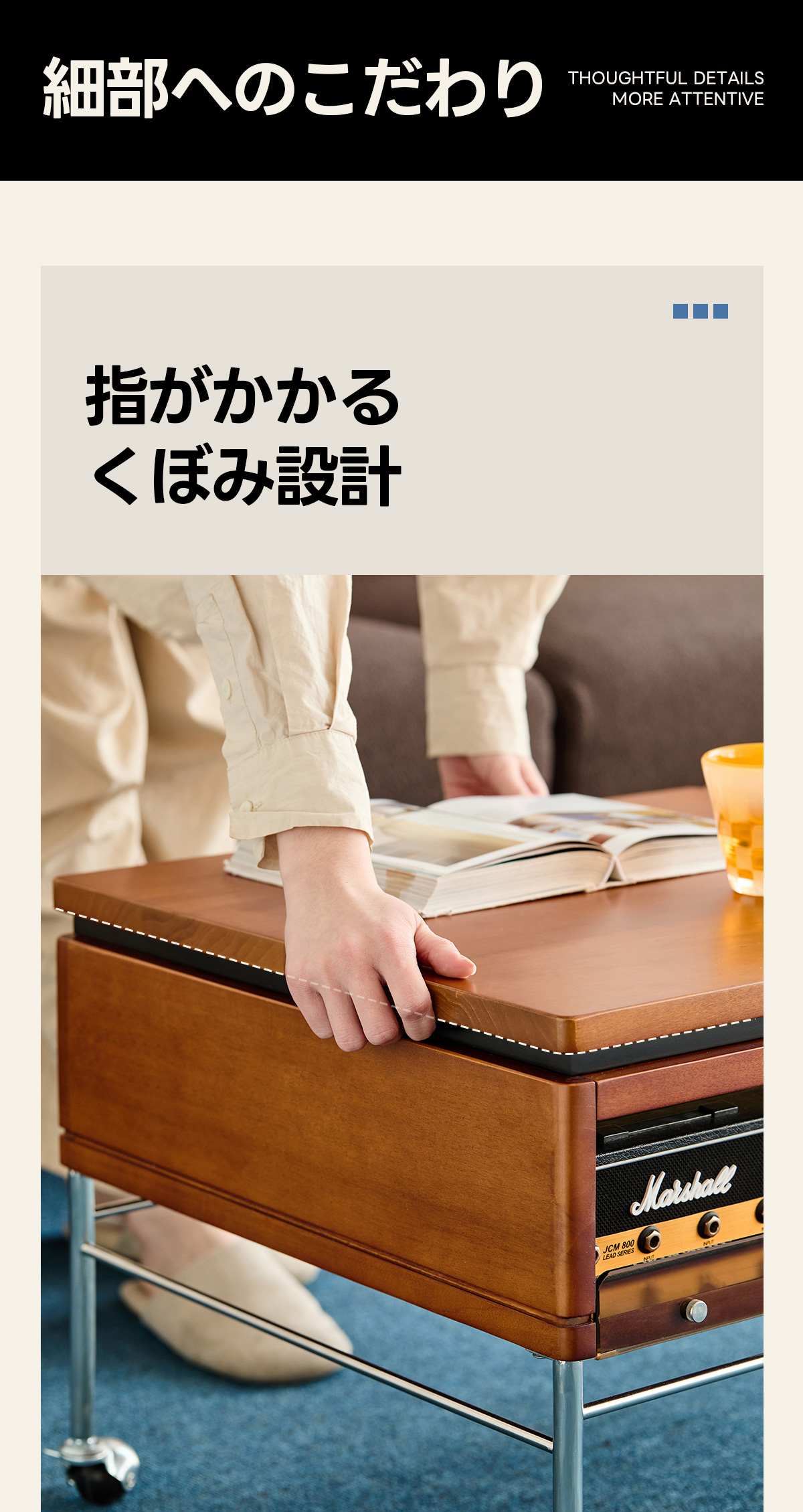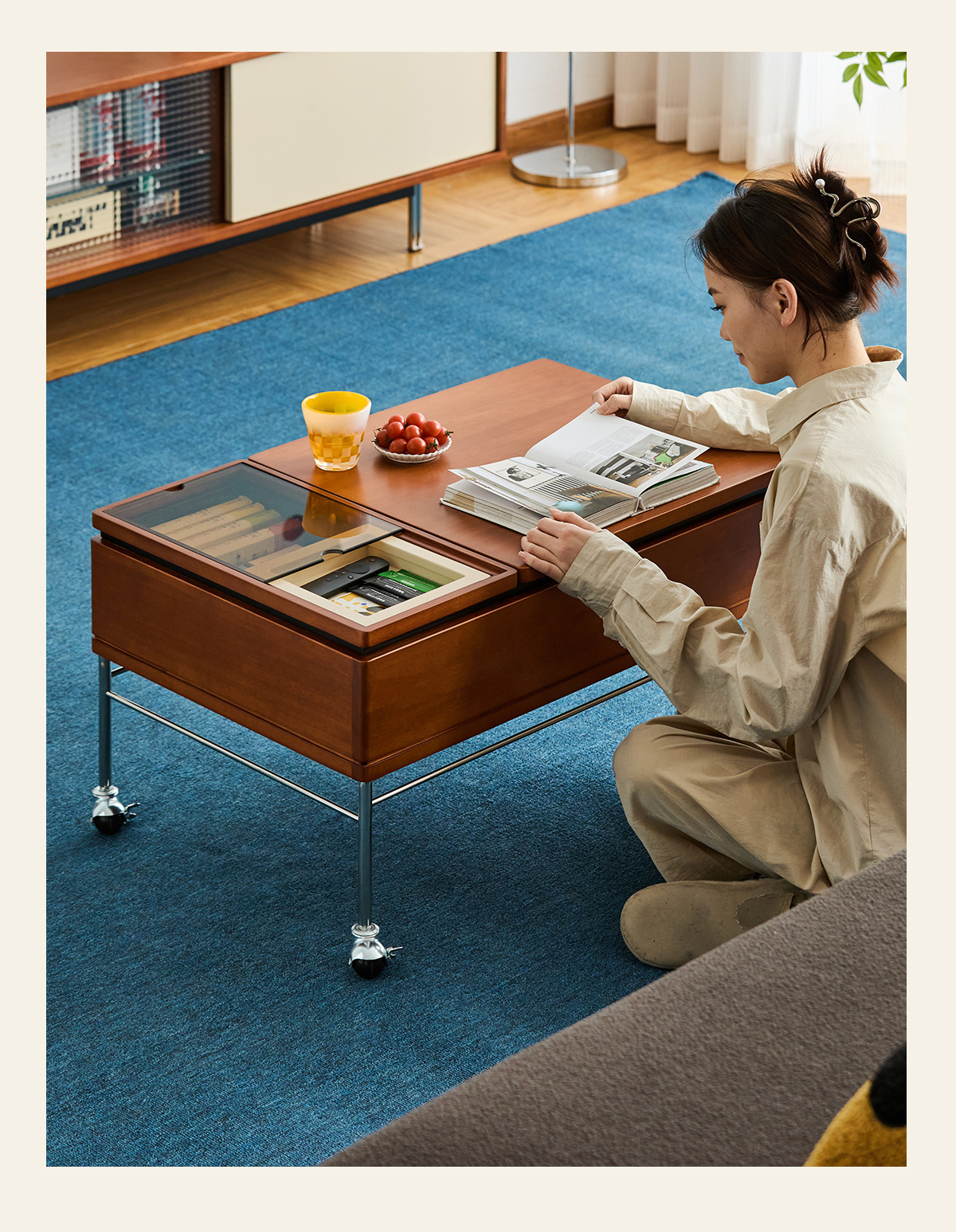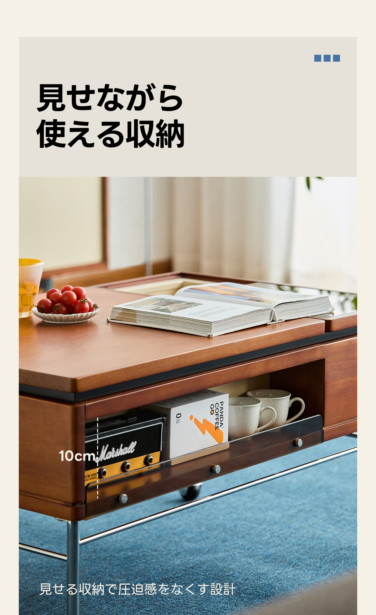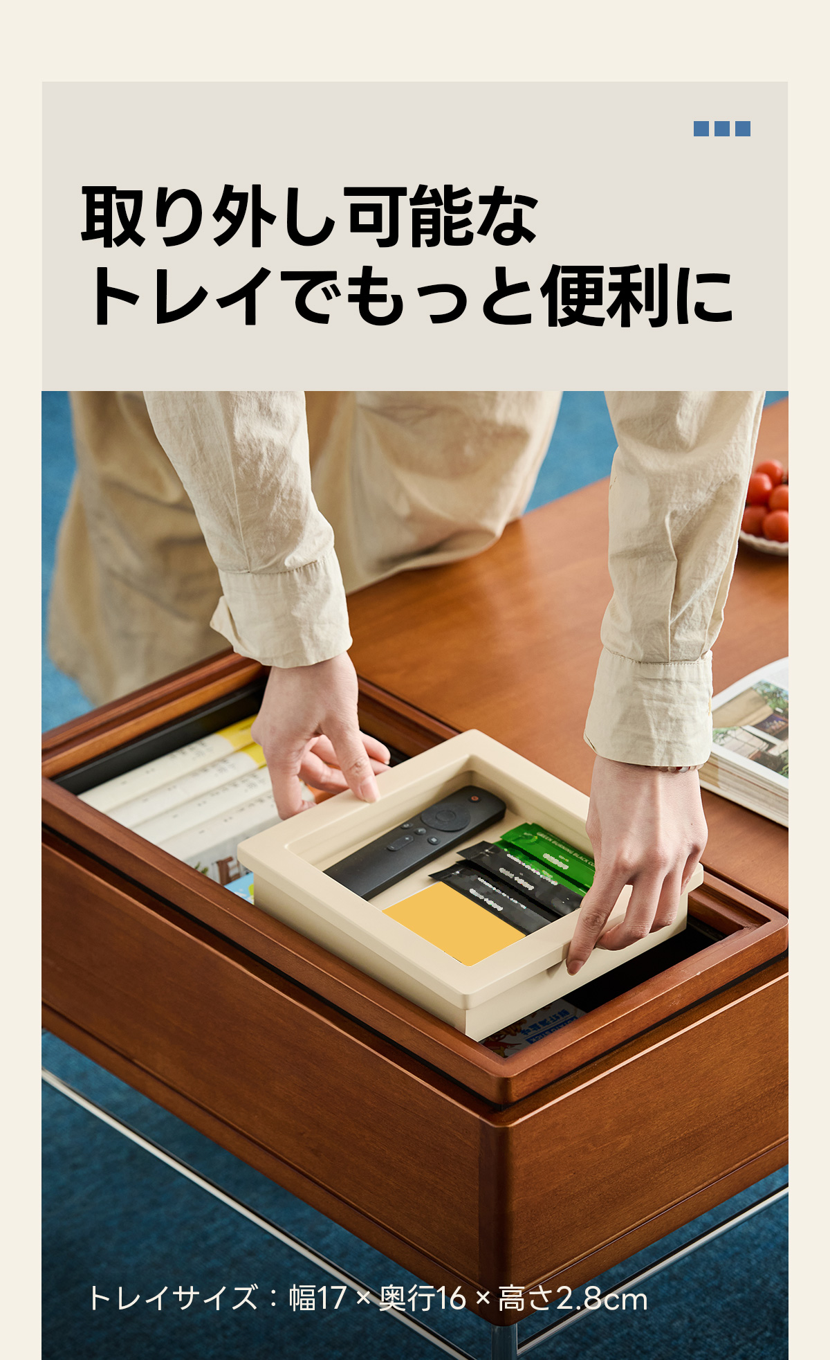 - 【便利な収納スペース】テーブル下には隠し収納スペースがあり、リモコンや雑誌、その他の小物をすっきりと収納できます。取り外し可能なトレイも付いており、使い勝手が良いです。