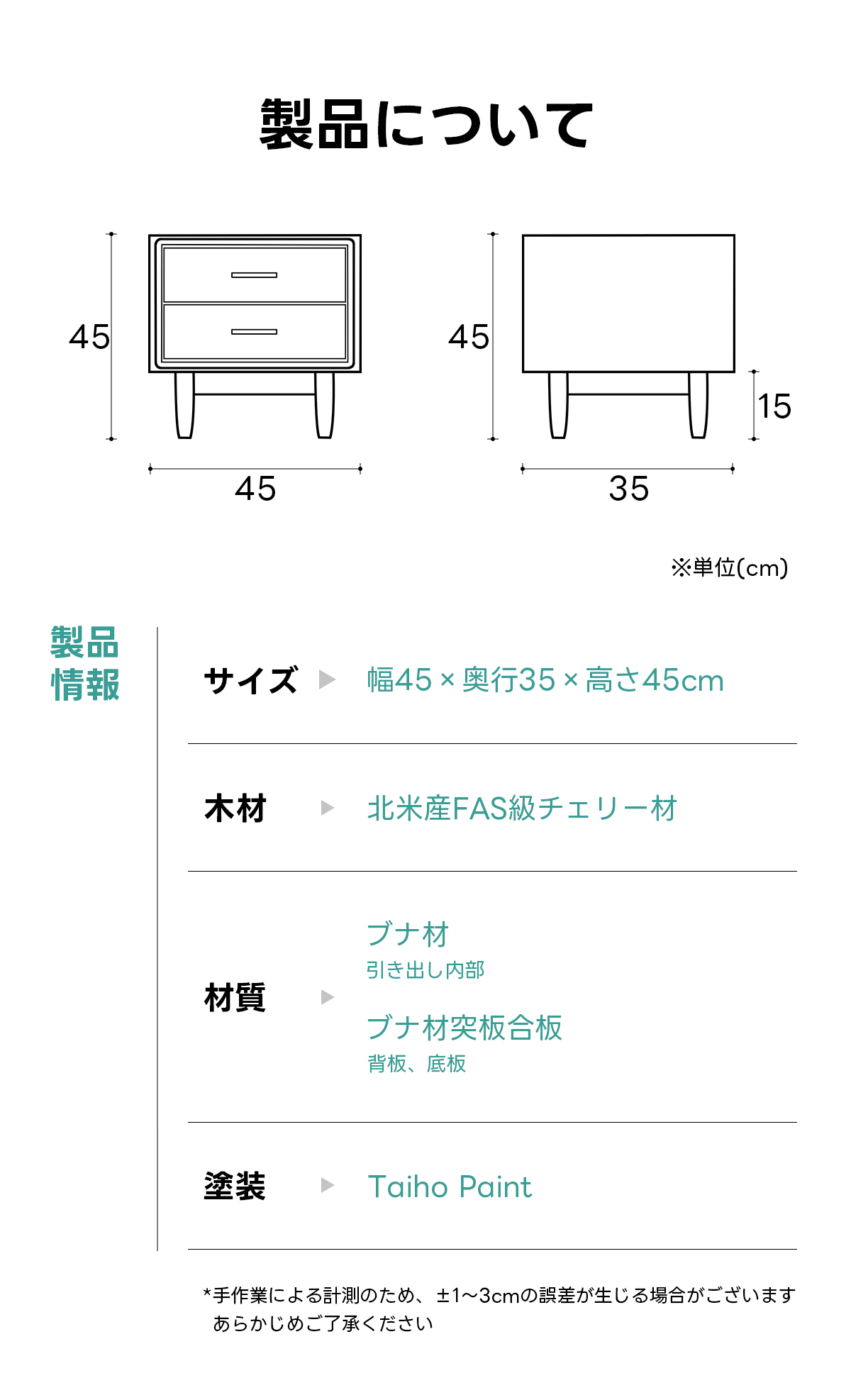 - 【多様な使用シーン】コンパクトなサイズ(45cm x 35cm x 45cm)で、限られたスペースにも設置可能です。ダブル引き出しで、収納スペースが充実しており、小物や書籍をすっきりと整理できます。