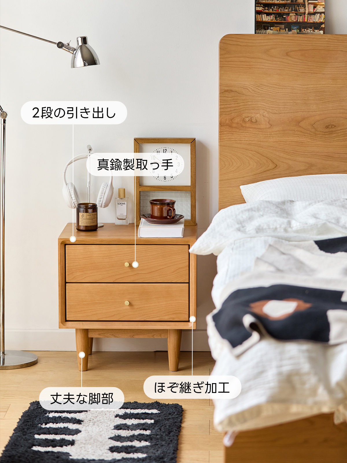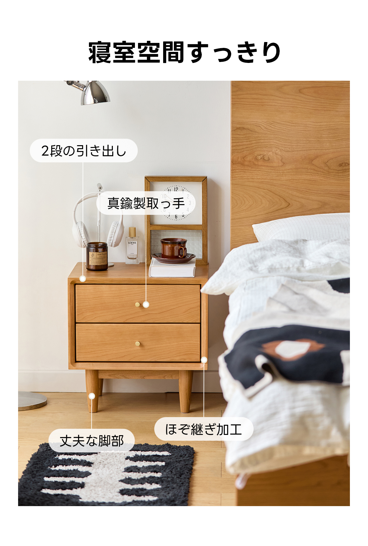 - 【高品質な素材とデザイン】FAS級アメリカ産チェリー材を使用し、時間と共に深みを増す色合いが特徴です。ナチュラルなベージュの色合いが、どんなインテリアにも調和し、寝室やリビングにぴったりです。