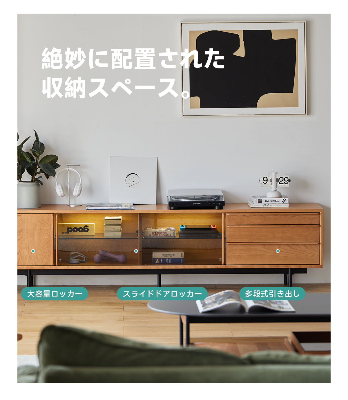 - 【大容量収納とブラウンガラス】ガラス扉の中には大容量の収納スペースがあり、リモコンの信号を遮断しないブラウンガラスを使用しています。引き出しも多段式で、整理整頓がしやすいです。