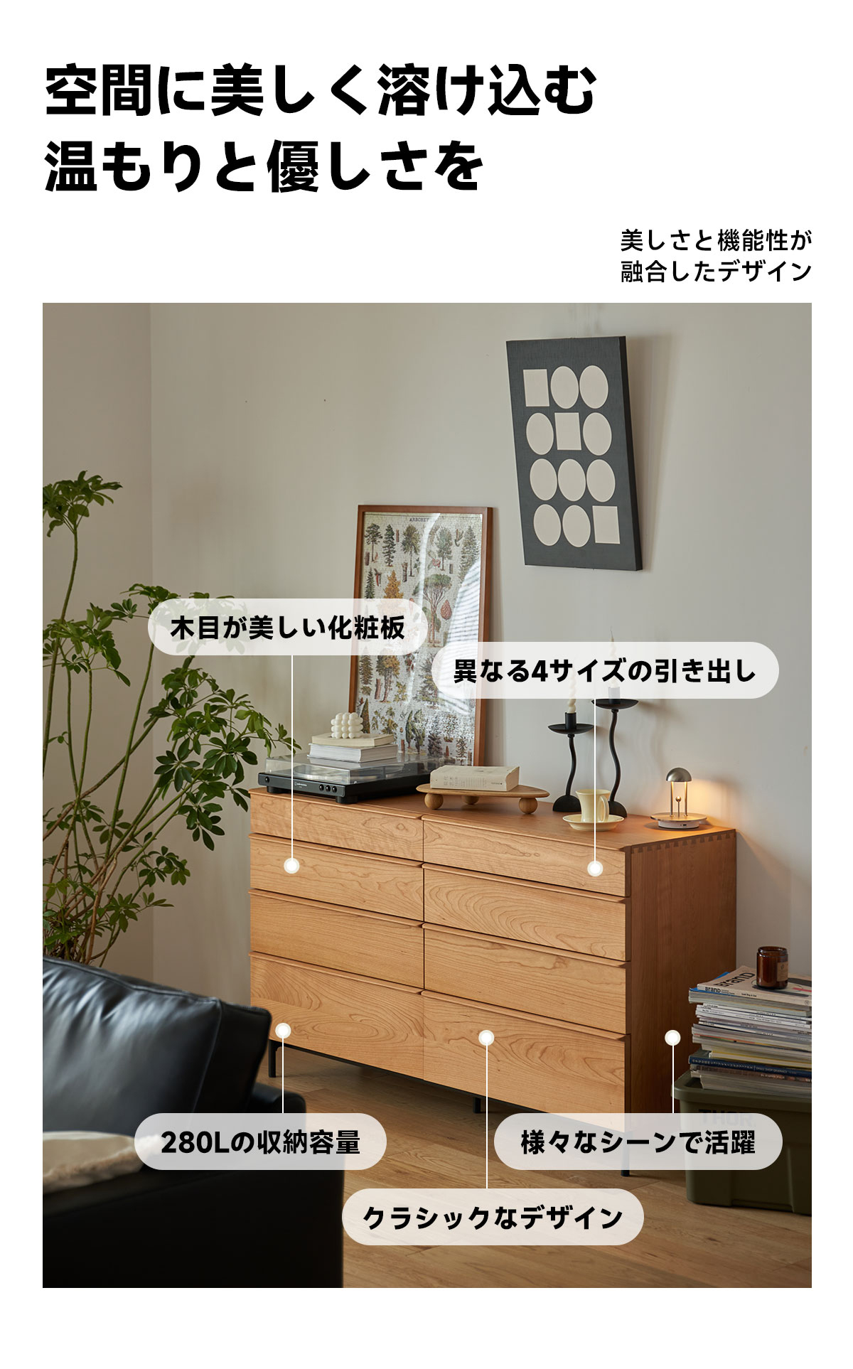 - 【多様な適用シーン】:リビングや寝室、ベッドルームなど、様々なシーンで活躍するこのチェストは、カップルやファミリー、一人暮らしの方にも最適です。ナチュラルなデザインがどんなインテリアにも自然に溶け込みます。