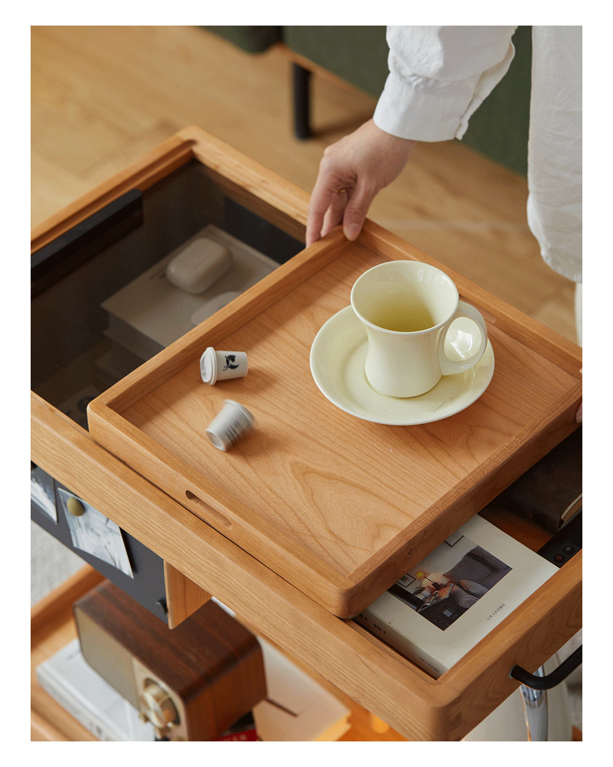 - 【多機能収納とスムーズな移動】キャスター付きで360°自由に移動可能なコンパクトウッドサイドワゴン。キッチンやリビング、寝室など様々な場所で活躍します。トレイは取り外し可能で、単独でも使用可能。下部にはオープンな収納スペースがあり、多様なアイテムを収納できます。
