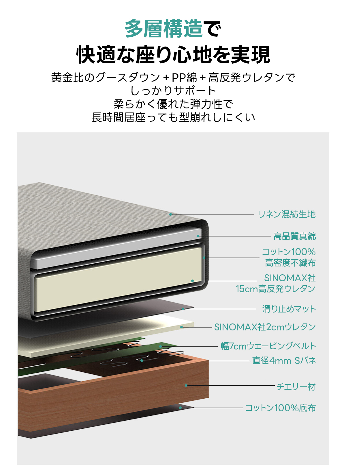 - 【高品質な素材とデザイン】チェリー材を使用したウッドフレームは耐久性が高く、長期間にわたって使用可能です。ファブリックはリネン混紡生地を使用しており、肌触りが良く、洗濯しても縮みにくい特性があります。クッションはグースダウンとPP綿、高反発ウレタンを組み合わせた多層構造で、快適な座り心地を提供します。