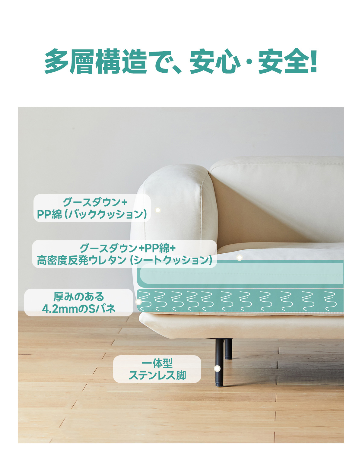 - 【多層構造で安定感抜群】:厚みのあるSバネと一体型ステンレス脚により、しっかりとしたサポートと安定感を提供します。防水防汚素材を採用しており、汚れがつきにくく、簡単にお手入れができます。