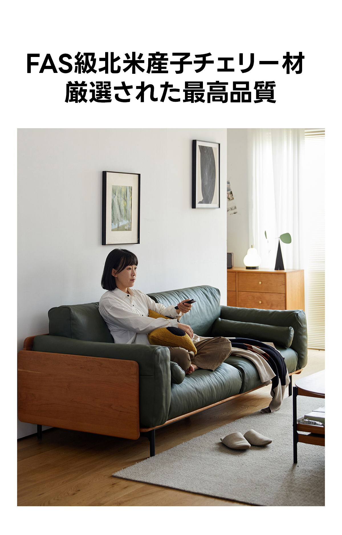 - 【高品質な素材とデザイン】フレームにはSUP級北米産チェリー材を使用し、サイドパネルやバックパネルには一枚板の直貼り技法を採用。クッションはガチョウの羽毛とPP綿を6:4の比率で充填し、ふっくらとした厚みと快適な座り心地を実現しています。