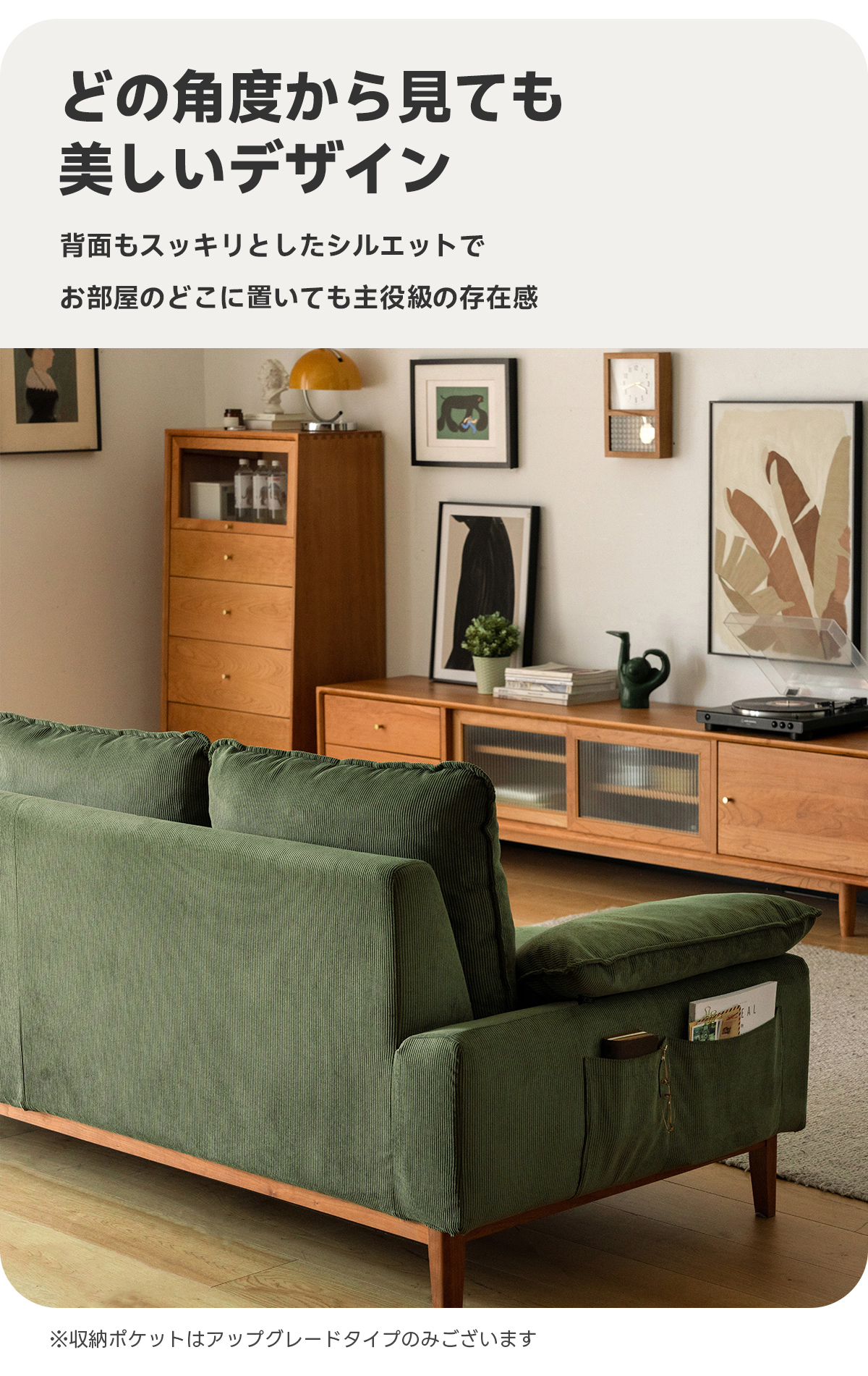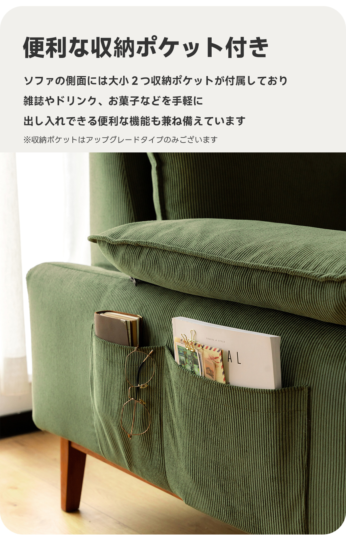 - 【実用性と耐久性】:側面には便利な収納ポケットが付いており、雑誌やリモコンを手軽に収納可能です。フレームにはFAS級のチェリー材を使用し、耐久性も確保されています。