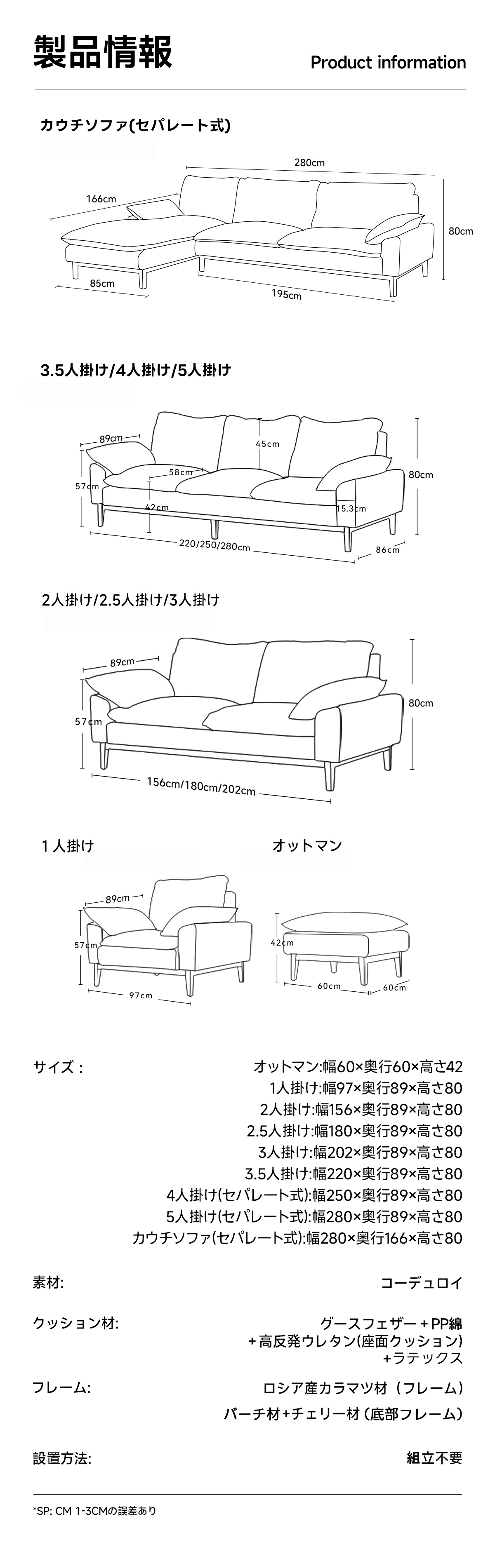 - 【多様なサイズと適用範囲】:一人掛けから五人掛けまで、さまざまなサイズが用意されています。オットマンも付属しており、コンパクトな一人暮らしからファミリー向けまで、幅広く対応します。