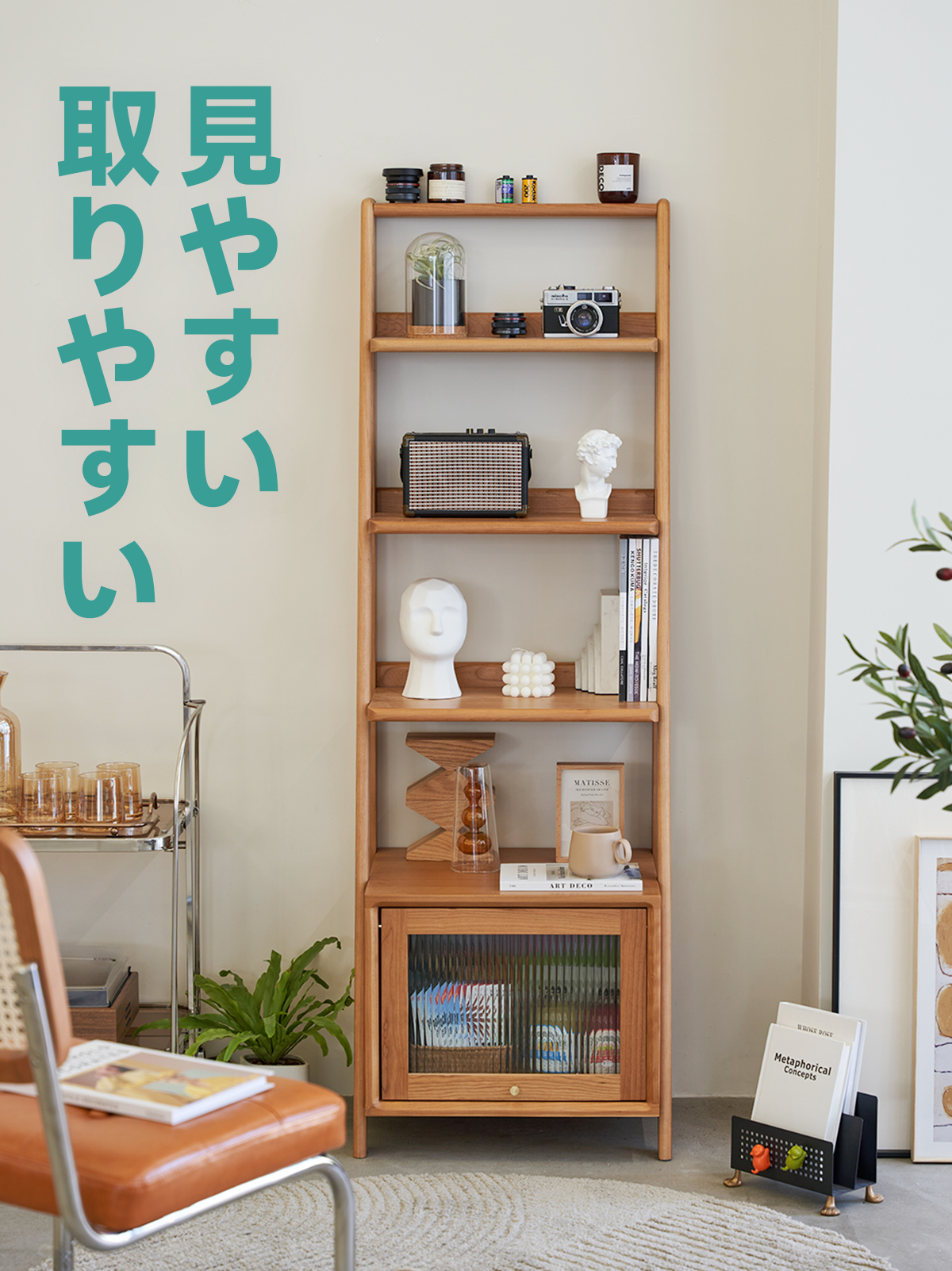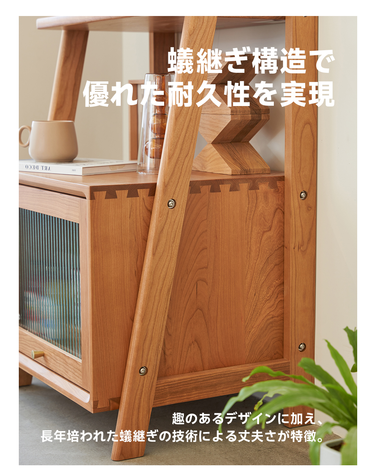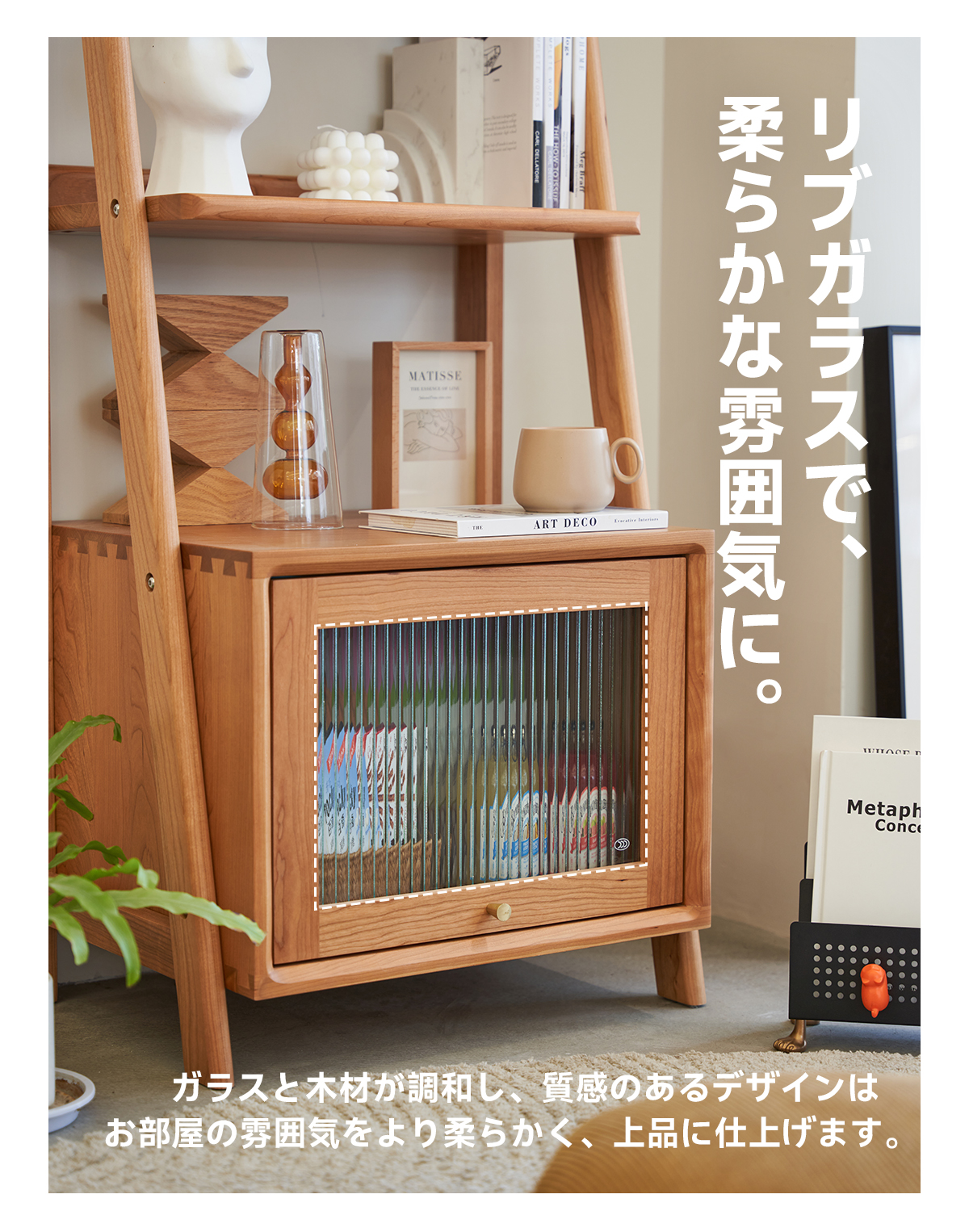 - 【リブガラスキャビネットでスタイリッシュに収納】下部にはリブガラス扉付きのキャビネットがあり、埃を防ぎながらも中身を柔らかく隠します。見た目の美しさと実用性を兼ね備えたデザインです。
