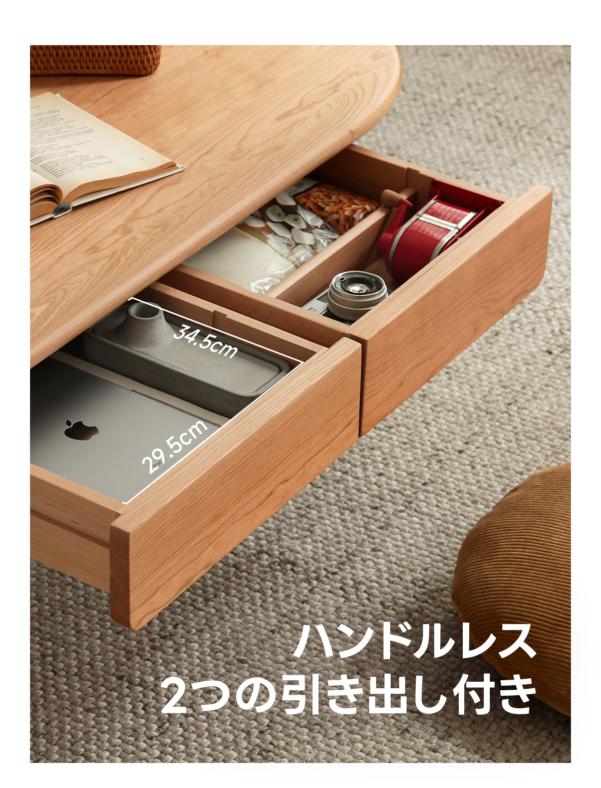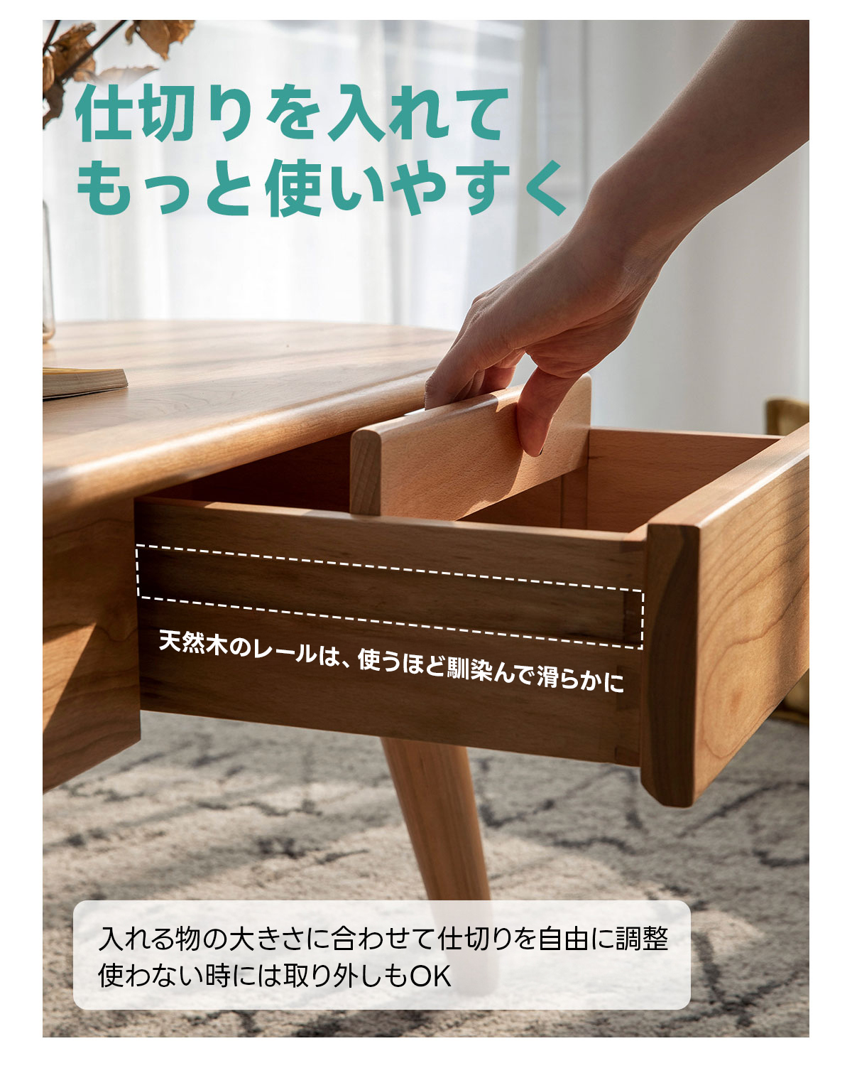 - 【便利な引き出し付き】Woody Primeのセンターテーブルは、2つのハンドルレス引き出しを備えており、内部には仕切り板が設置されています。これにより、リモコンや雑誌などのアイテムを整理して収納することができ、リビングをすっきりと保ちます。