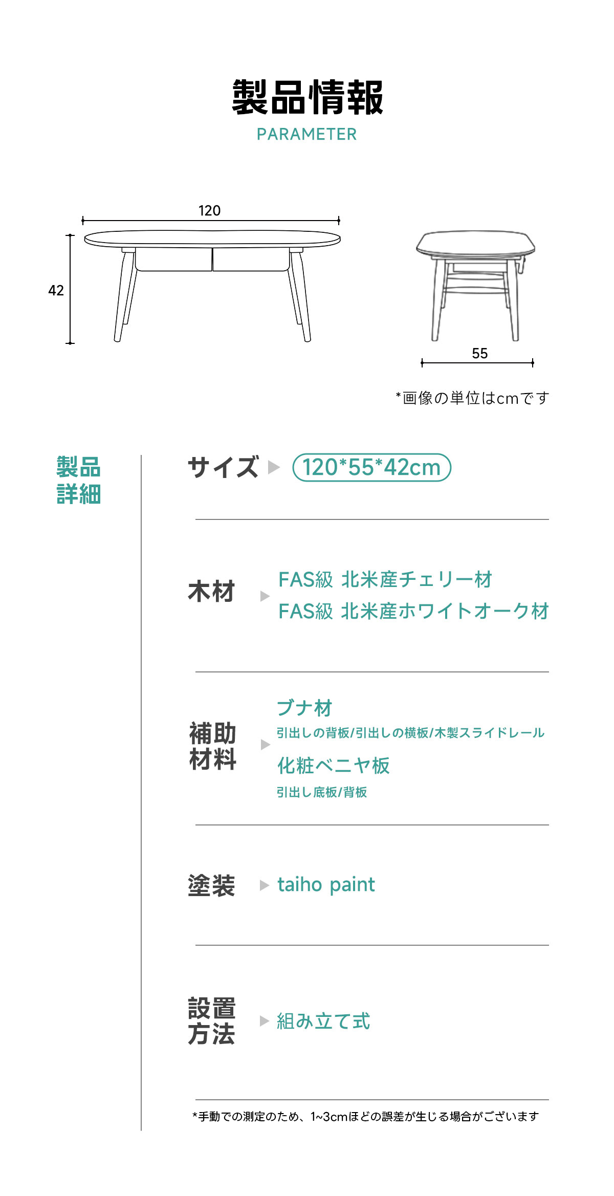 - 【快適な使用感】幅120cm、奥行き55cmの広い天板は、リモートワークや読書に最適です。テーブルの高さは42cmで、座った時にちょうど良い高さとなっており、快適な使用感を提供します。