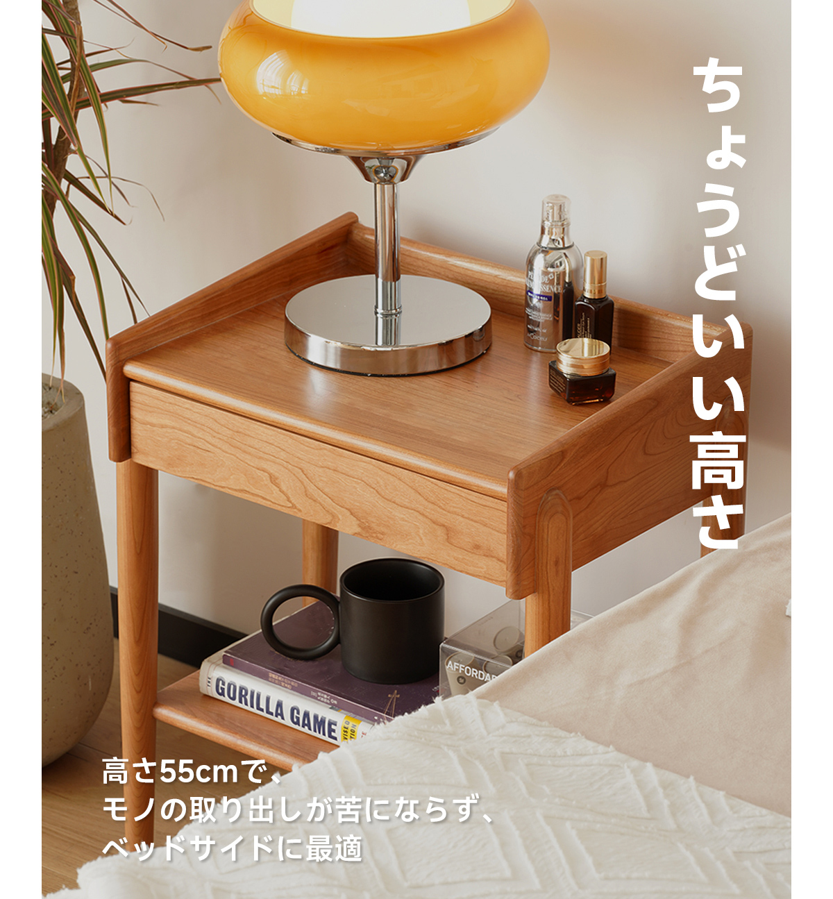- 【使いやすい高さ設計】高さ55cmで、物の取り出しがしやすく、ベッドサイドにぴったりのサイズ感です。オープンラックと引き出しの組み合わせで、収納力も抜群です。