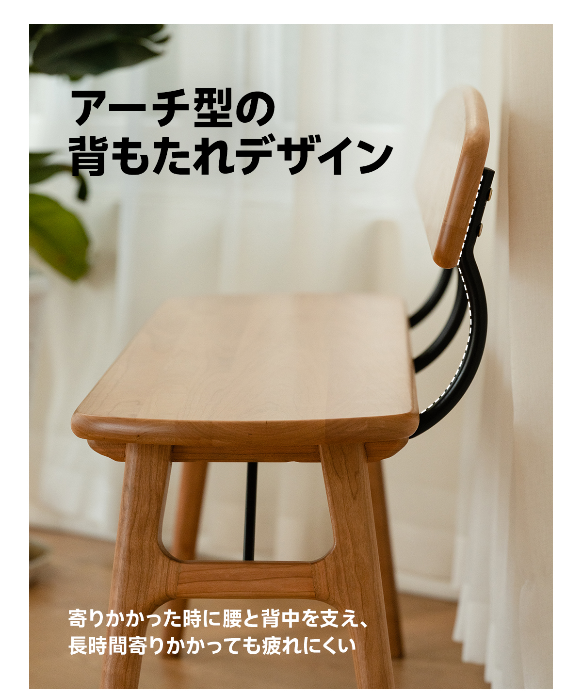 • 【高級感と耐久性を兼ね備えたダイニングベンチ】北米産のFAS級チェリーウッドを使用したこのダイニングベンチは、その美しい木目と高級感が際立ちます。長時間座っても疲れにくいアーチ型の背もたれデザインで、腰と背中をしっかりサポートします。