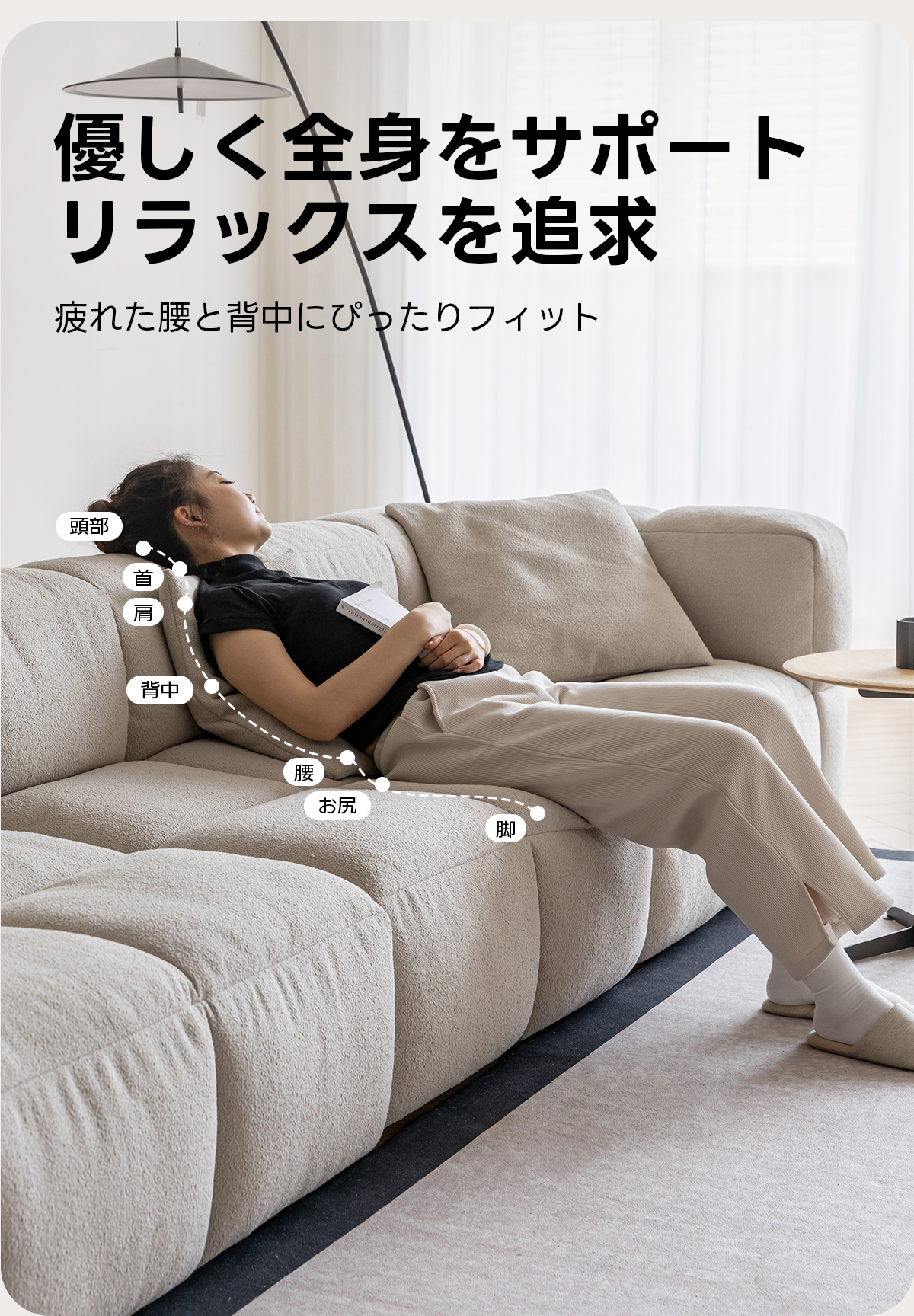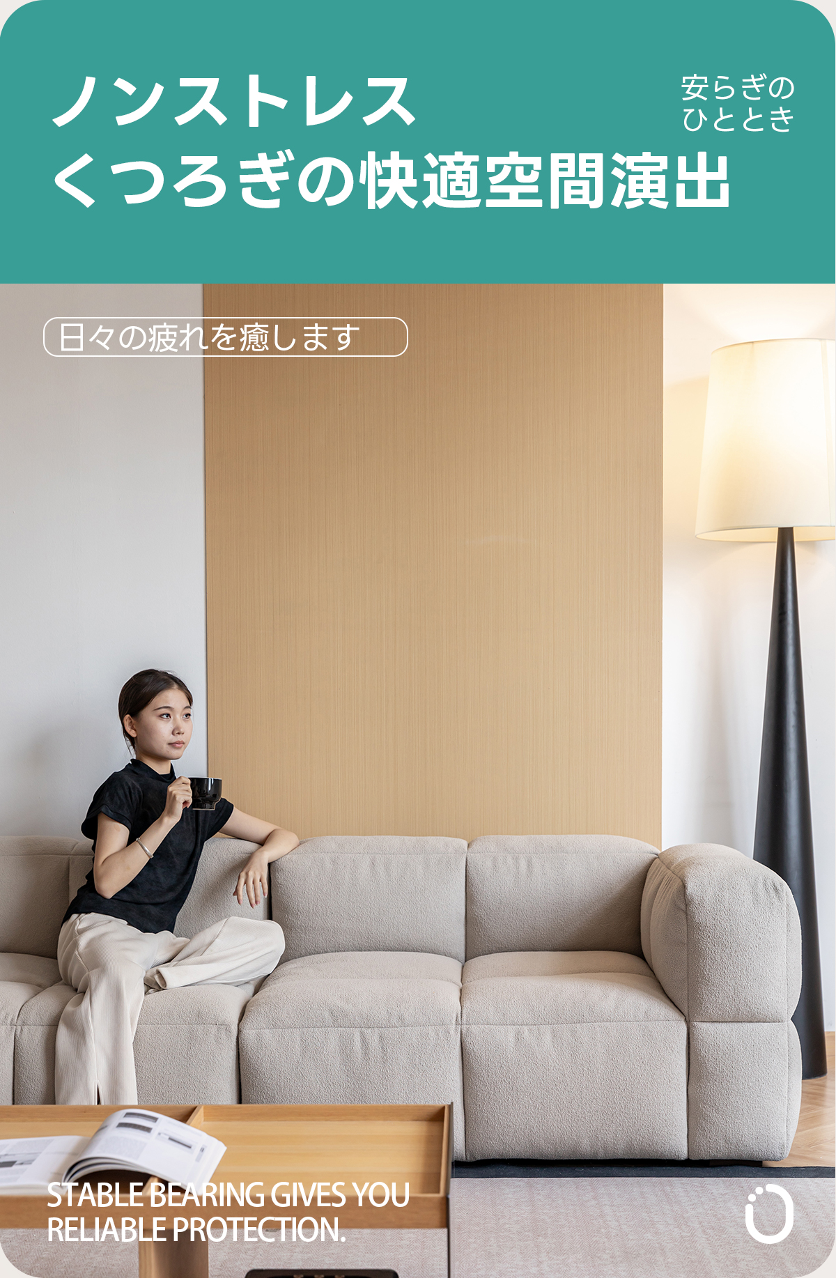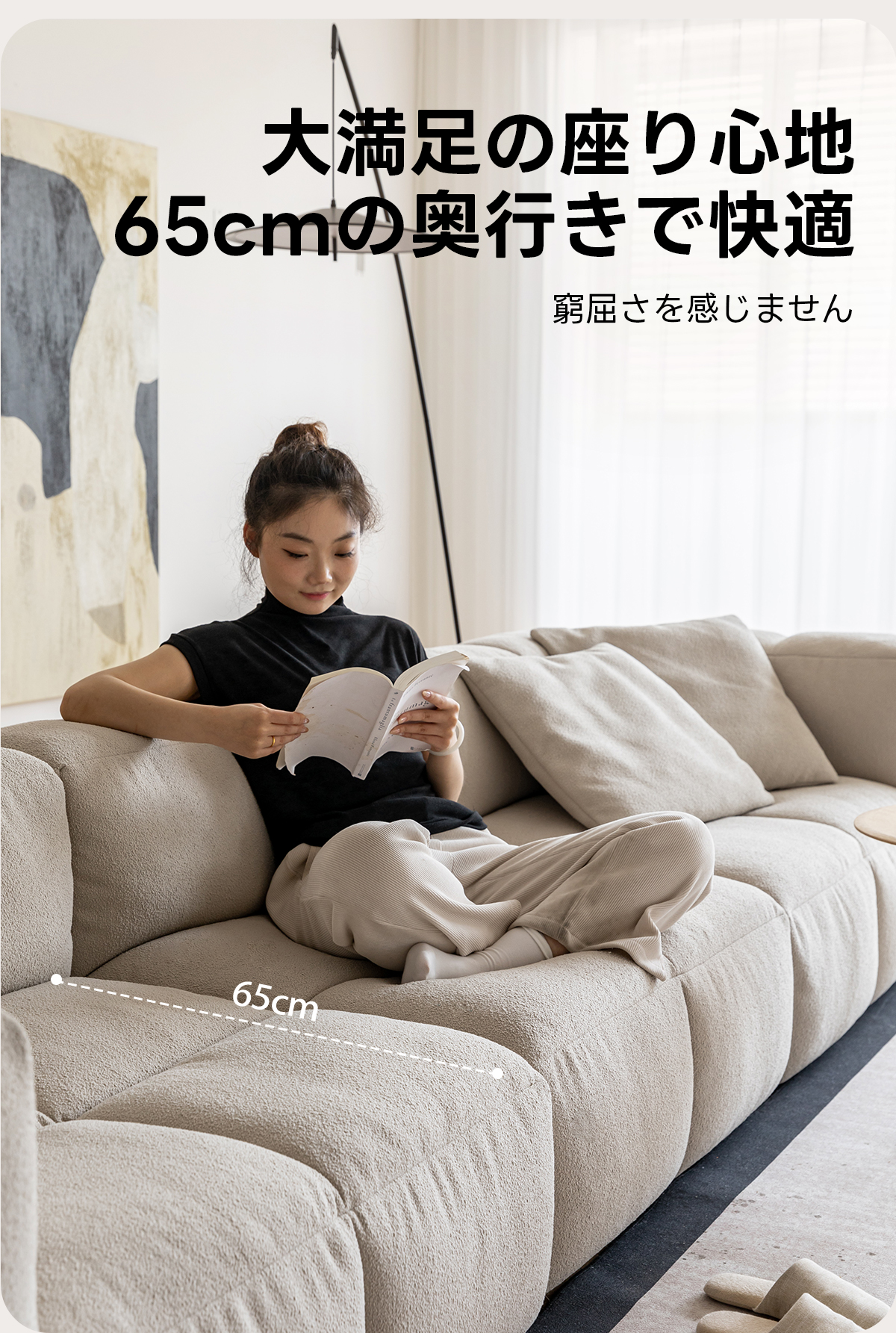 - 【快適な座り心地】:4層のクッション構造により、圧力を分散し、長時間座っても疲れにくい設計。65cmの奥行きがあり、くつろぎの時間を提供します。