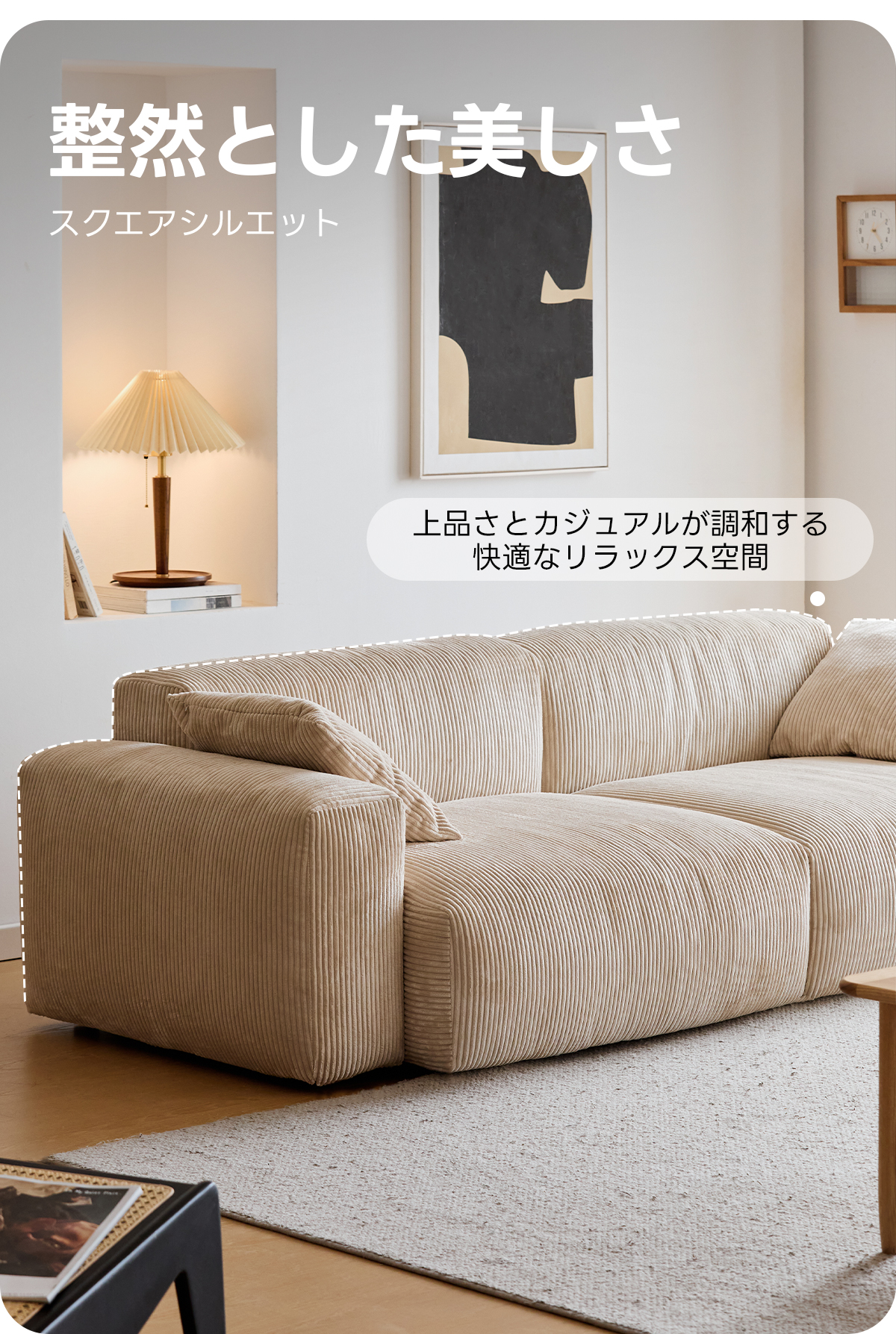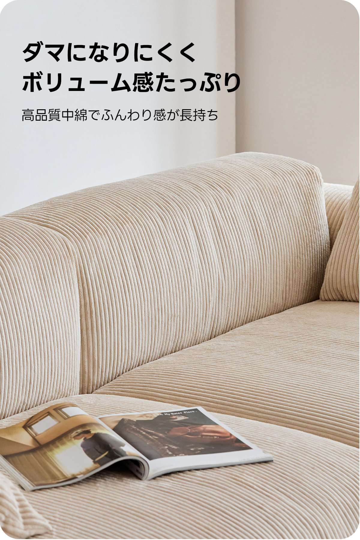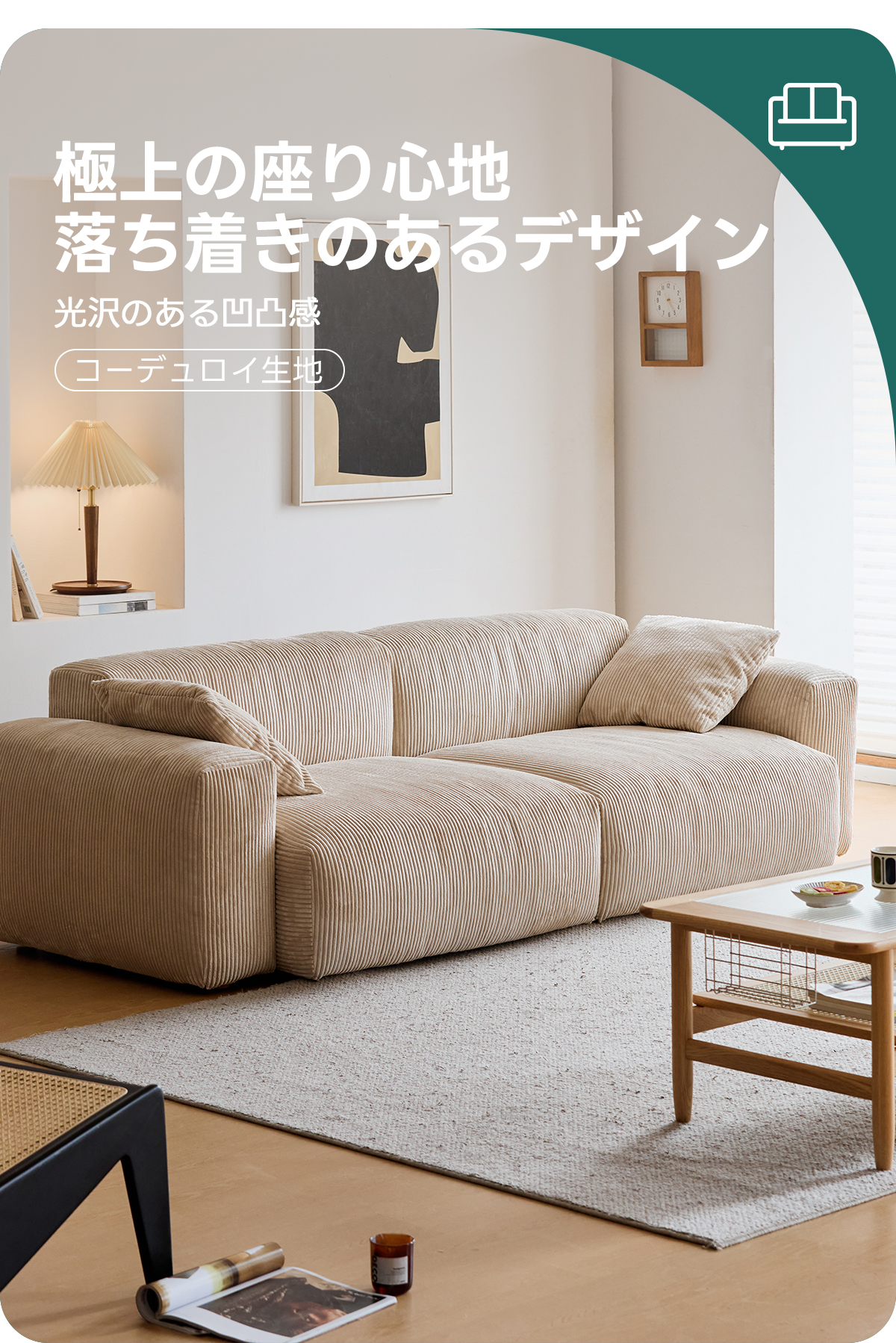 - 【高品質素材とデザイン】:高級感あふれるコーデュロイ生地を使用し、羽毛、PP綿、ウレタンを組み合わせた充填材が、雲のような柔らかさを提供します。カラマツフレームと静音コイルSバネで耐久性も抜群です。