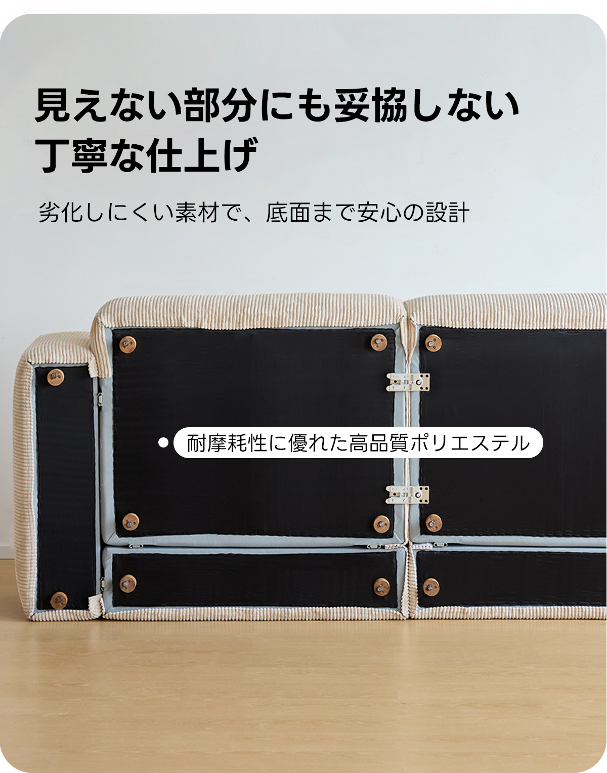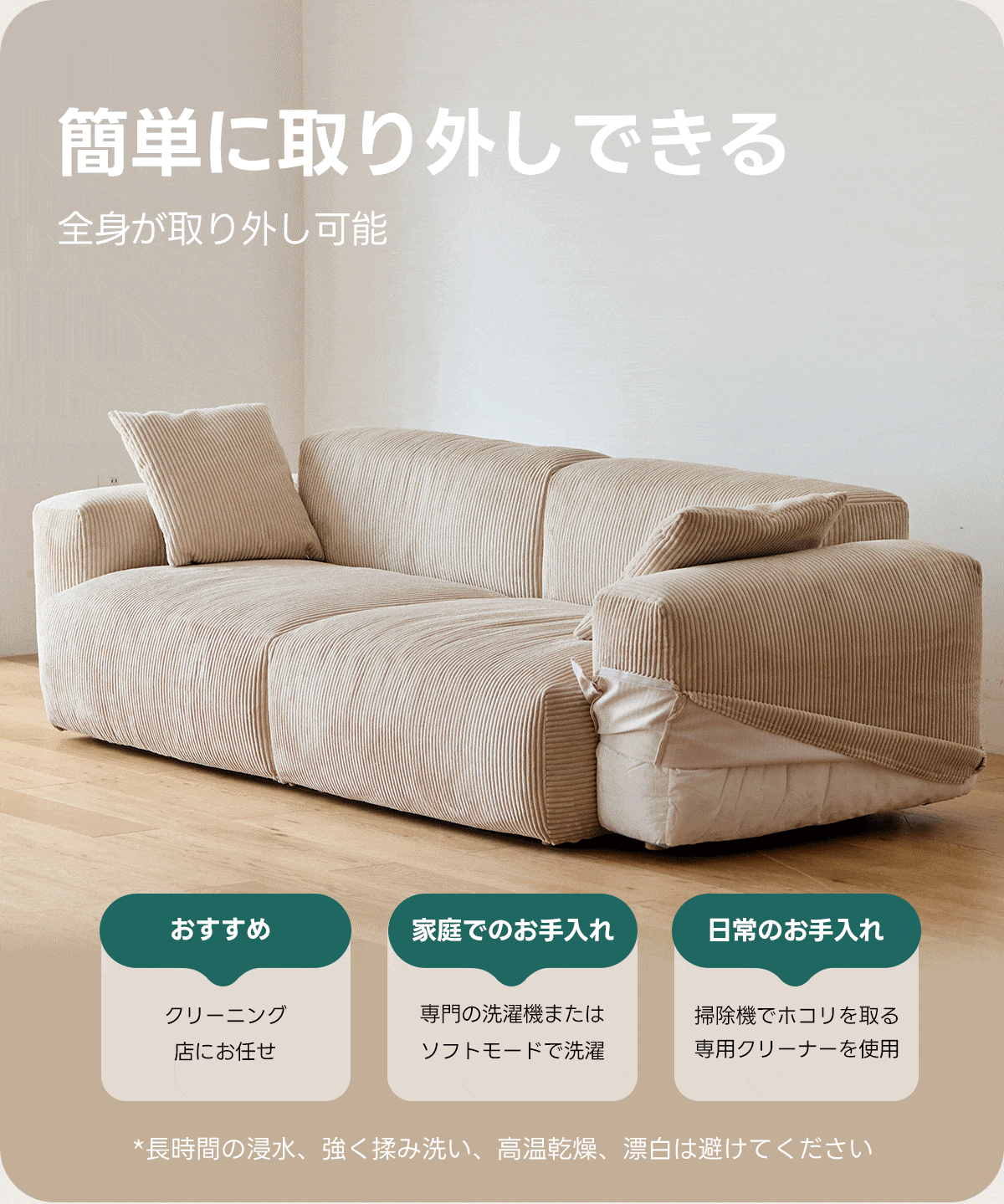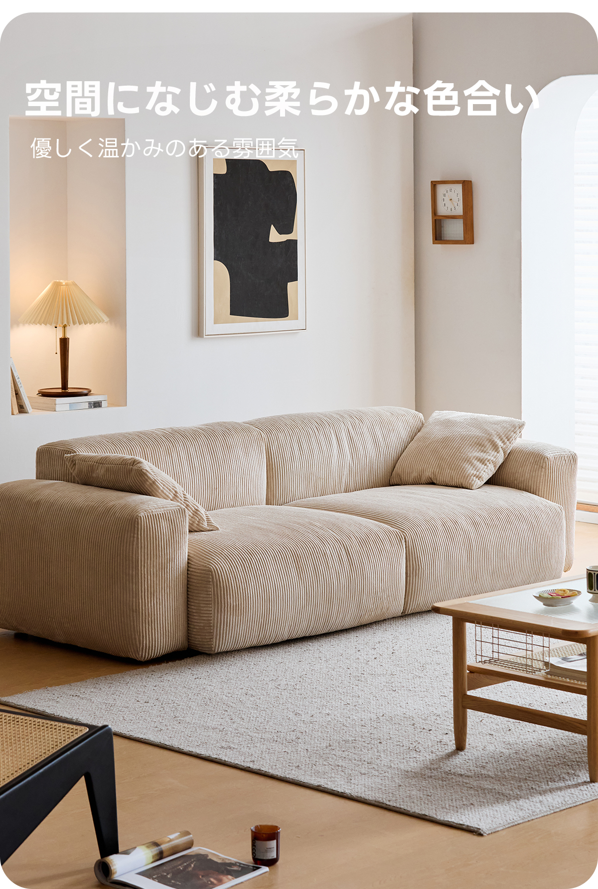 - 【高品質素材とデザイン】:高級感あふれるコーデュロイ生地を使用し、羽毛、PP綿、ウレタンを組み合わせた充填材が、雲のような柔らかさを提供します。カラマツフレームと静音コイルSバネで耐久性も抜群です。
