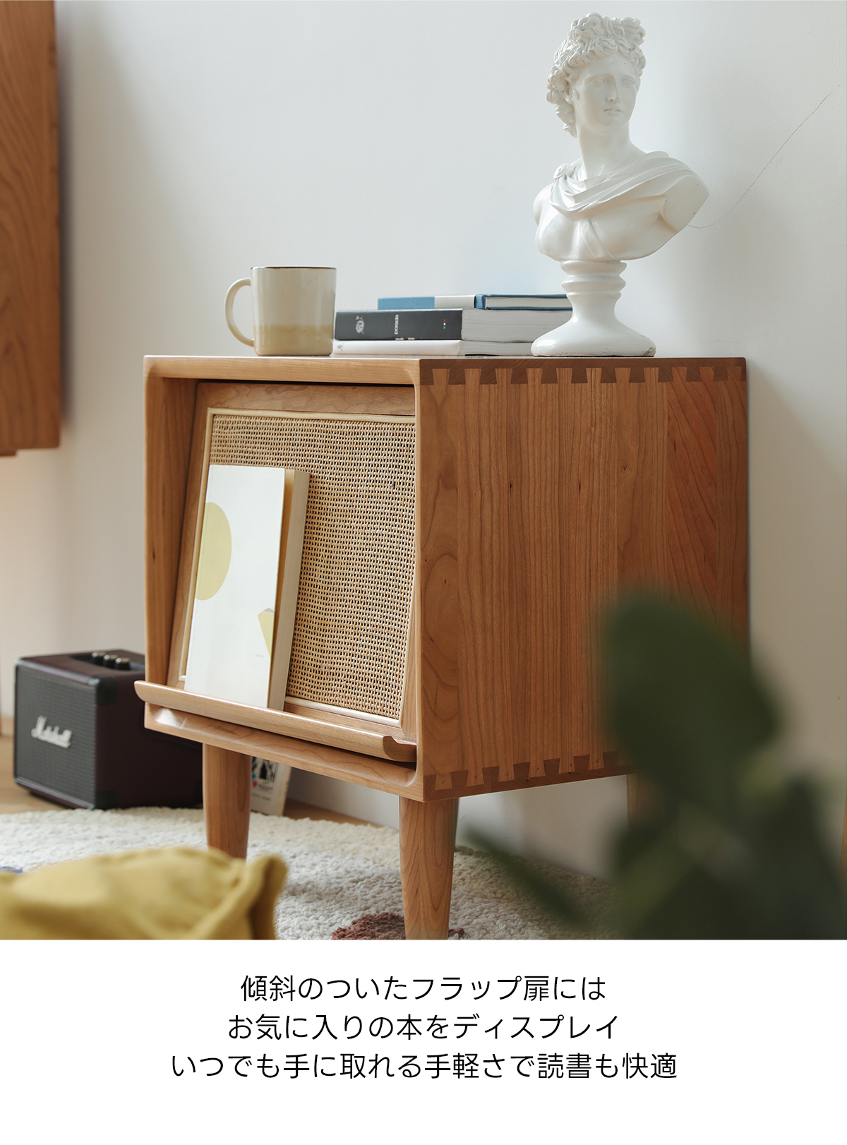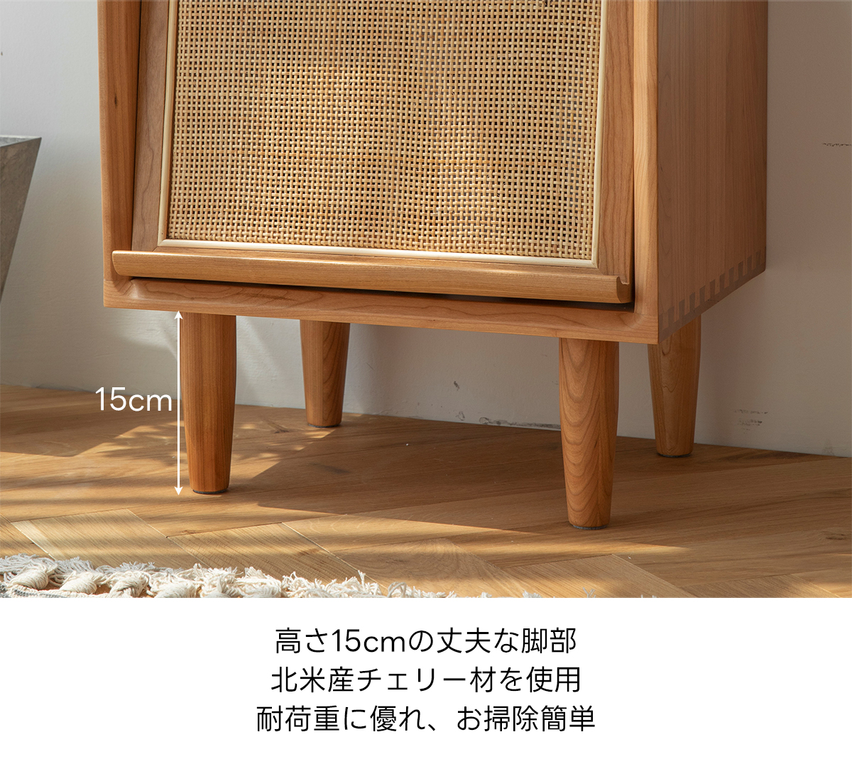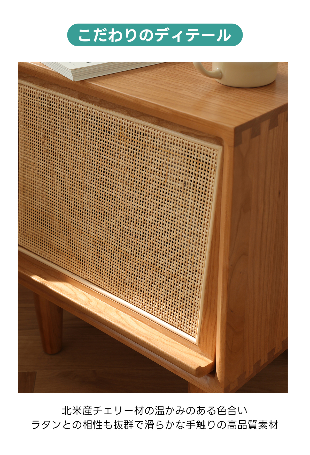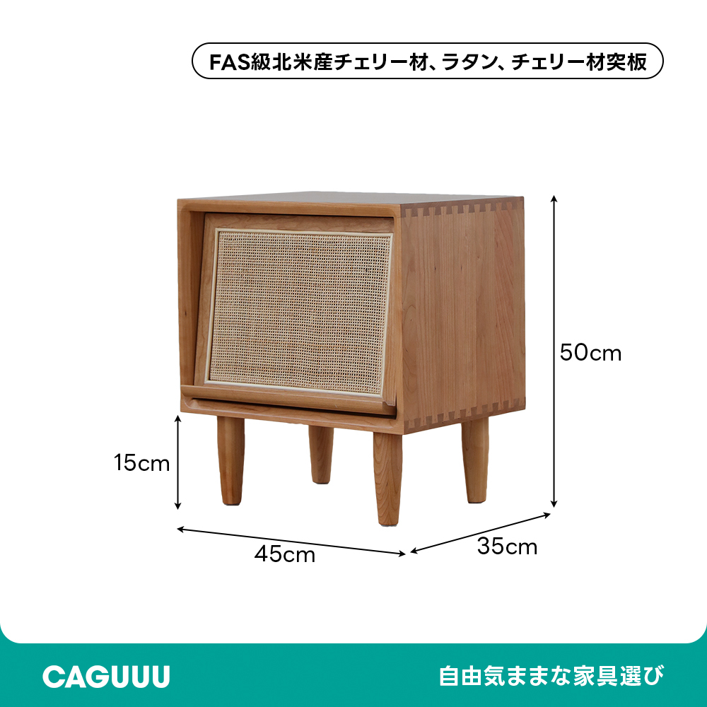 - 【高品質な素材とデザイン】FASグレードのチェリー材を使用し、ラタン調の扉がアクセントとなっています。脚付きのため掃除もしやすく、清潔に保てます。滑らかなエッジ加工が施されており、安全性も考慮されています。