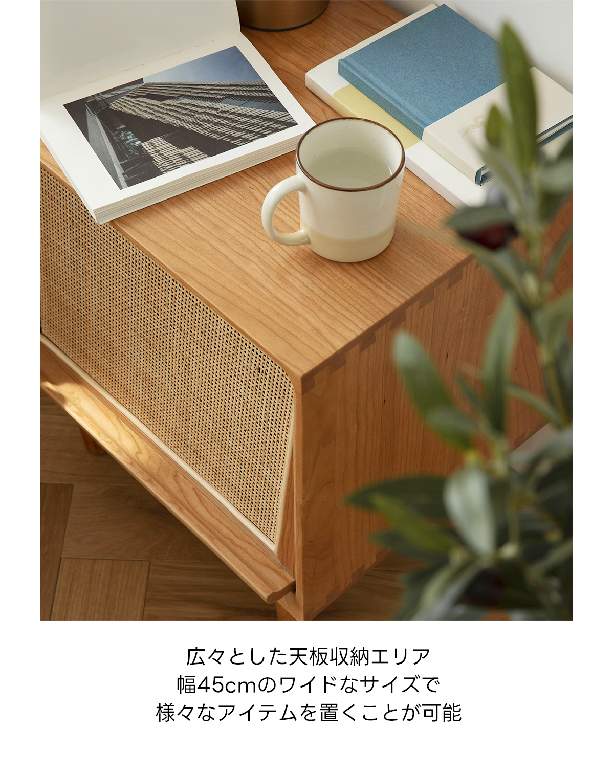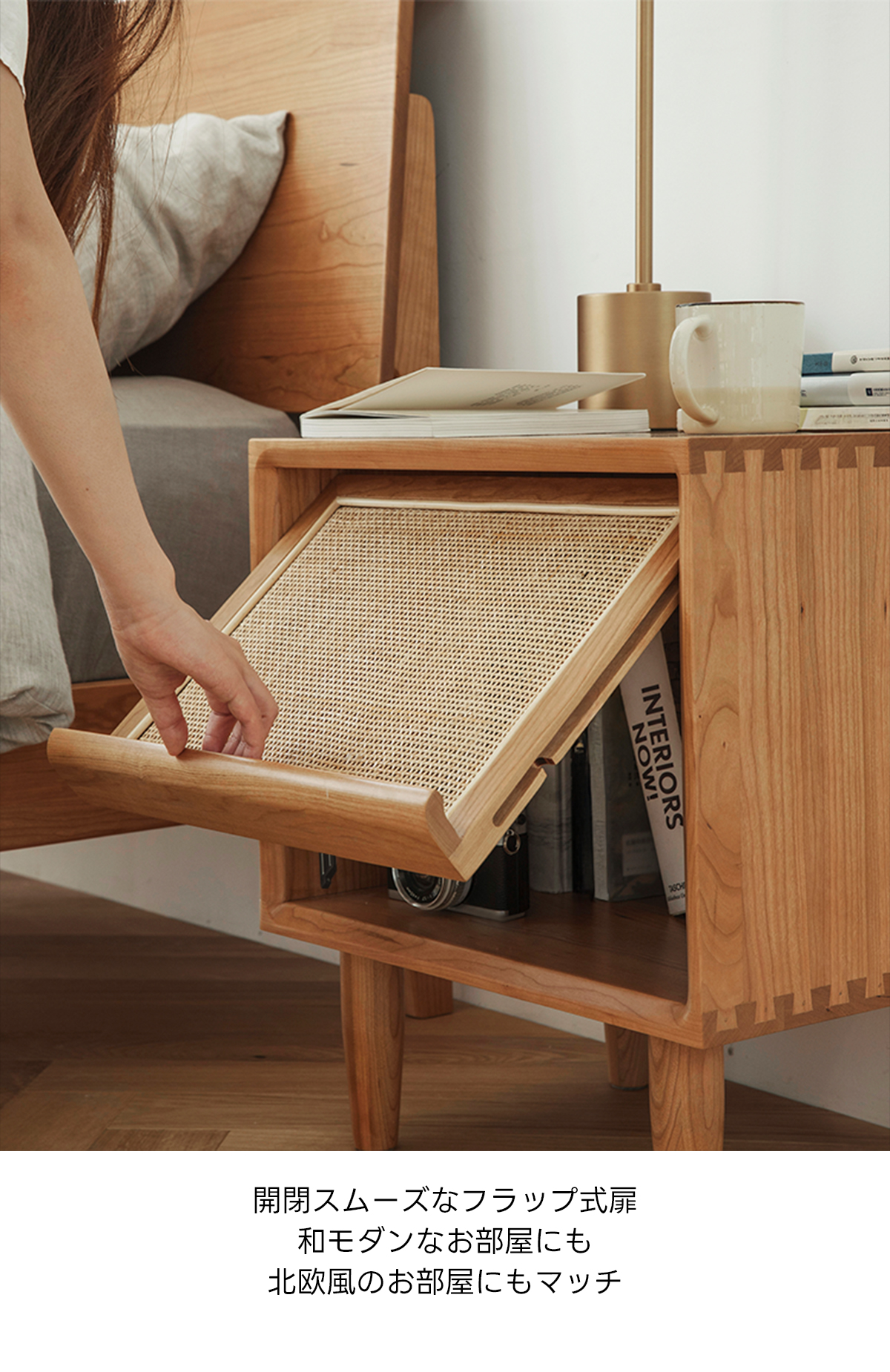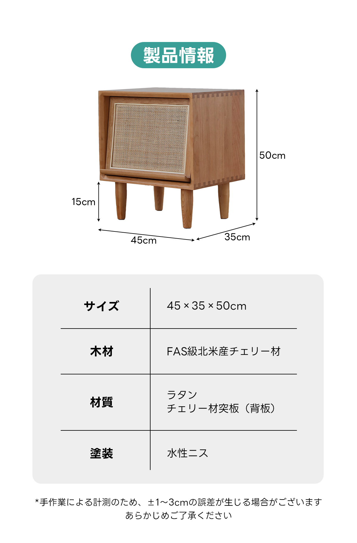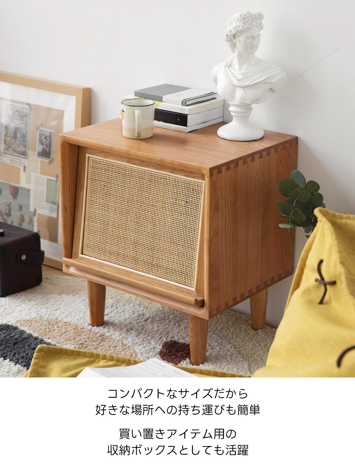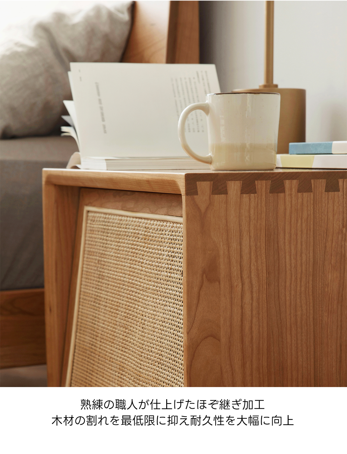 - 【高品質な素材とデザイン】FASグレードのチェリー材を使用し、ラタン調の扉がアクセントとなっています。脚付きのため掃除もしやすく、清潔に保てます。滑らかなエッジ加工が施されており、安全性も考慮されています。