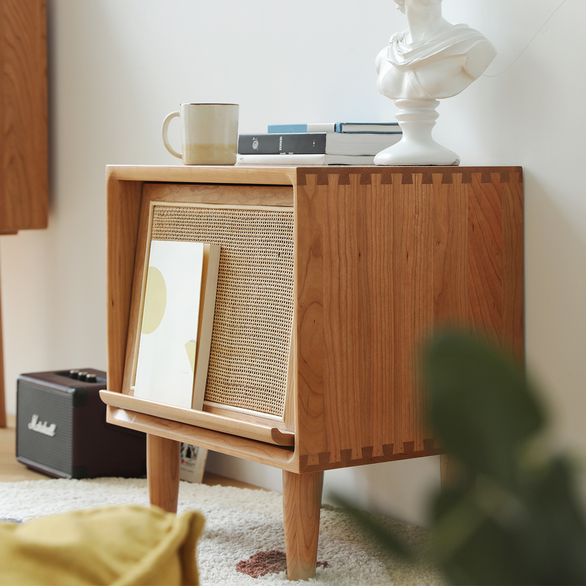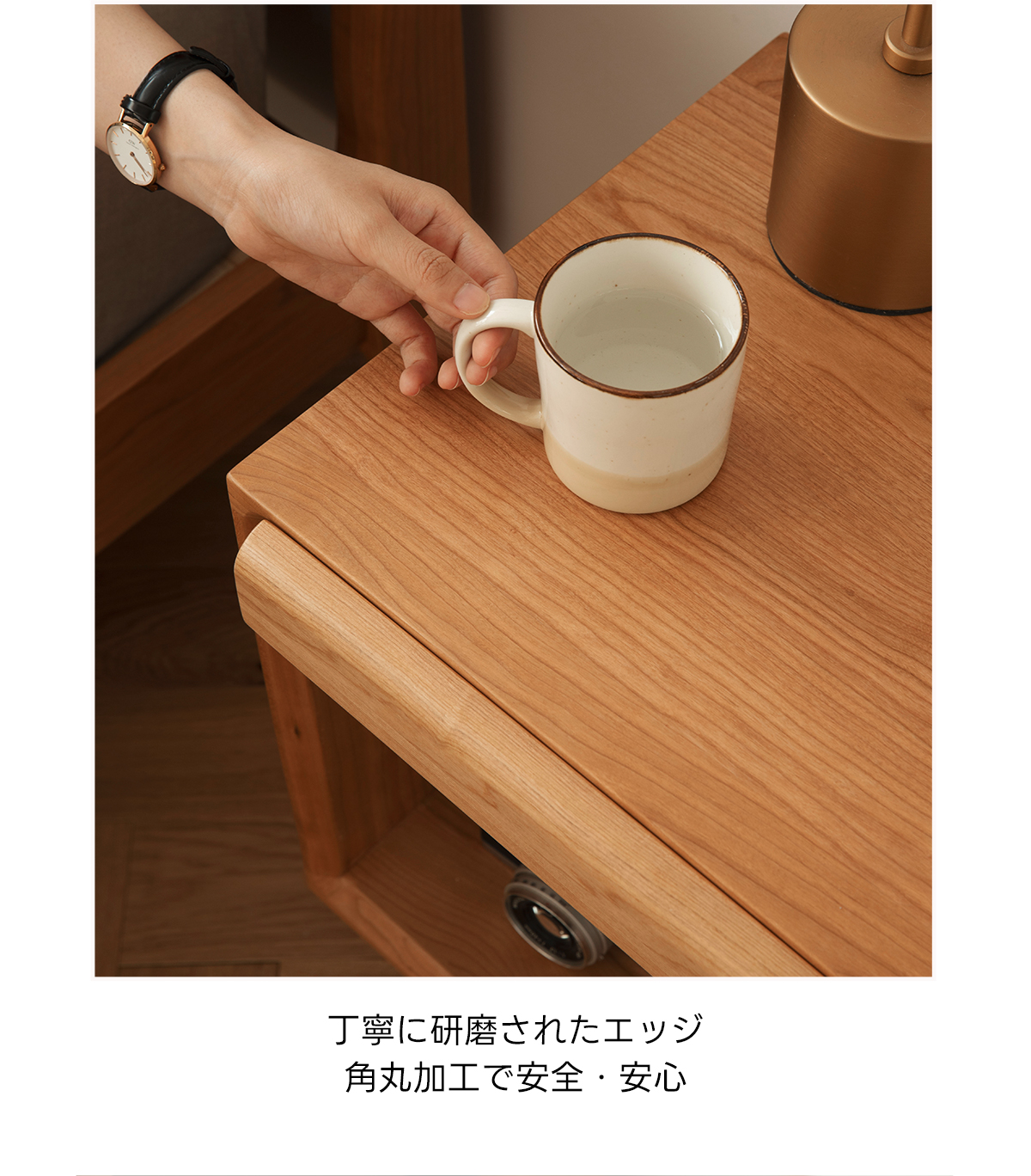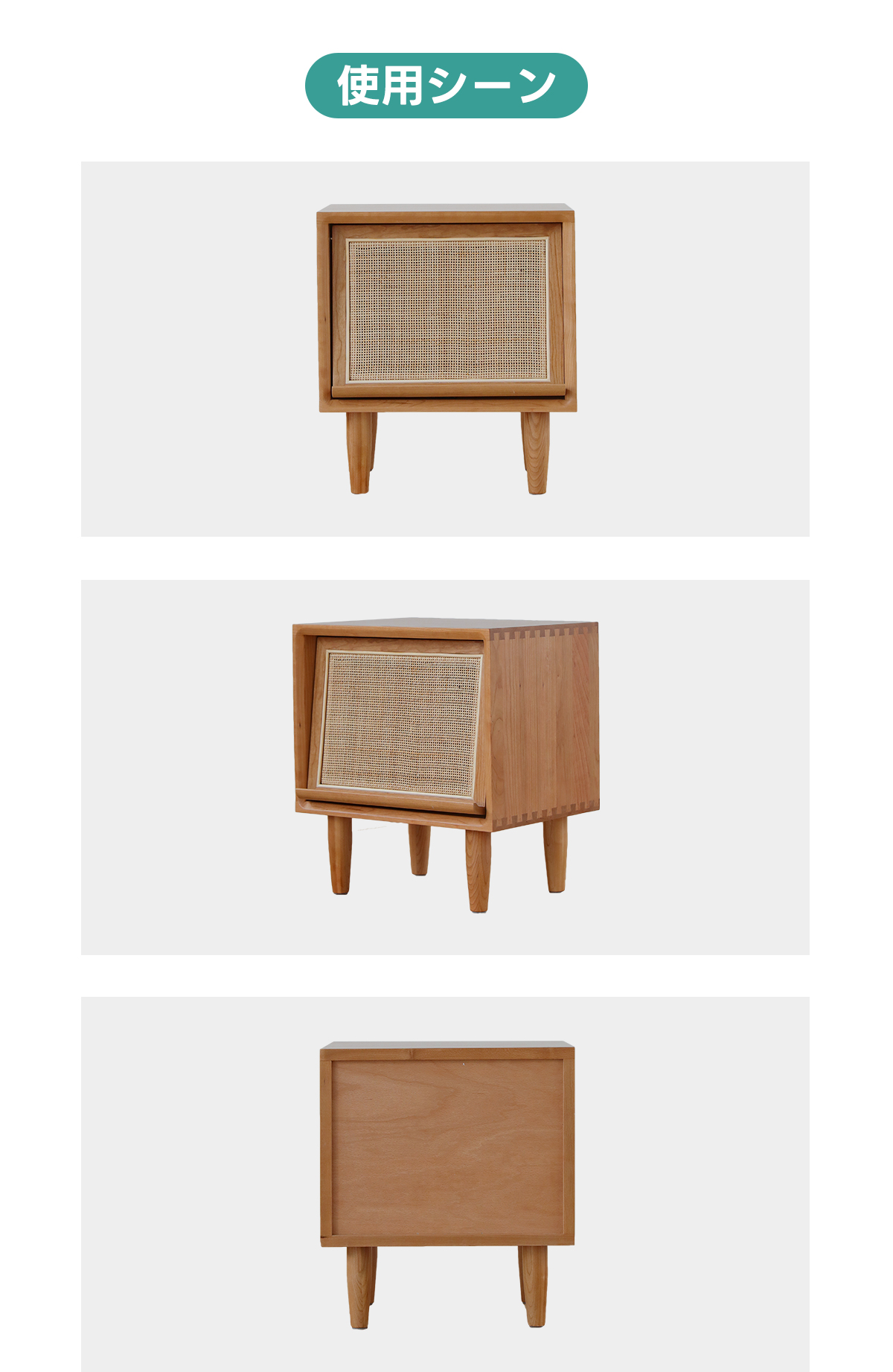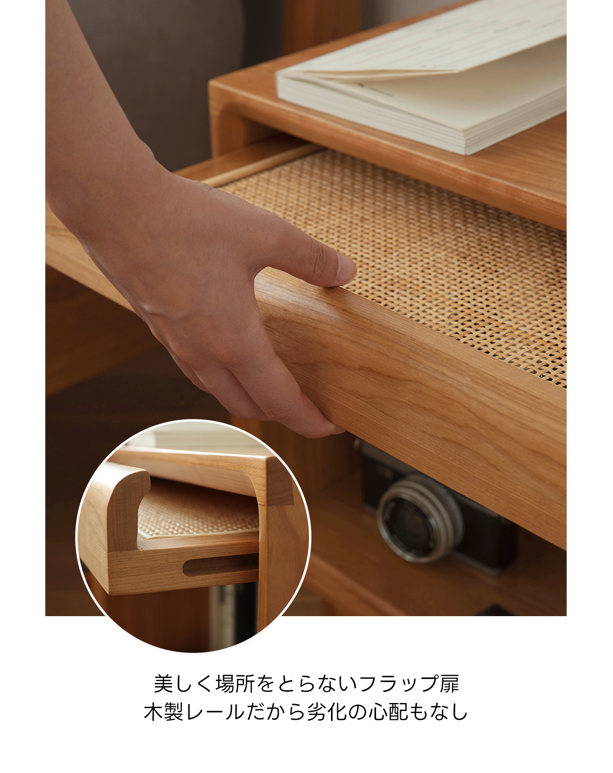 - 【高品質な素材とデザイン】FASグレードのチェリー材を使用し、ラタン調の扉がアクセントとなっています。脚付きのため掃除もしやすく、清潔に保てます。滑らかなエッジ加工が施されており、安全性も考慮されています。
