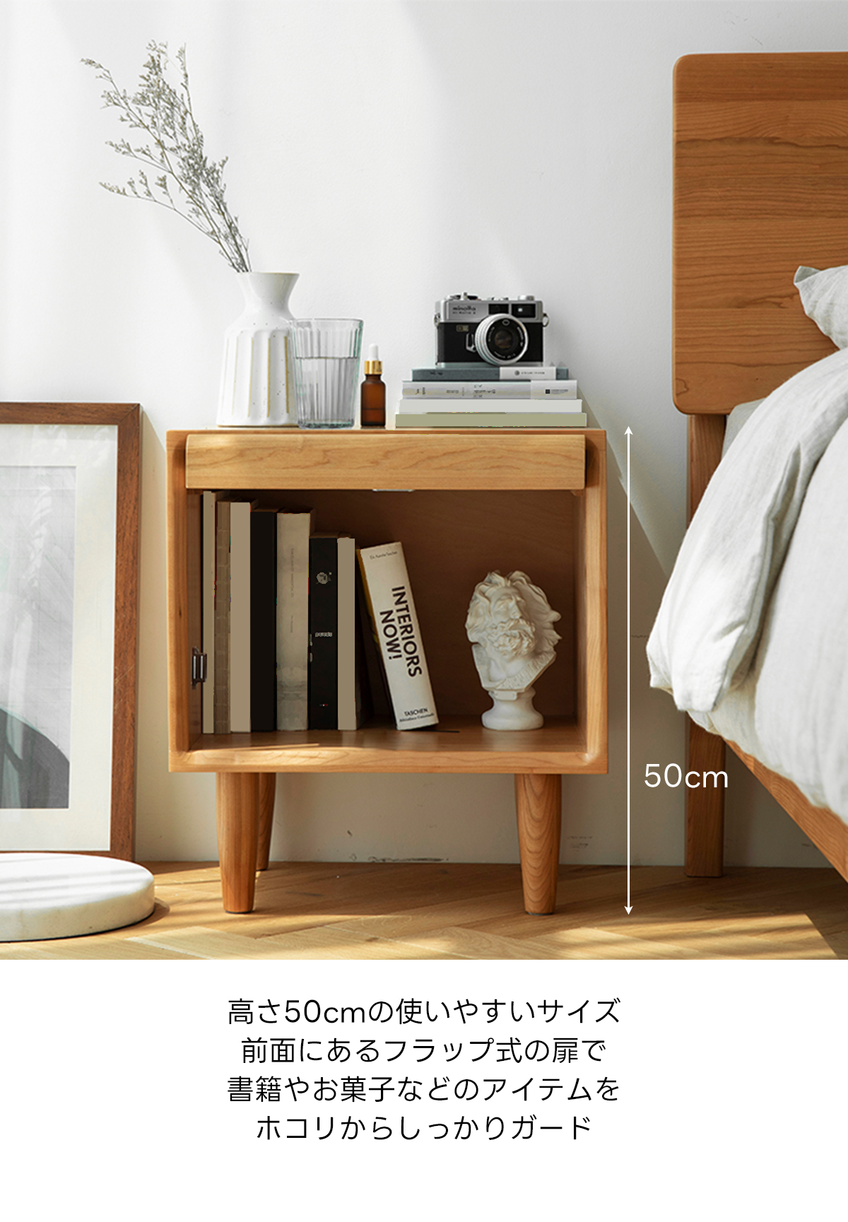 - 【優れた収納力と機能性】ナイトキャビネットは、幅45cm、奥行35cm、高さ50cmのコンパクトサイズながら、大容量の収納スペースを備えています。本や小物を整理整頓するのに最適で、ベッドサイドにぴったりのデザインです。