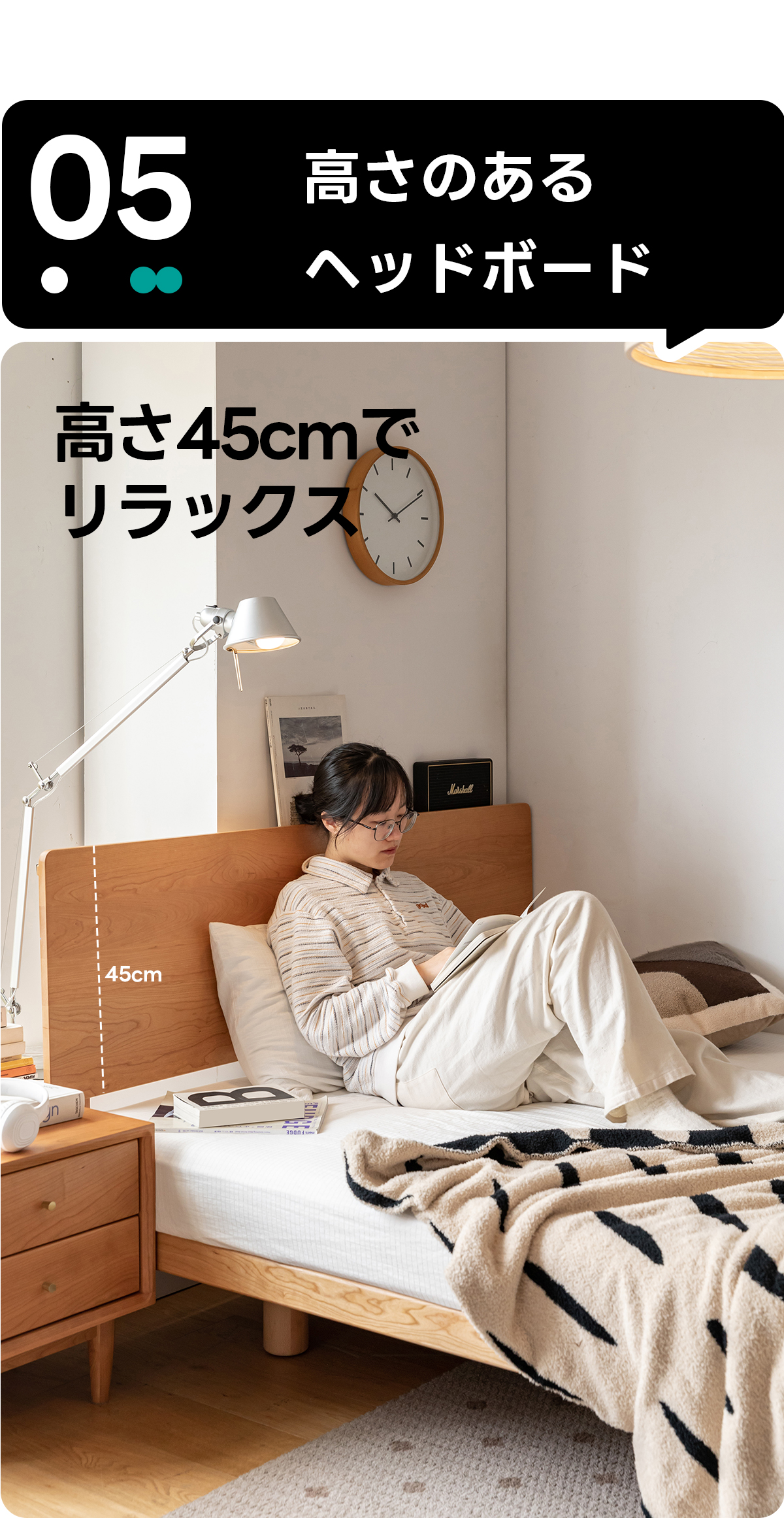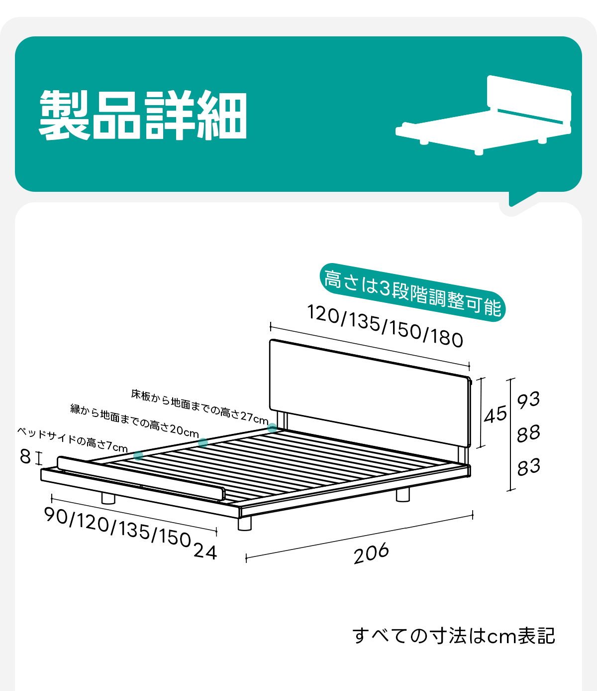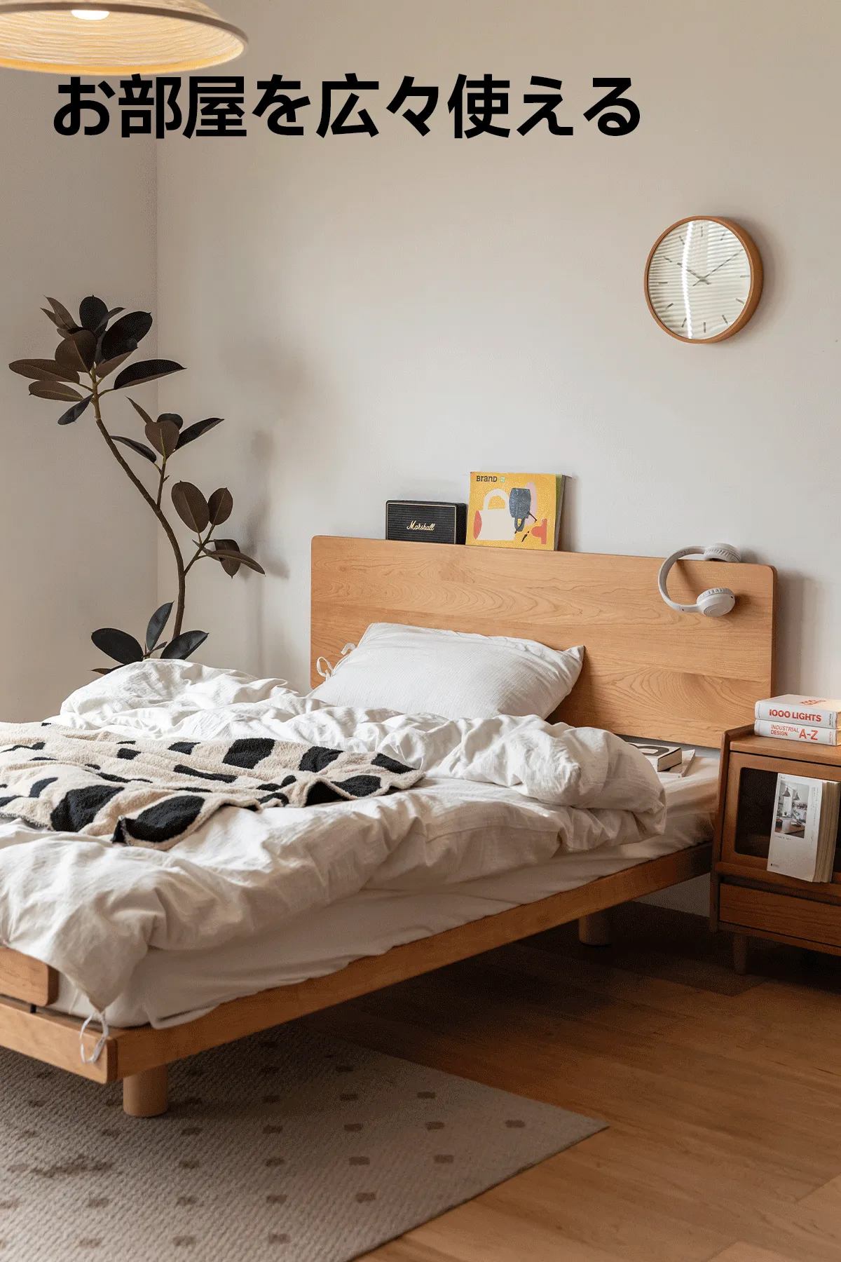 - 【組み立てやすさと収納】組立品として提供され、簡単に設置が可能です。ベッド下に20cmのスペースがあり、掃除ロボットも使用可能。さらに、ヘッドボードには5cmの収納スペースがあります。