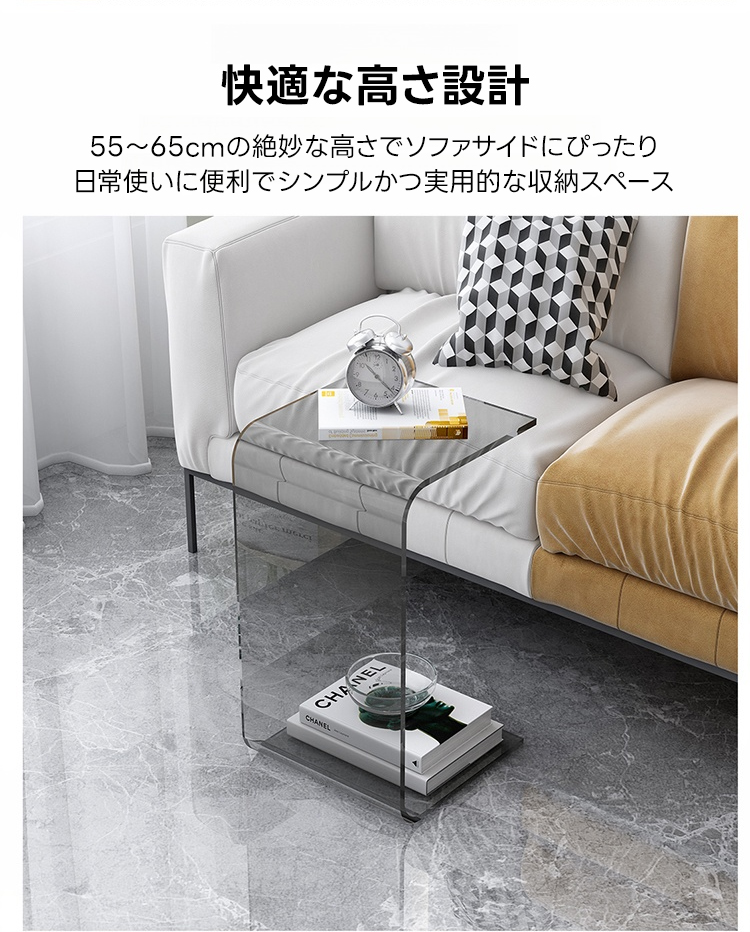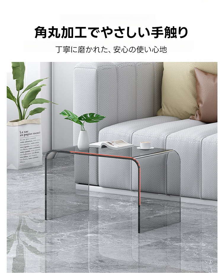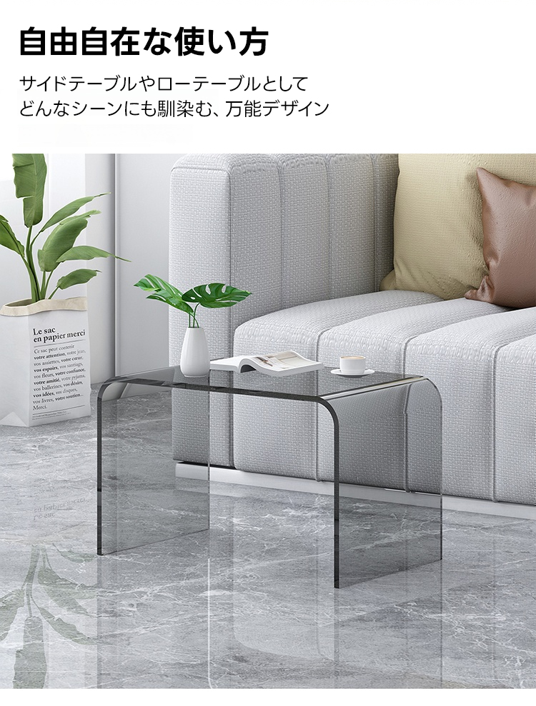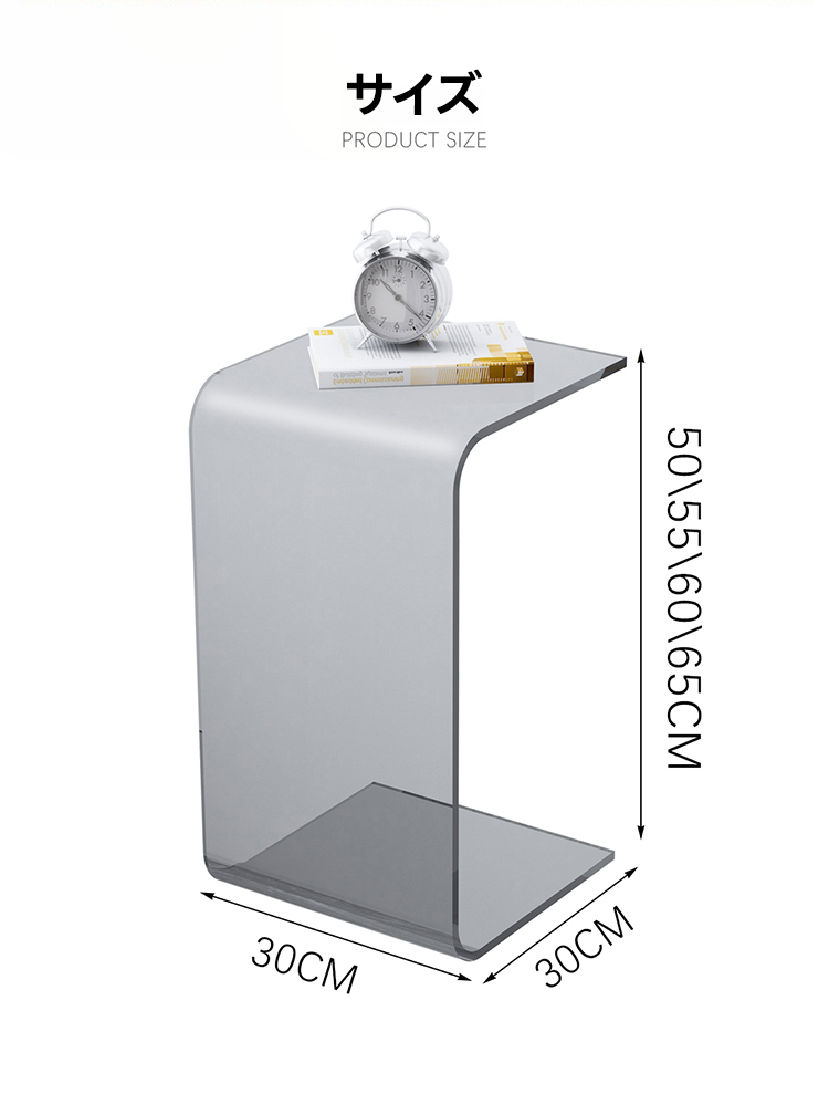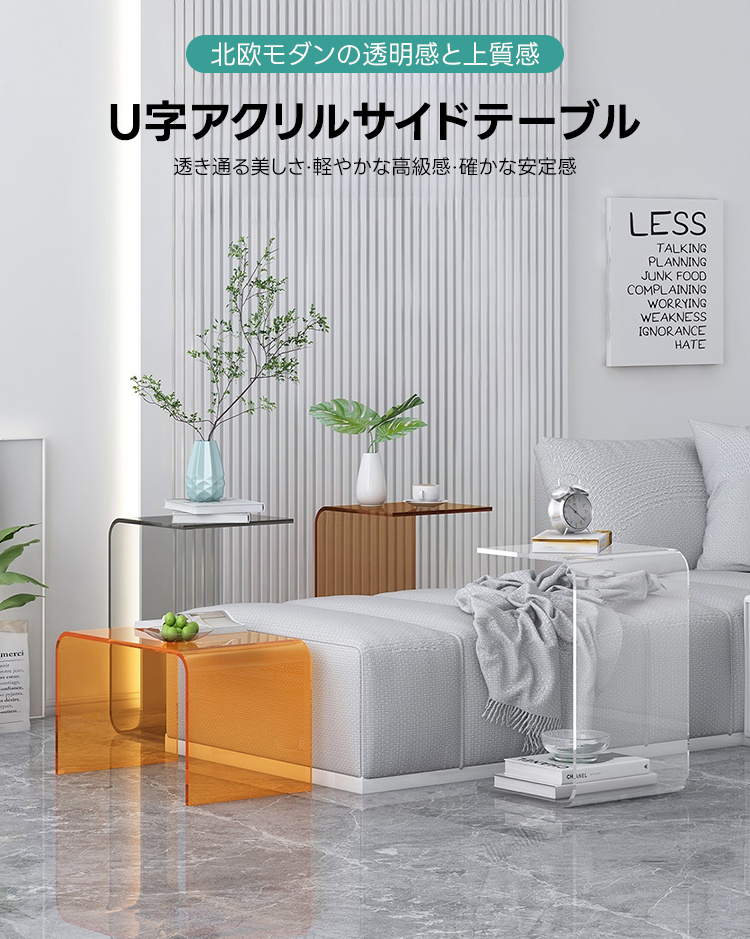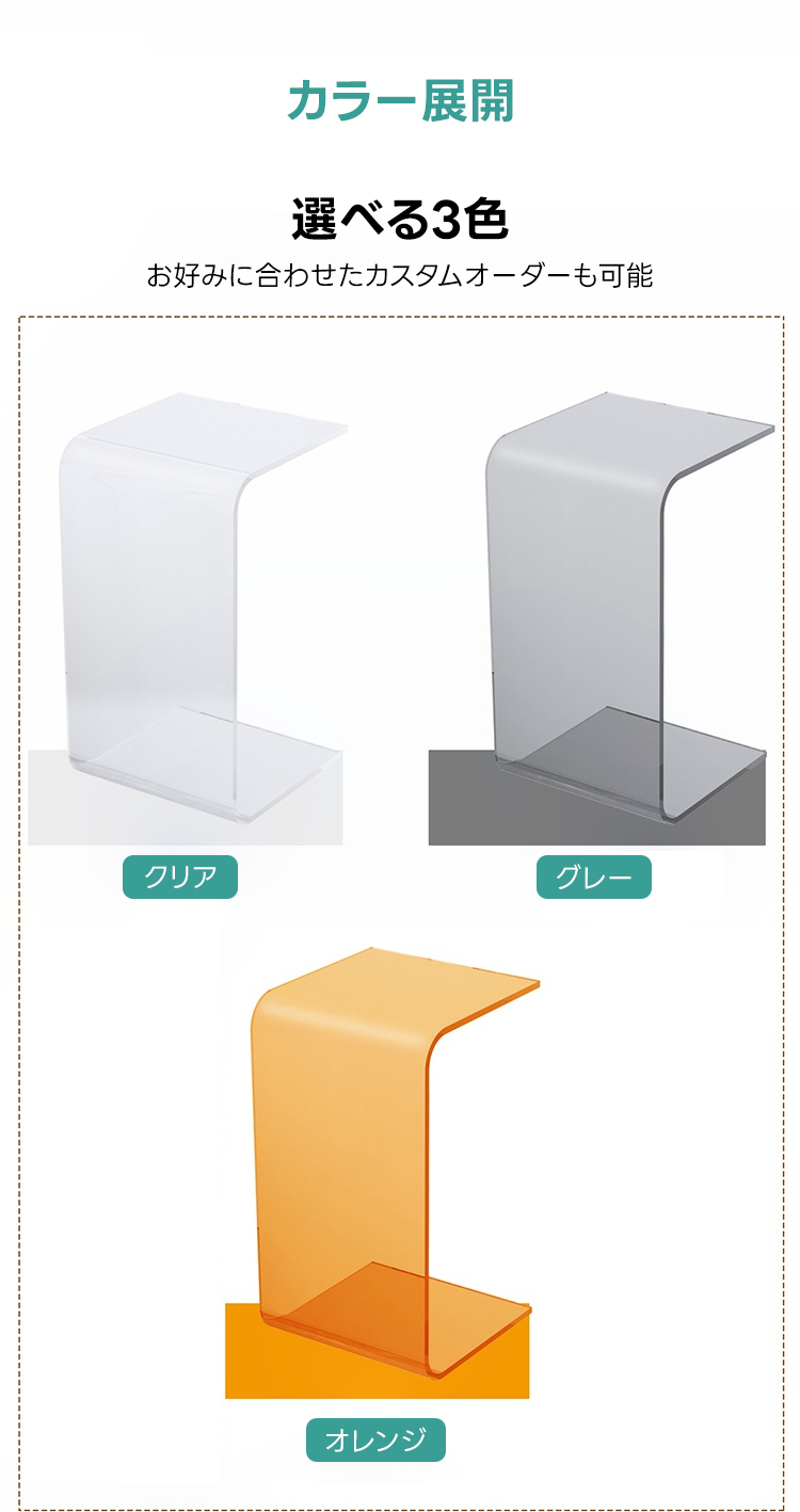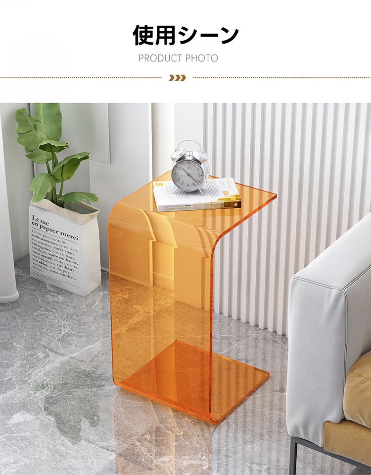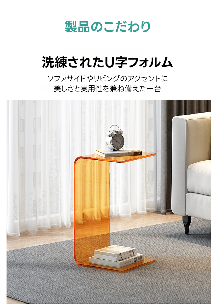 - 【多彩なカラー展開】:U字アクリルサイドテーブルはクリア、グレー、オレンジの3色展開で、お部屋の雰囲気に合わせて選べます。透明感のあるアクリル素材が、どんなインテリアにも自然に溶け込みます。