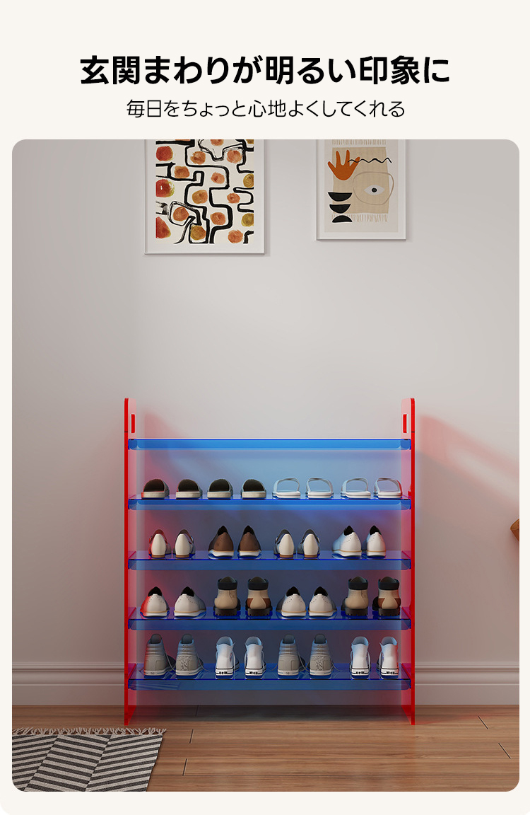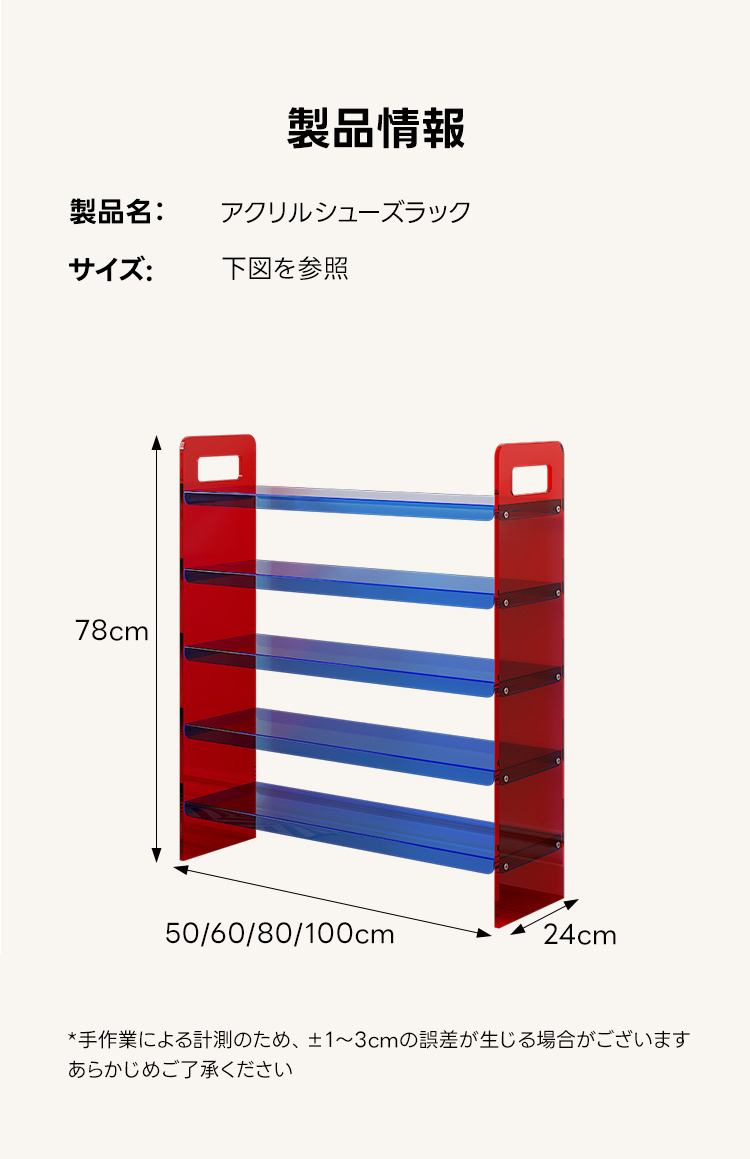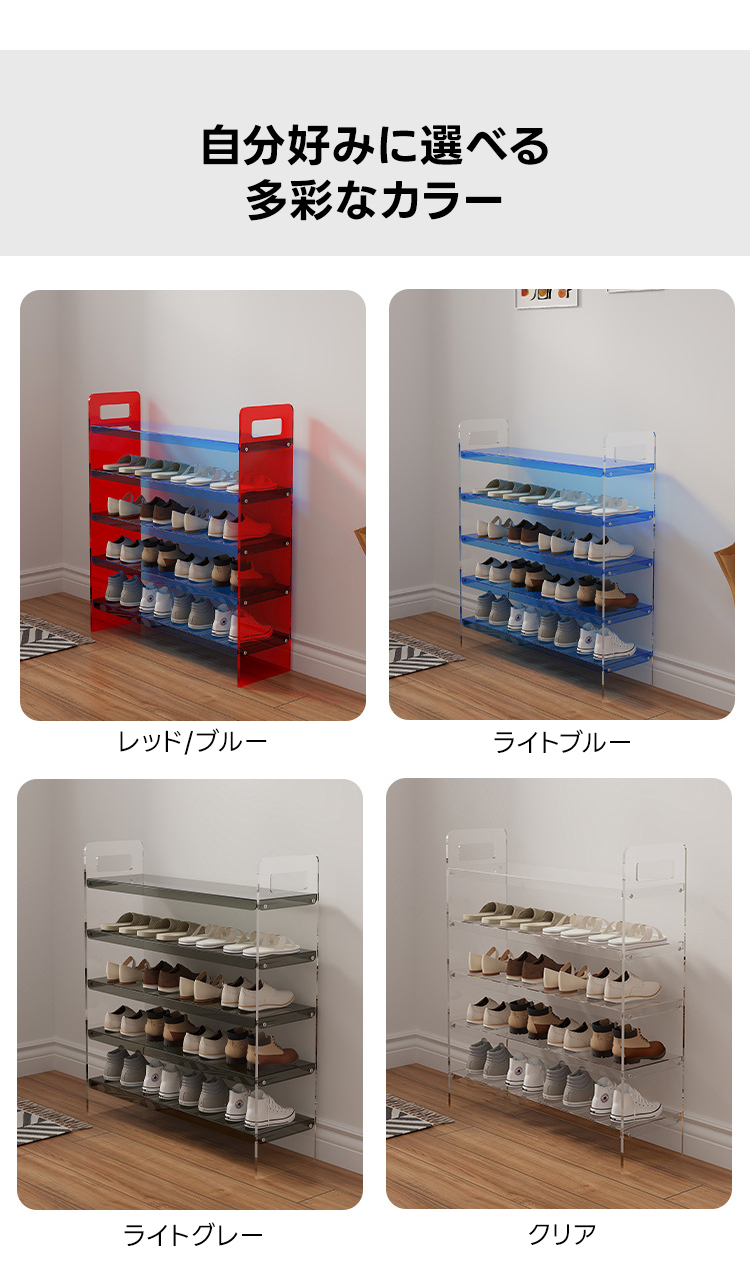 - 【多彩なカラーオプションと高耐荷重】ブルー、ライトブルー、レッド、クリア、ライトグレーの5色から選べるアクリルシューズラックは、玄関をスタイリッシュに彩ります。しっかりとした構造で多くの靴を収納でき、耐久性も抜群です。