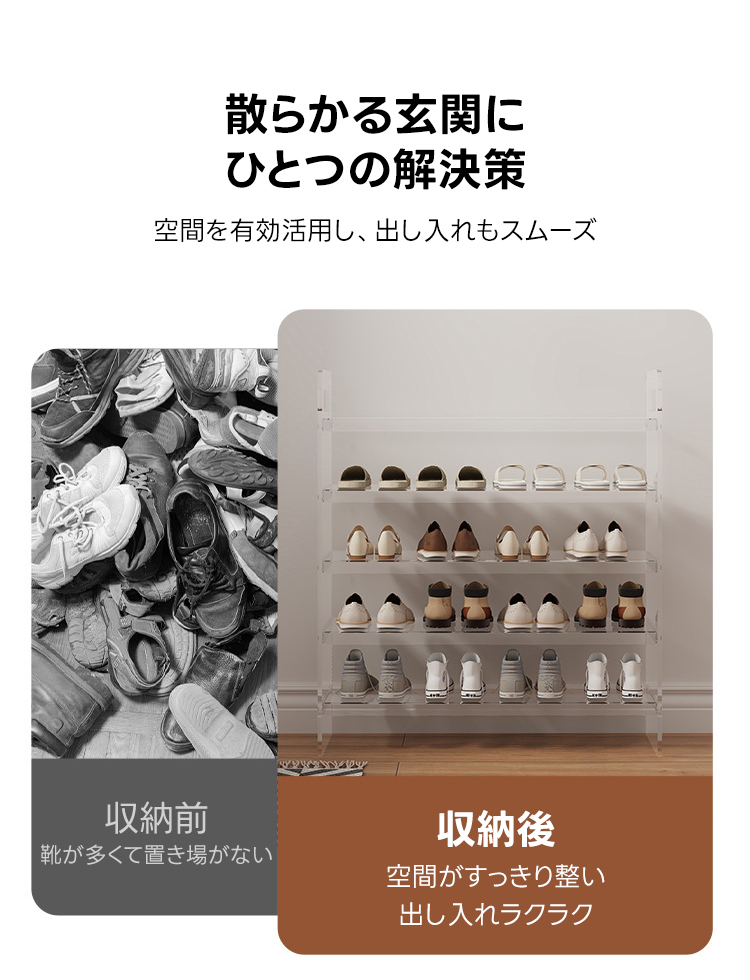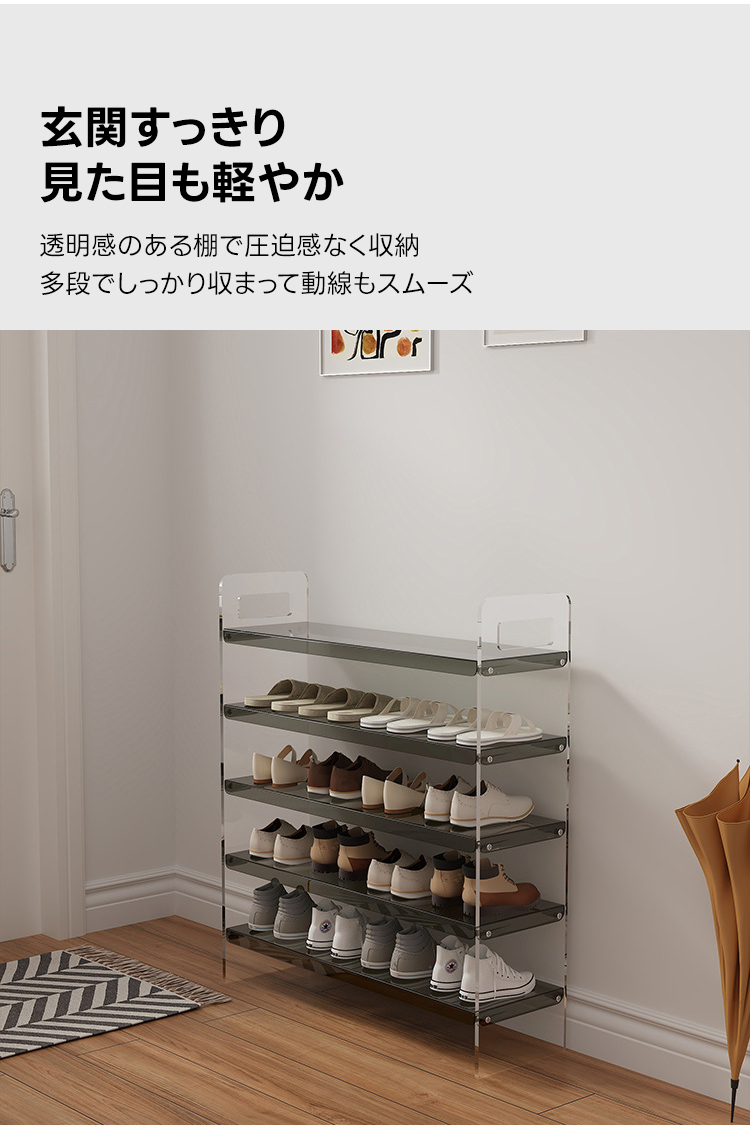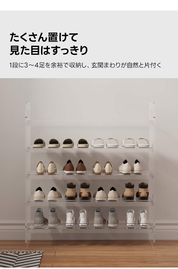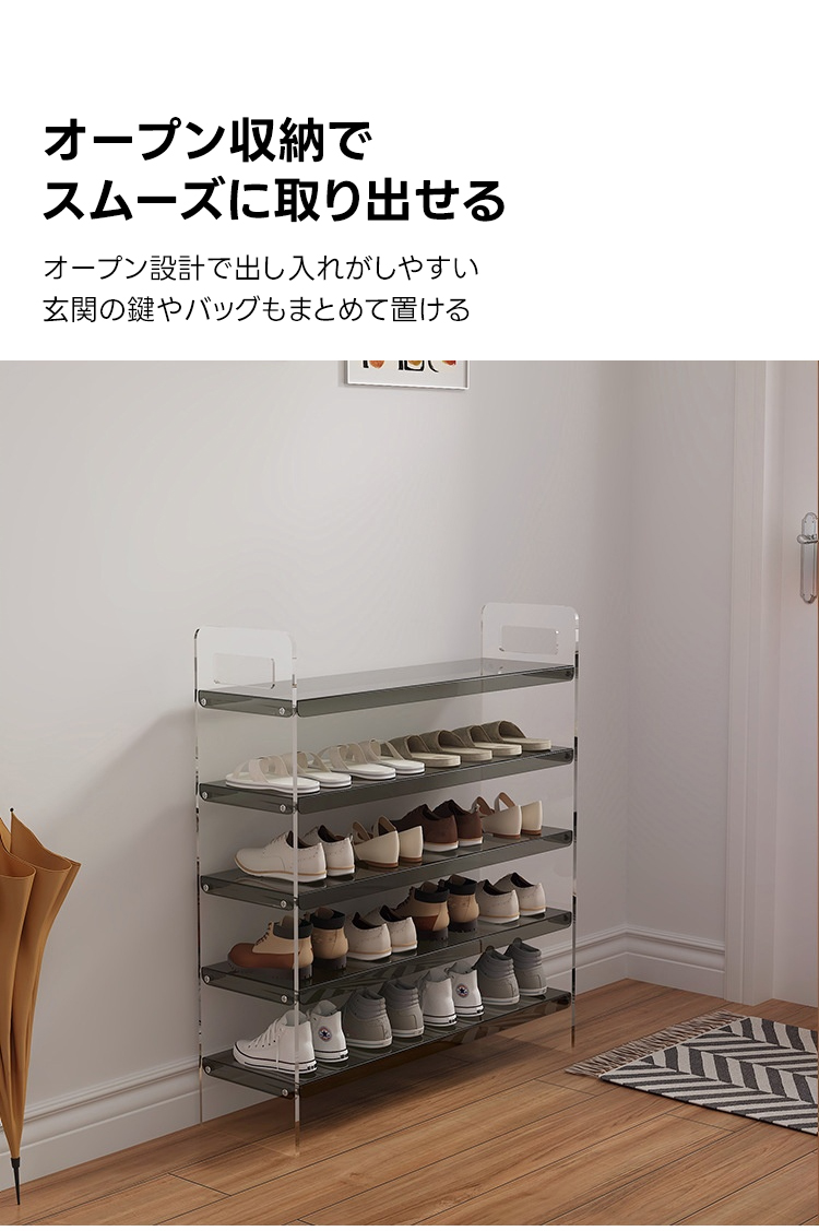 - 【透明感のあるアクリル素材とオープンデザイン】透明アクリル素材を使用し、圧迫感を与えずに収納スペースを提供。オープンデザインにより、靴の出し入れがスムーズで日常の使用が快適です。