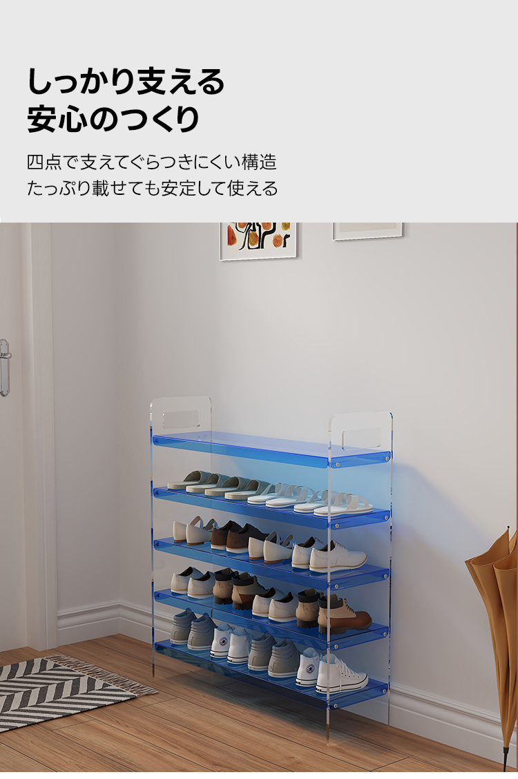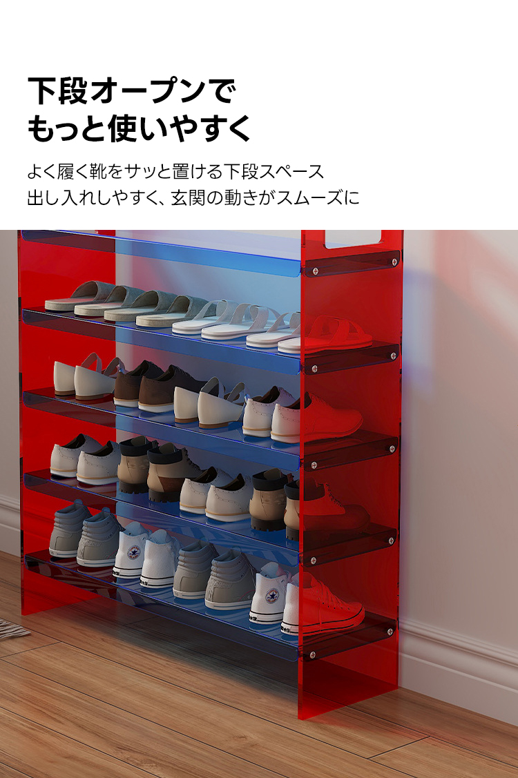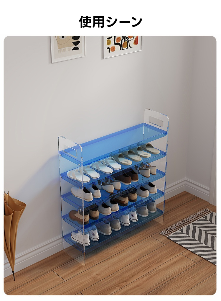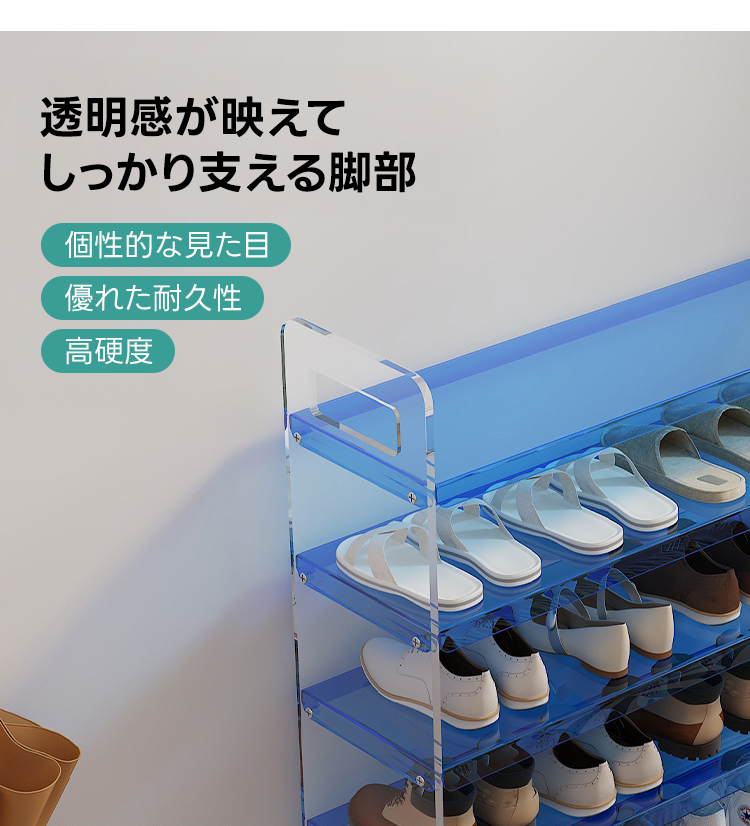 - 【透明感のあるアクリル素材とオープンデザイン】透明アクリル素材を使用し、圧迫感を与えずに収納スペースを提供。オープンデザインにより、靴の出し入れがスムーズで日常の使用が快適です。