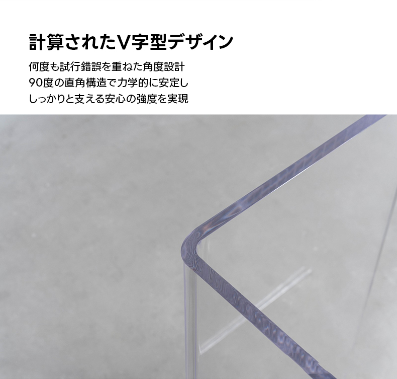 - 【高品質な素材と構造】高透明アクリルを採用し、上品さと耐久性を両立。大型天板をしっかりと支える安定感があります。90度の直角構造で力学的に安定し、安心感のある強度を実現。角部分は丁寧に研磨され、優しい触り心地を提供します。