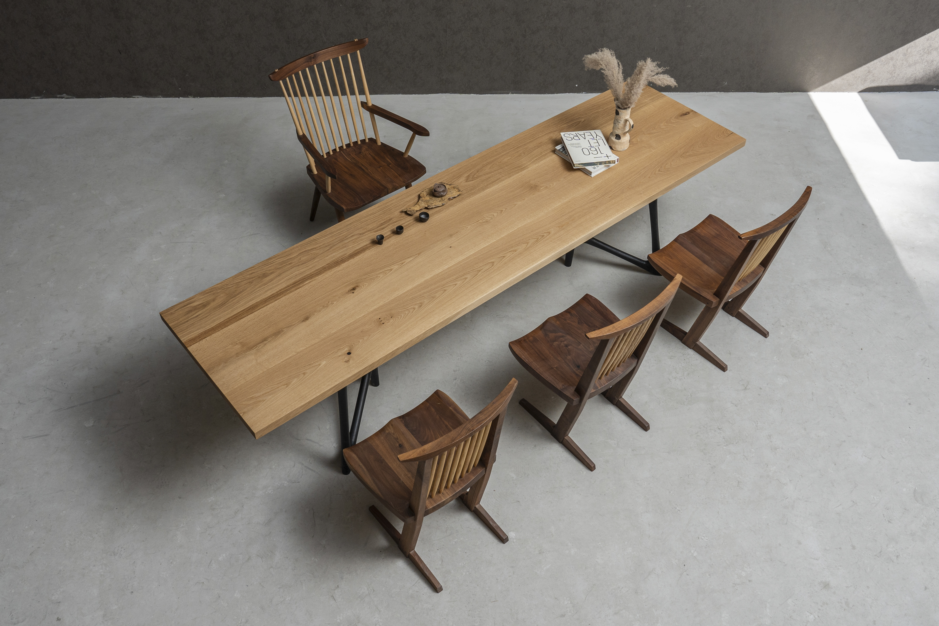 - 【厳選された高品質素材】100年以上の樹齢を持つホワイトオークを使用し、職人が丁寧に仕上げた高品質なテーブルです。割れや傷が少ない良質の荒板のみを使用し、滑らかな手触りと自然な木肌感を実現しています。