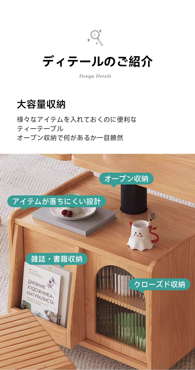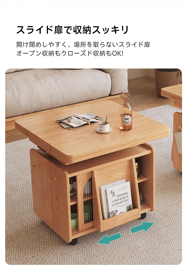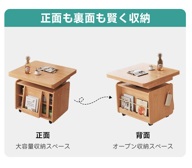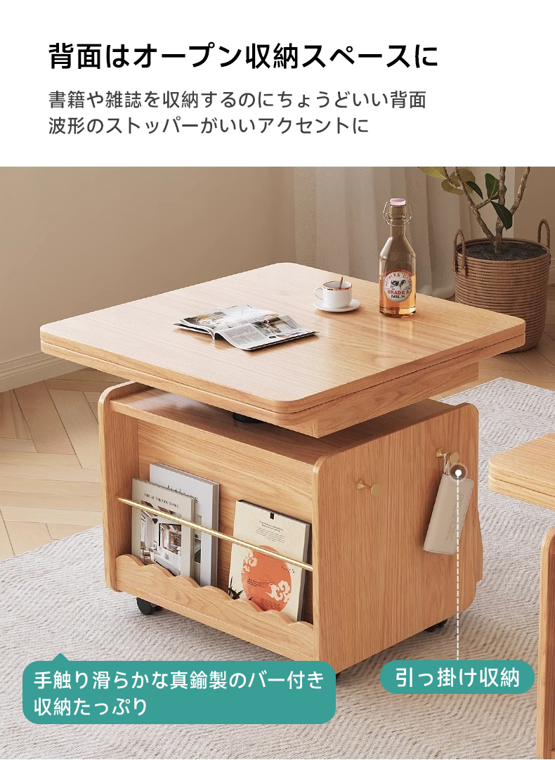 • 【適用シーンと利便性】このティーテーブルは、リビングやダイニングにぴったりの機能性を提供し、カップルやファミリー、一人暮らしの方にもおすすめです。キャスター付きで部屋の中を簡単に移動可能なので、模様替えや掃除の際にも便利です。