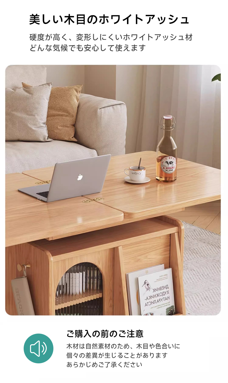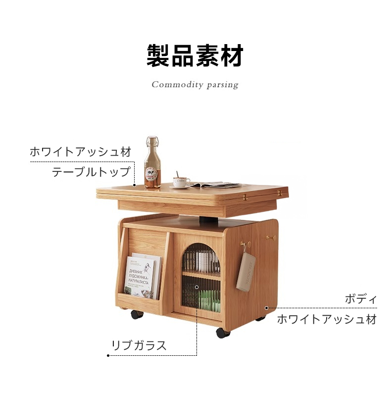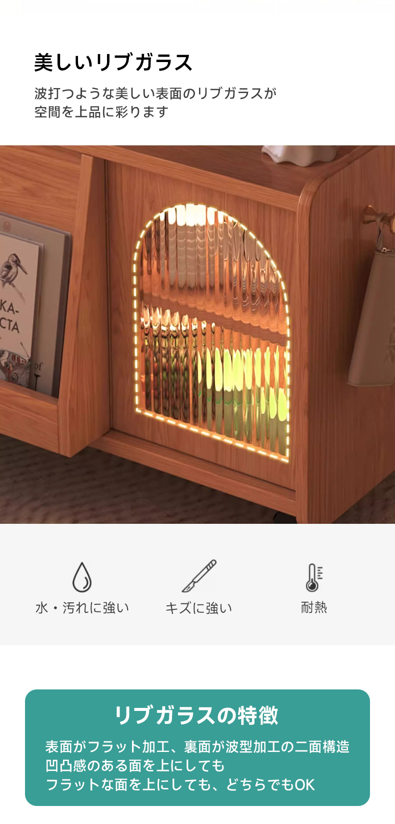 • 【高品質な材料とデザイン】ナチュラルな木目調のホワイトアッシュ材を使用し、リブガラスがどんなインテリアにも自然に溶け込みます。ホワイトアッシュ材は硬度が高く、変形しにくい特性があり、リブガラスは水や汚れ、傷に強く、耐熱性も兼ね備えています。