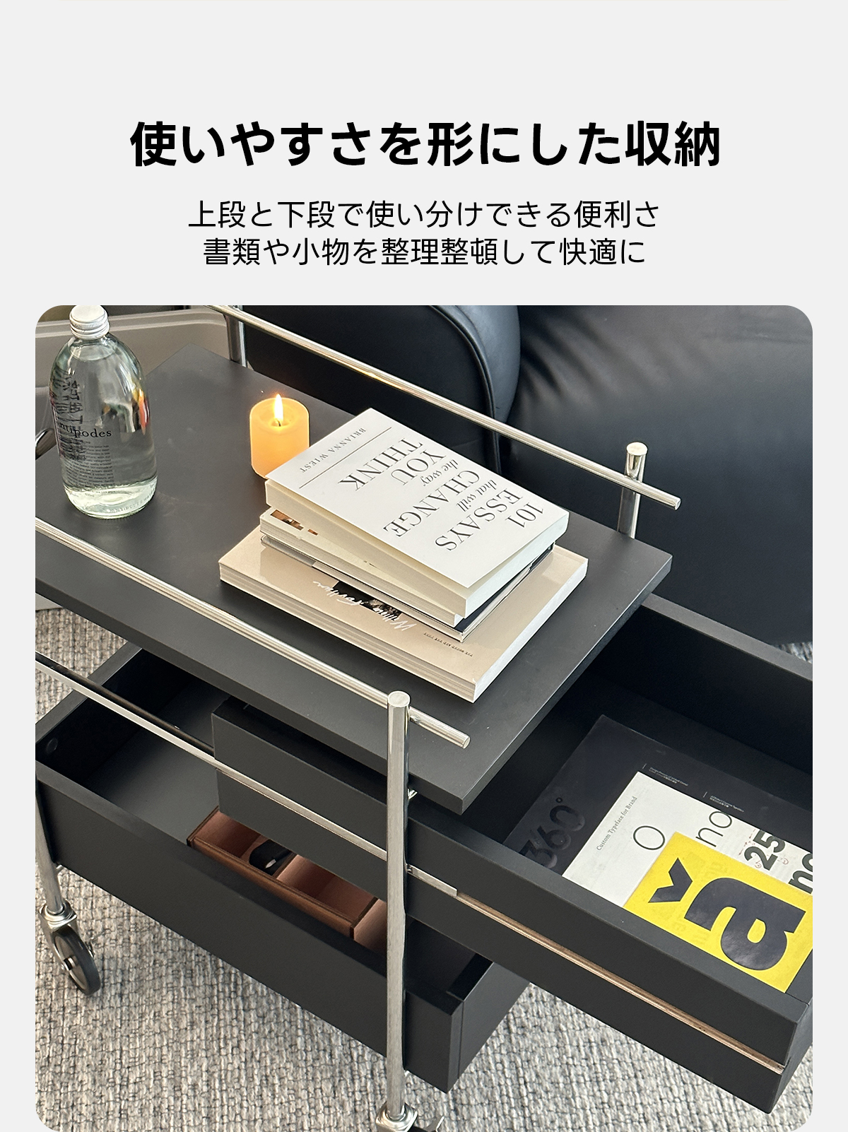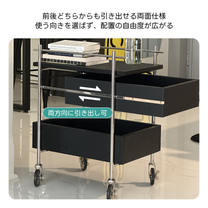 - 【多機能収納スペース】:インダストリアルサイドテーブルは、上段と下段で使い分けが可能な収納スペースを提供し、書類や小物を整理整頓できます。両方向に引き出せる仕様で、配置の自由度が高く、利便性が向上しています。