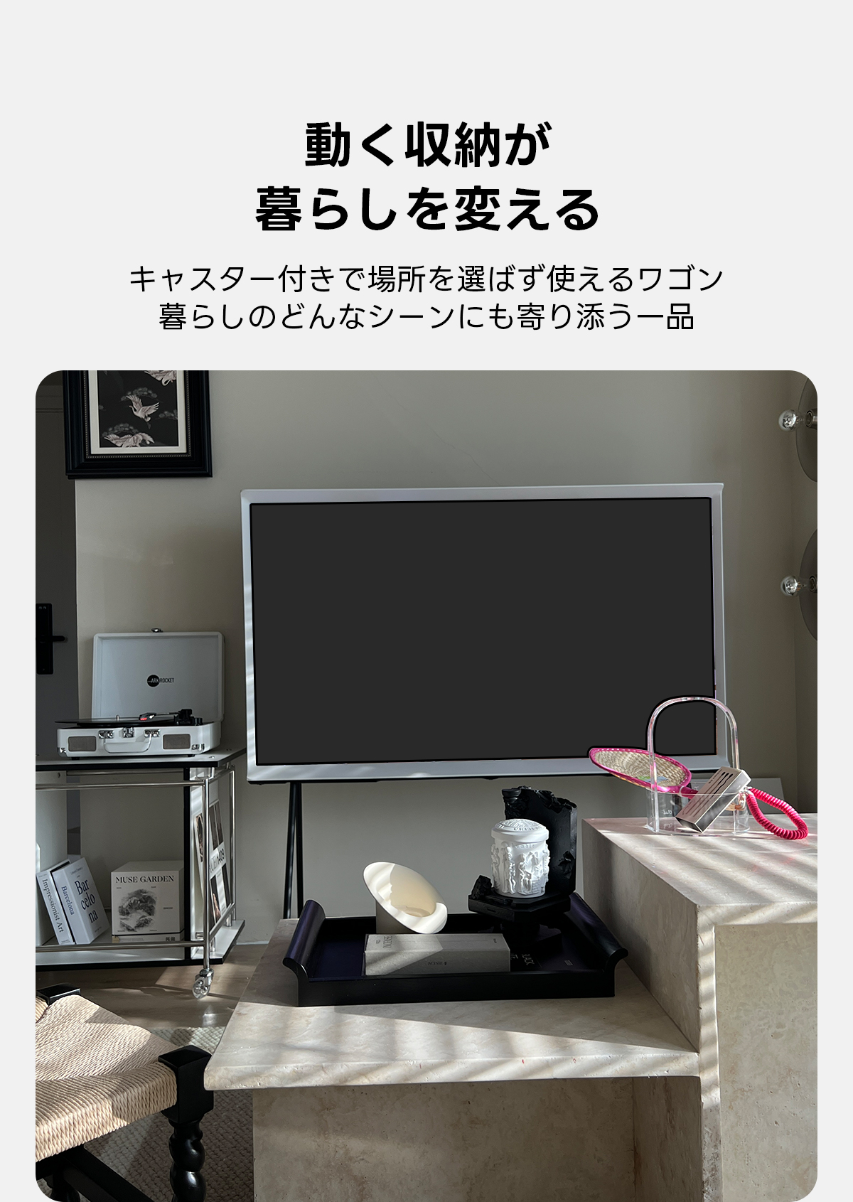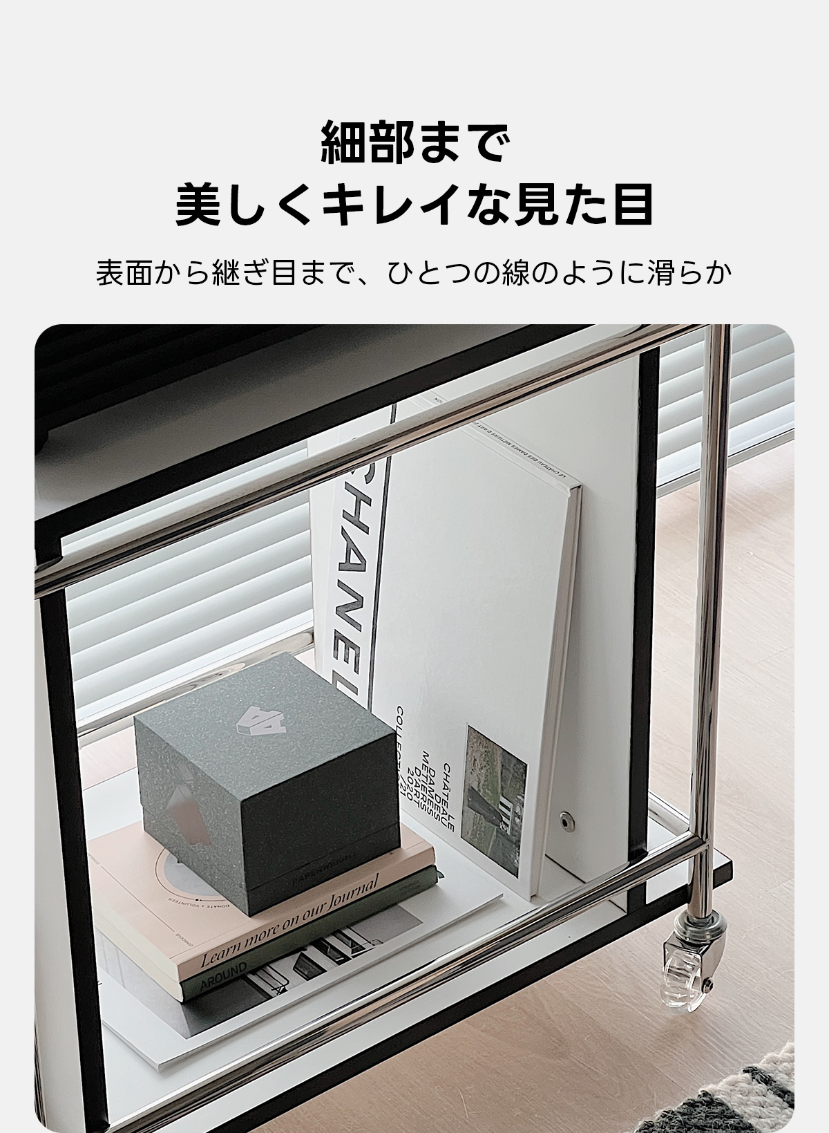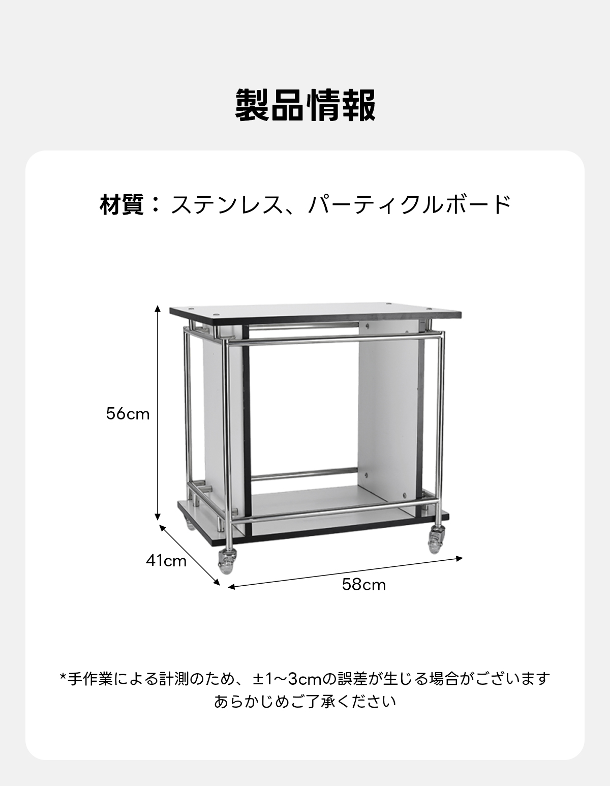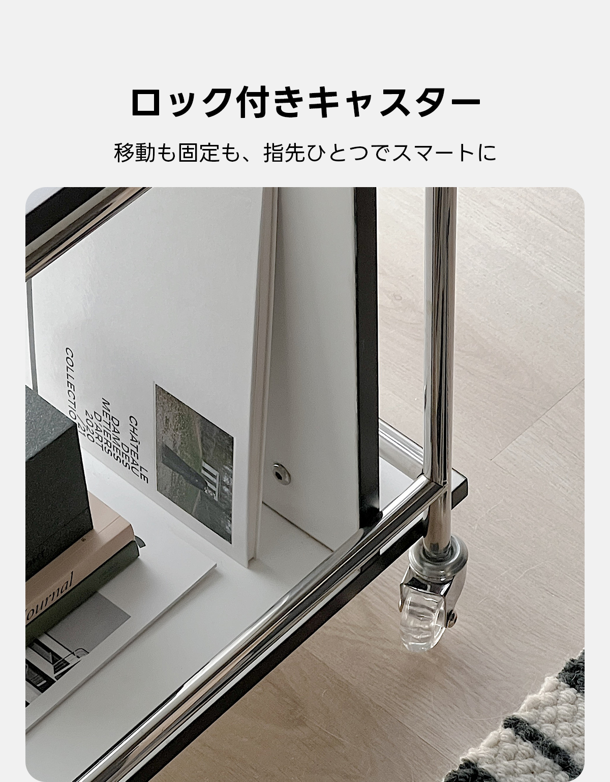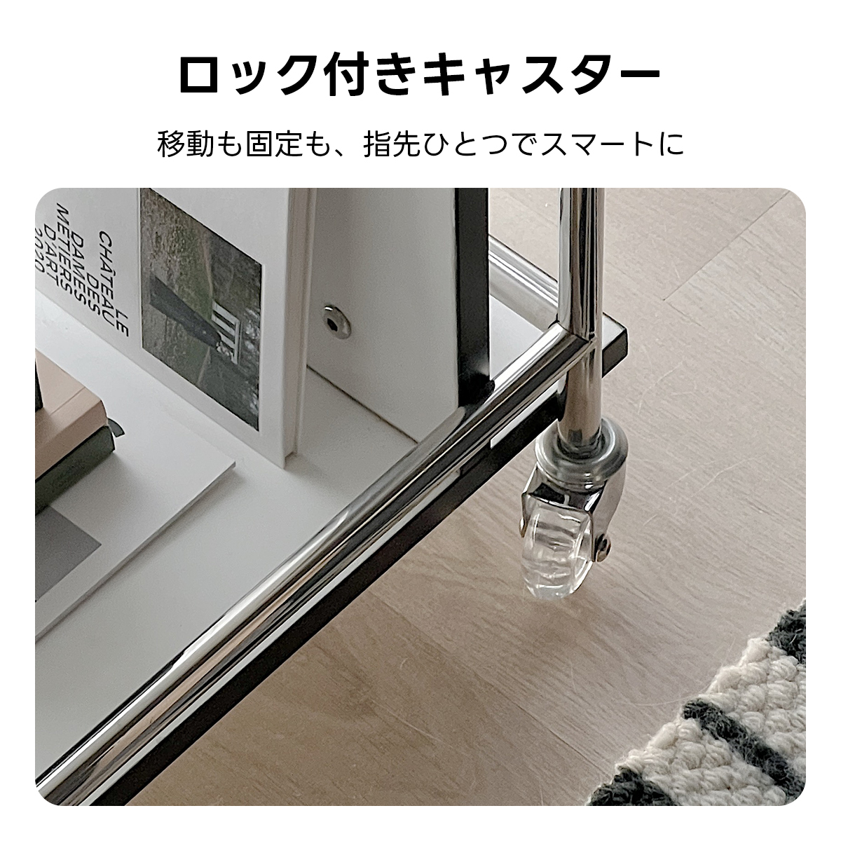 - 【移動が簡単なキャスターワゴン】:キャスター付きで移動が簡単に行えます。ロック機能も備えており、必要な場所でしっかり固定できます。リビング、キッチン、オフィスなど、様々な場所で活用可能です。