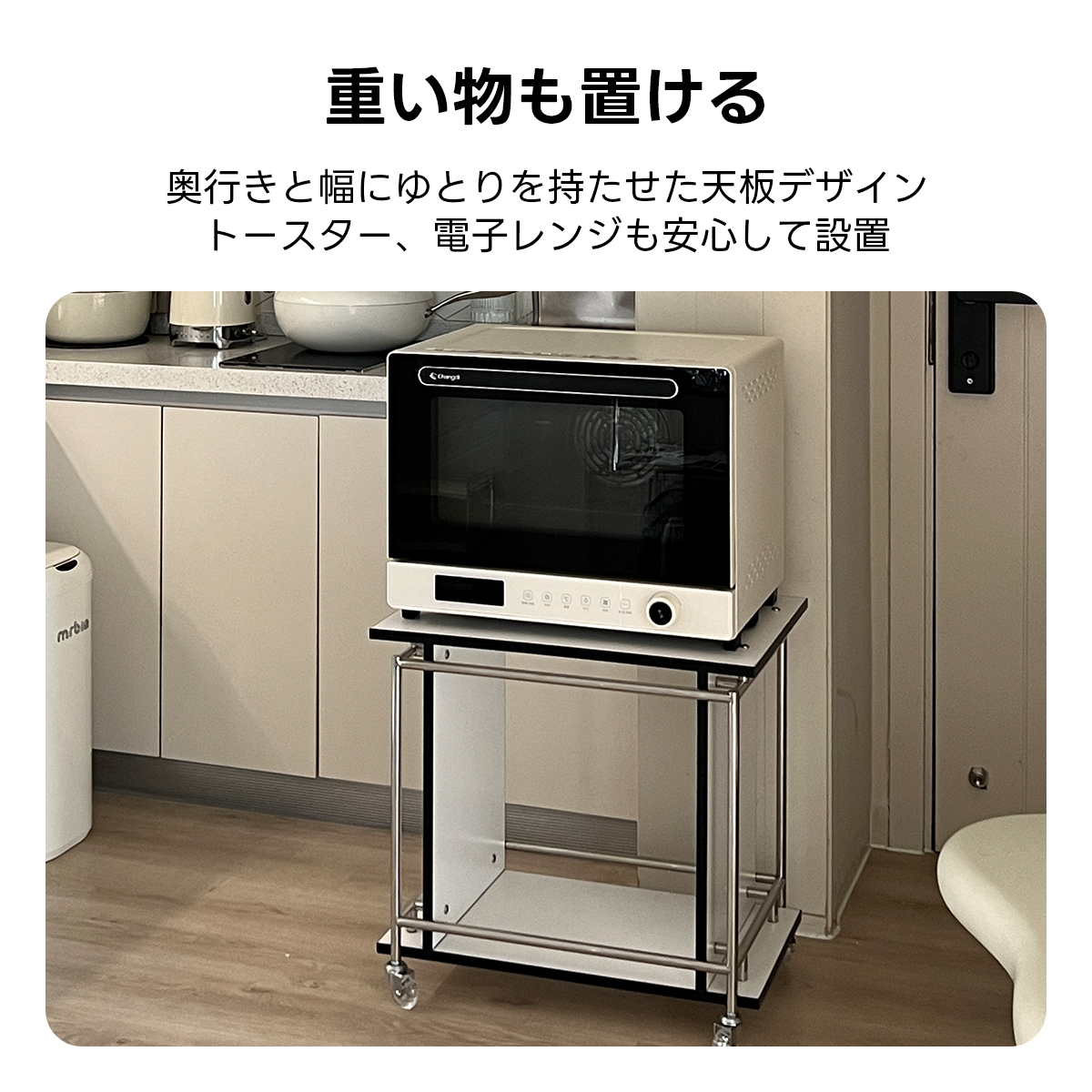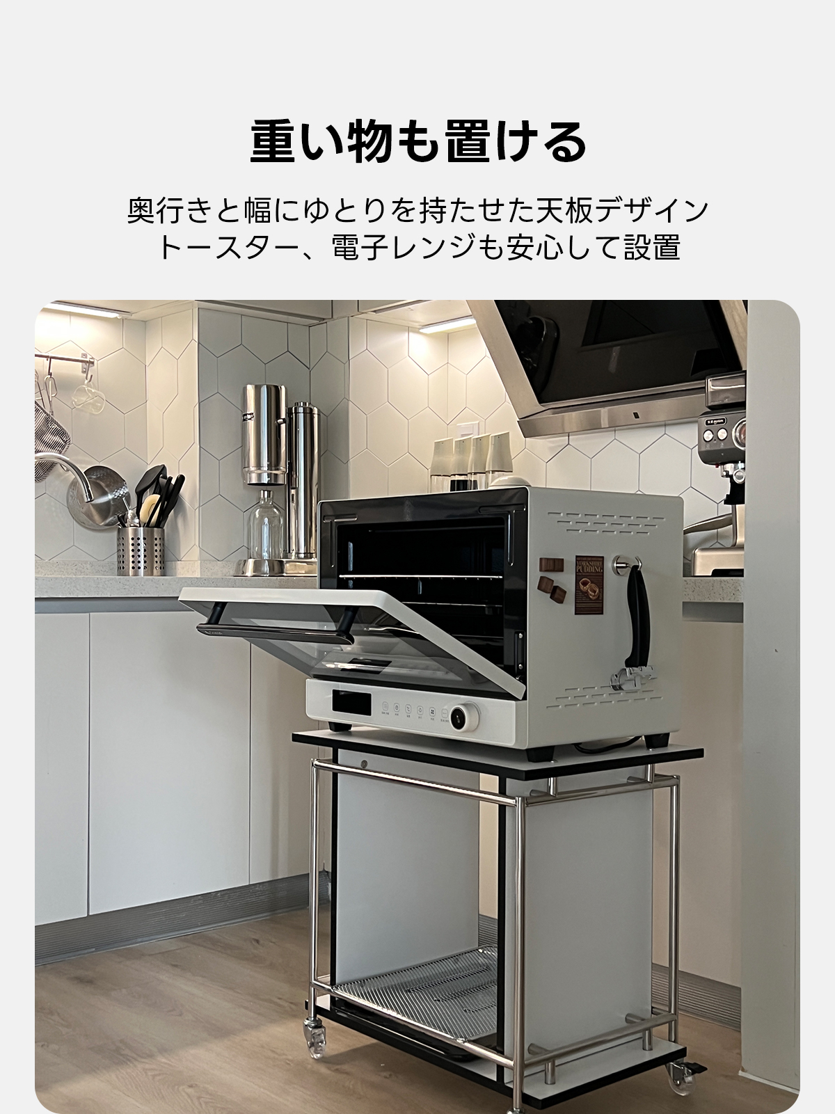 - 【多用途な使用】:このワゴンは、リビングルームだけでなく、キッチンやオフィスでも活用可能です。重い物も安心して置ける設計で、トースターや電子レンジなどの家電も問題なく設置できます。
