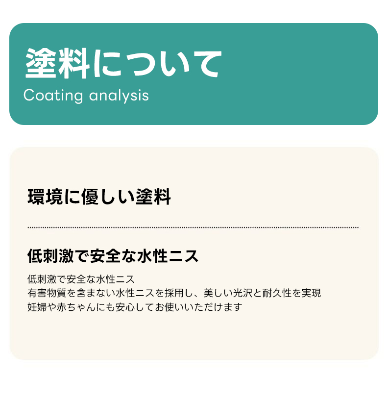 - 【環境に優しい塗料】低刺激で安全な水性ニスを使用しており、安心してお使いいただけます。環境に配慮した製品で、健康的な生活空間を提供します。