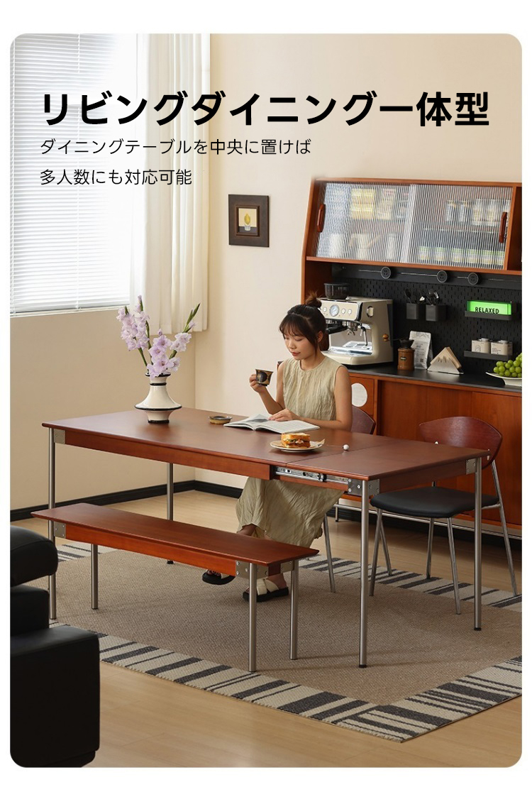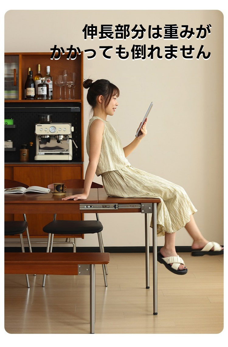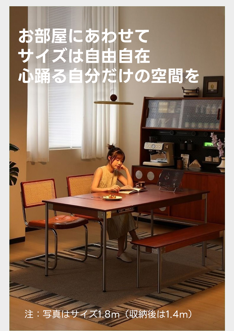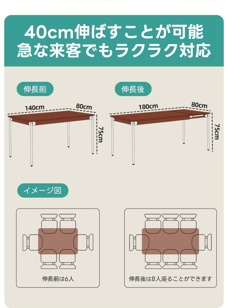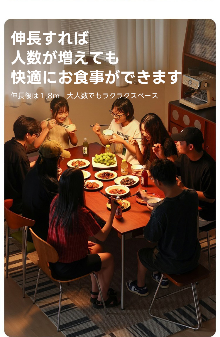 - 【伸縮自在で多様なシーンに対応】このダイニングテーブルは140cmから180cmまで伸縮可能で、急な来客にも対応します。普段はコンパクトに収納でき、必要に応じて広げることができます。これにより、スペースを有効活用し、さまざまなシーンで活躍します。