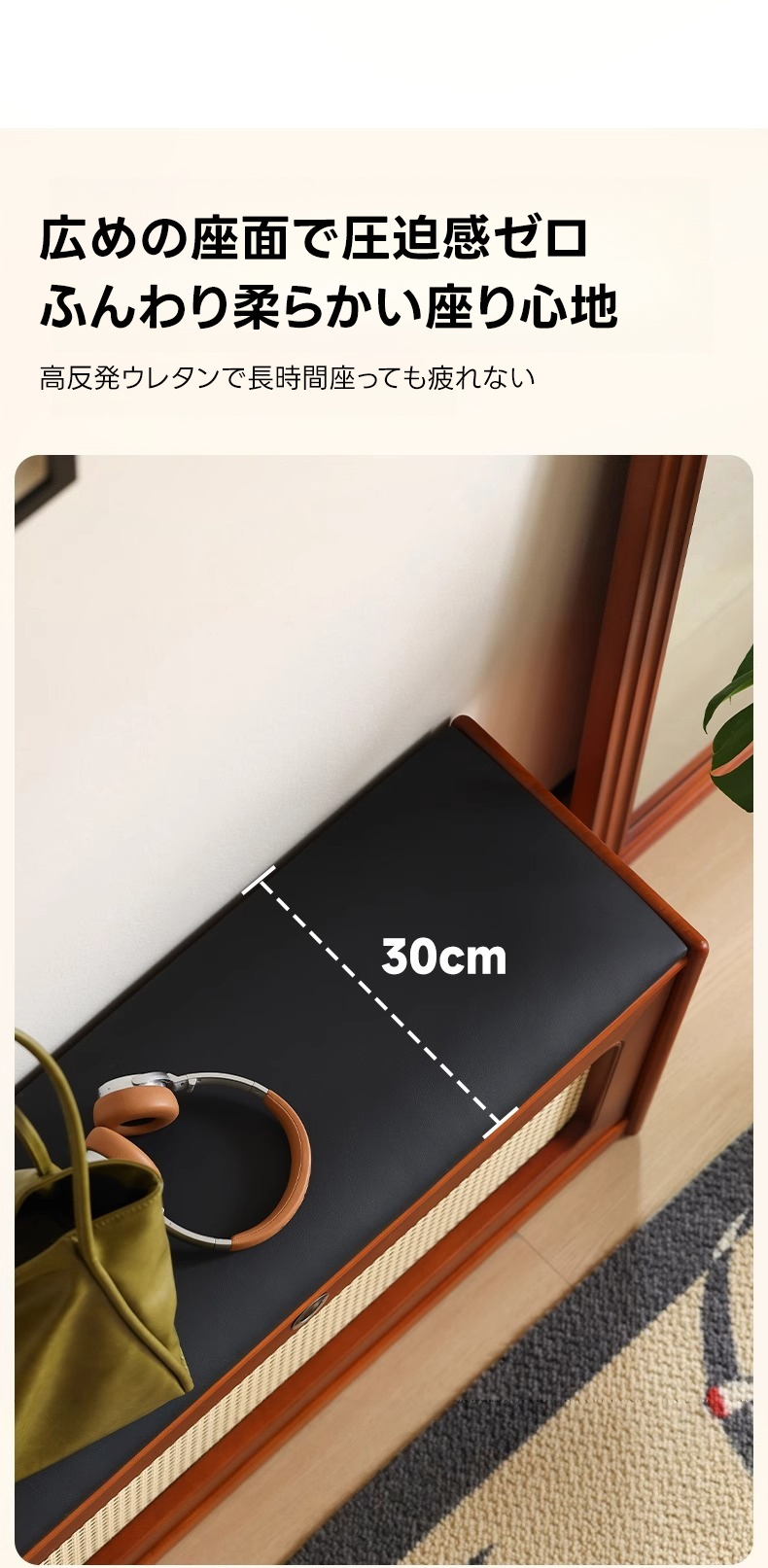 - 【快適な座り心地】座面には高反発ウレタンを使用し、長時間座っても疲れにくい設計です。幅広の座面で圧迫感がなく、靴の着脱も楽に行えます。ベンチとしても使用できる多機能デザインです。