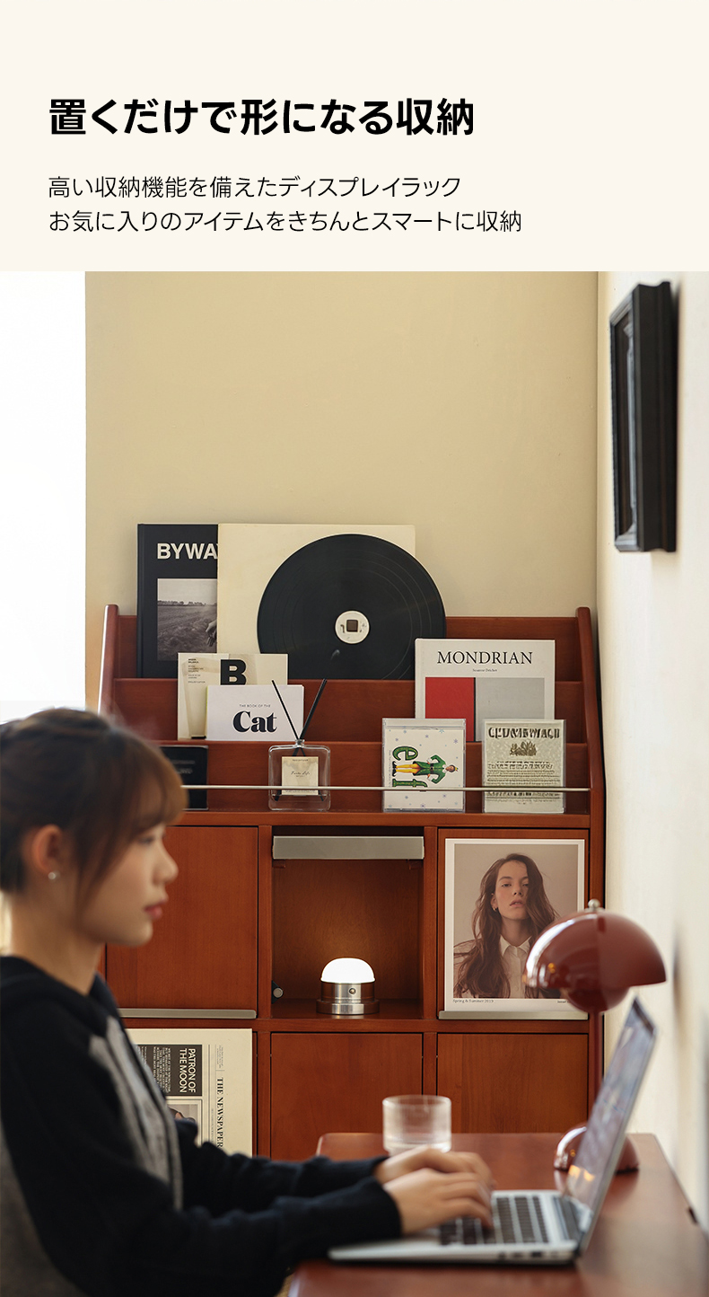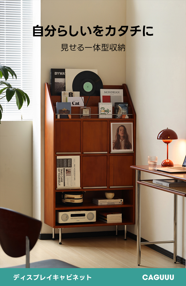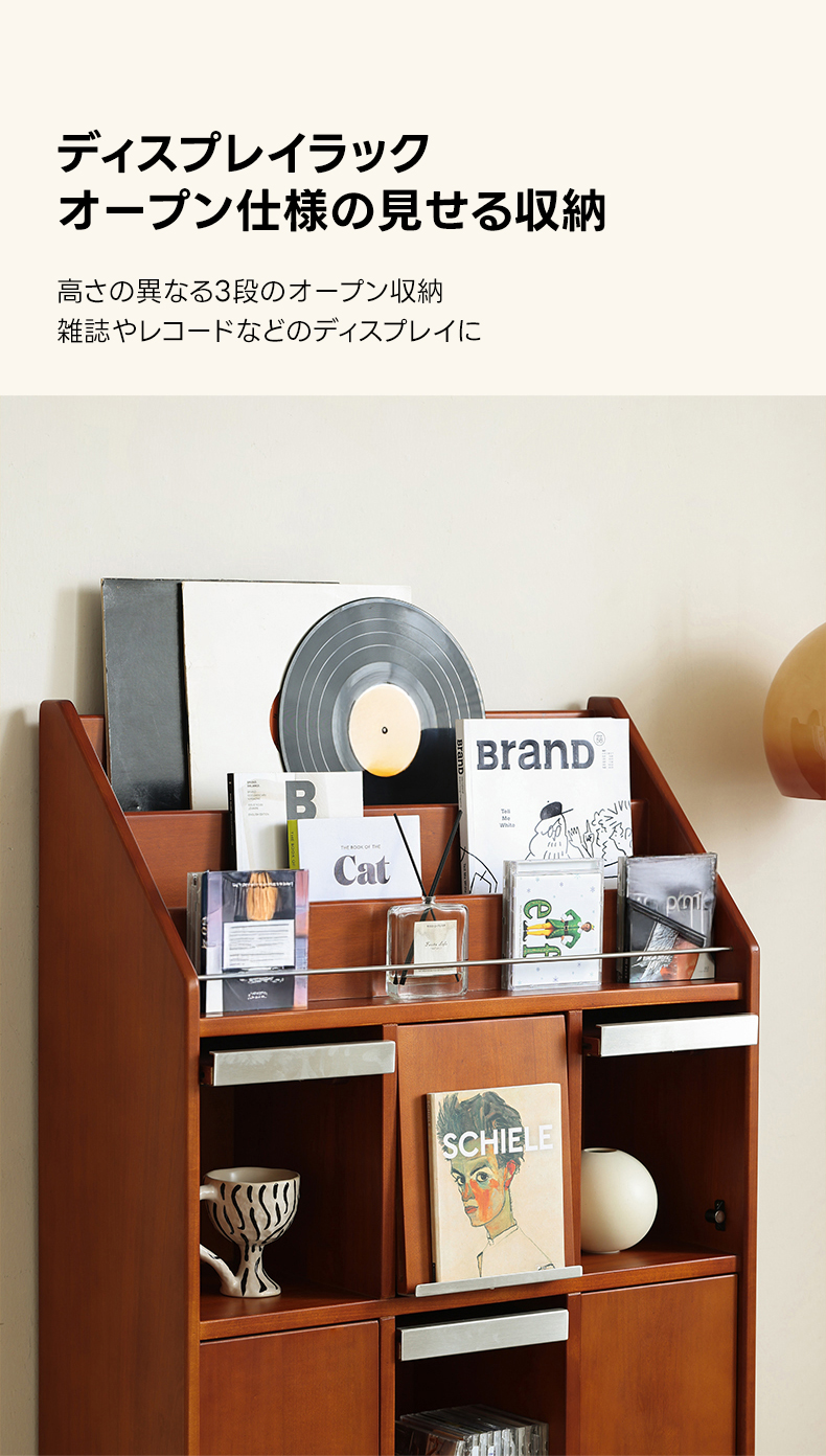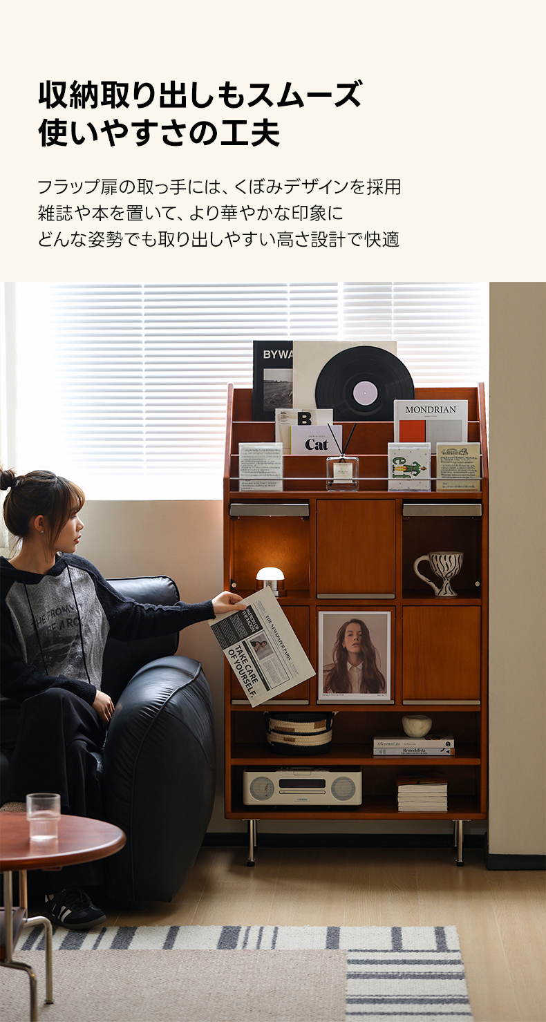 - 【多機能収納力】このディスプレイキャビネットは、フラップ扉付きで見せる収納と隠す収納を自由にレイアウト可能。3段のオープン収納は雑誌やレコードのディスプレイに最適で、必要面積はわずか0.23㎡と省スペース設計です。