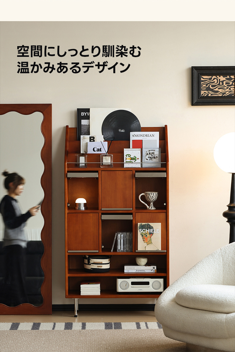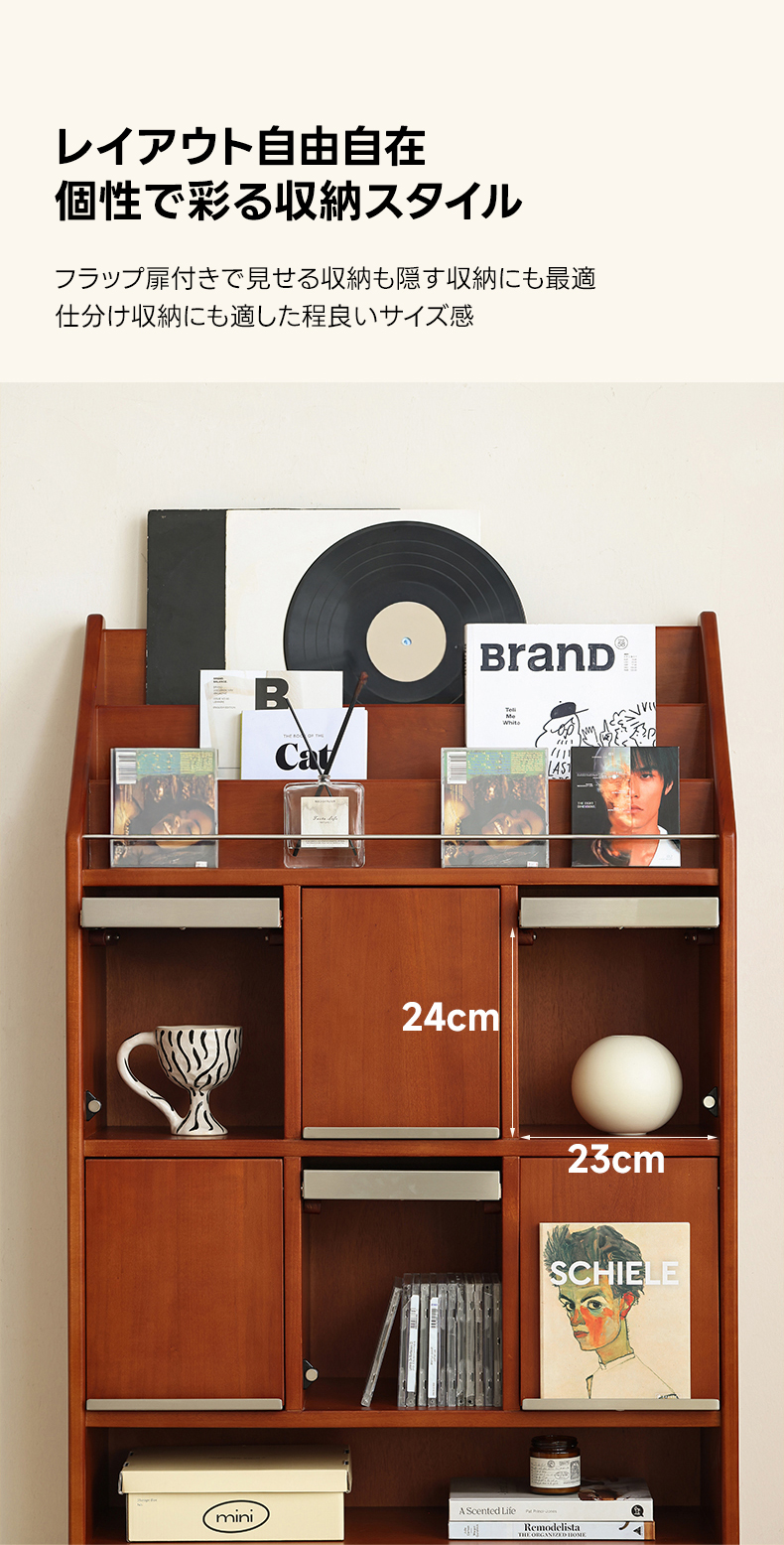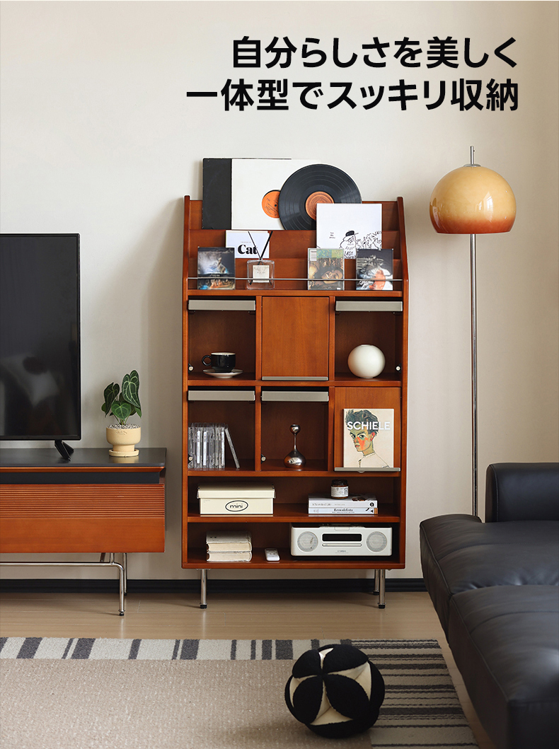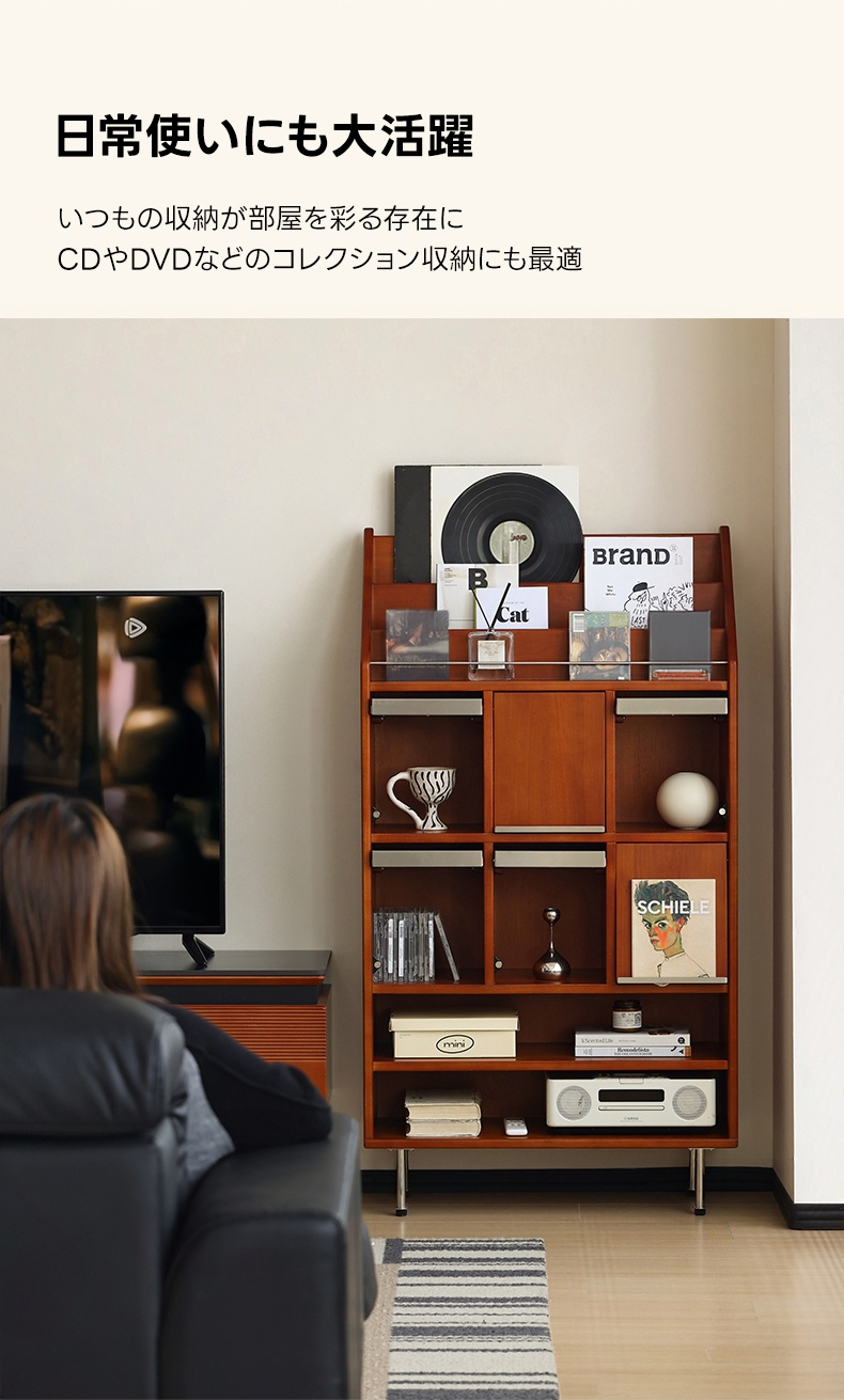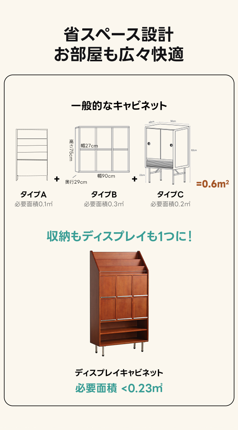 - 【多機能収納力】このディスプレイキャビネットは、フラップ扉付きで見せる収納と隠す収納を自由にレイアウト可能。3段のオープン収納は雑誌やレコードのディスプレイに最適で、必要面積はわずか0.23㎡と省スペース設計です。