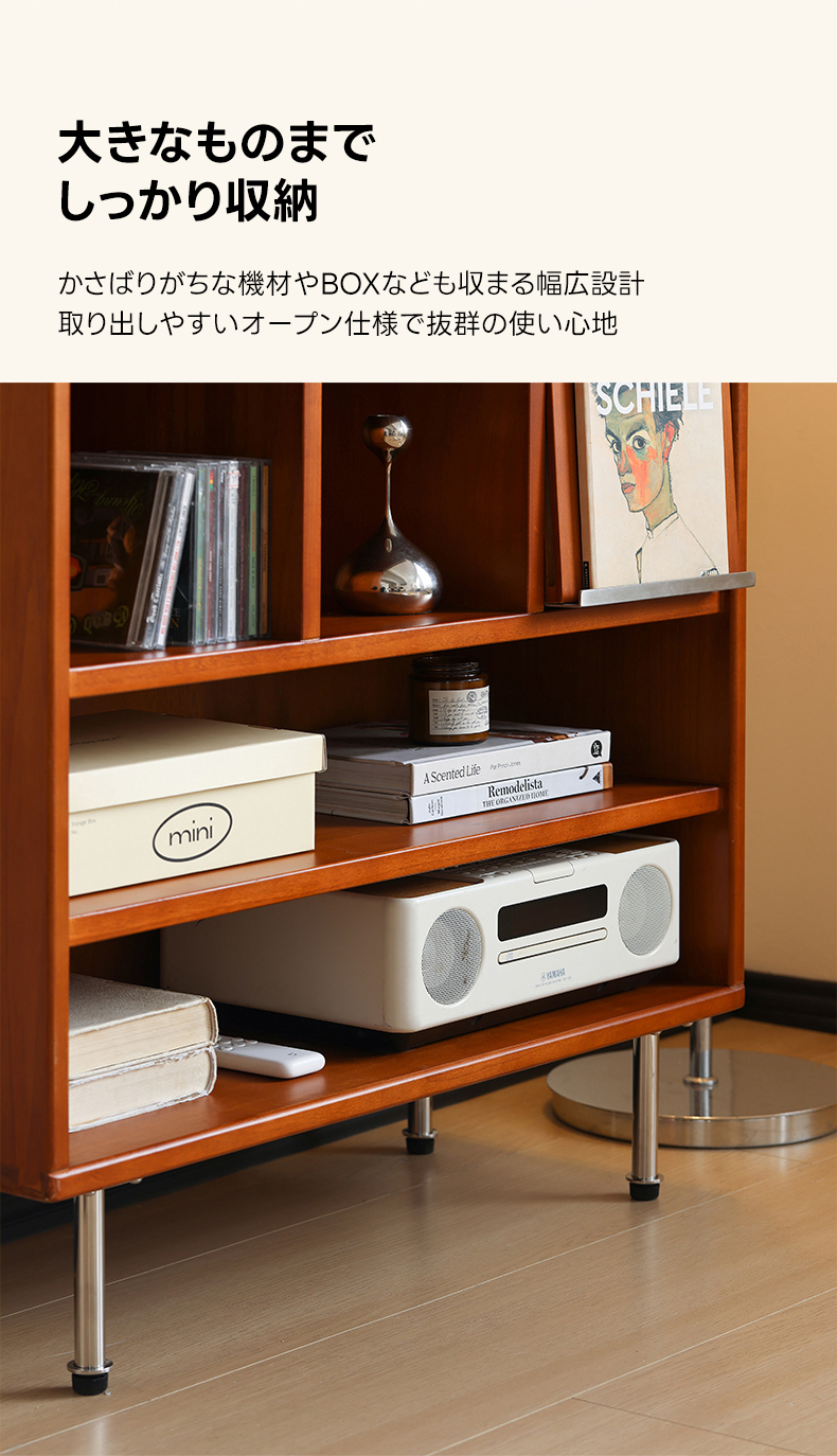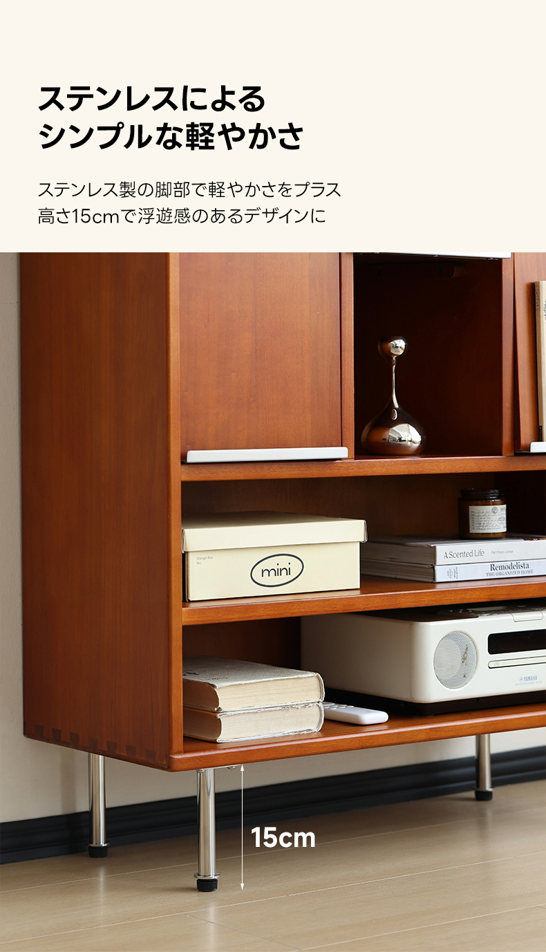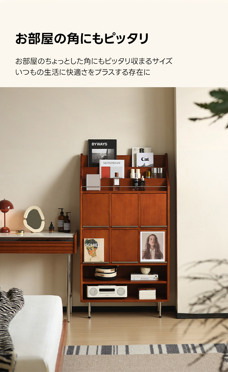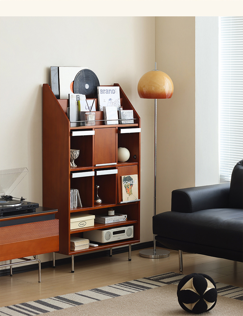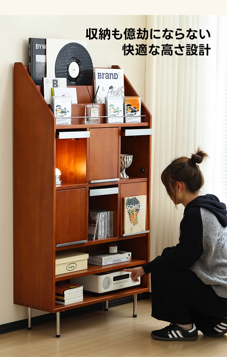 - 【多機能収納力】このディスプレイキャビネットは、フラップ扉付きで見せる収納と隠す収納を自由にレイアウト可能。3段のオープン収納は雑誌やレコードのディスプレイに最適で、必要面積はわずか0.23㎡と省スペース設計です。