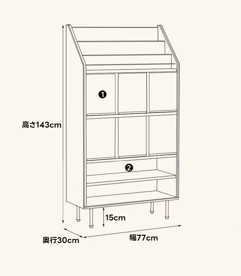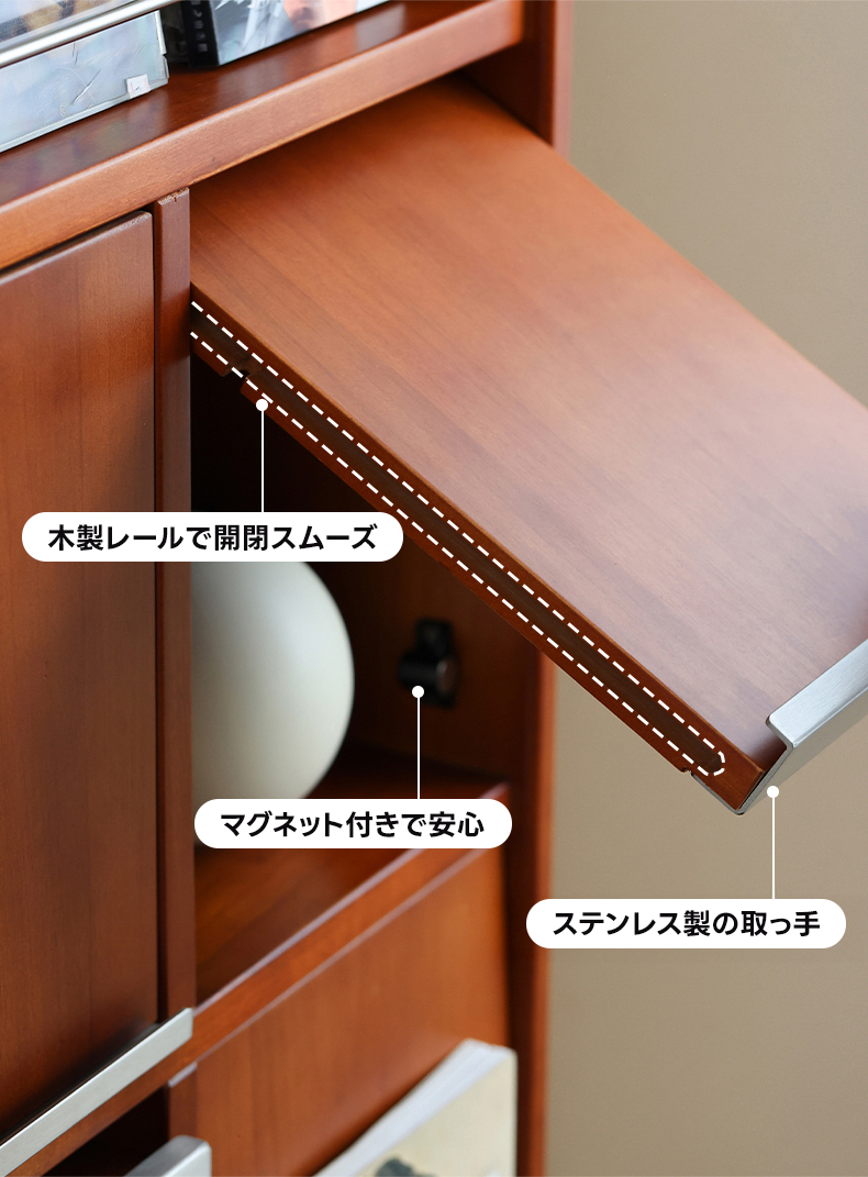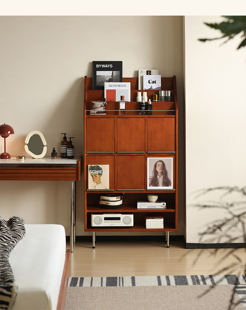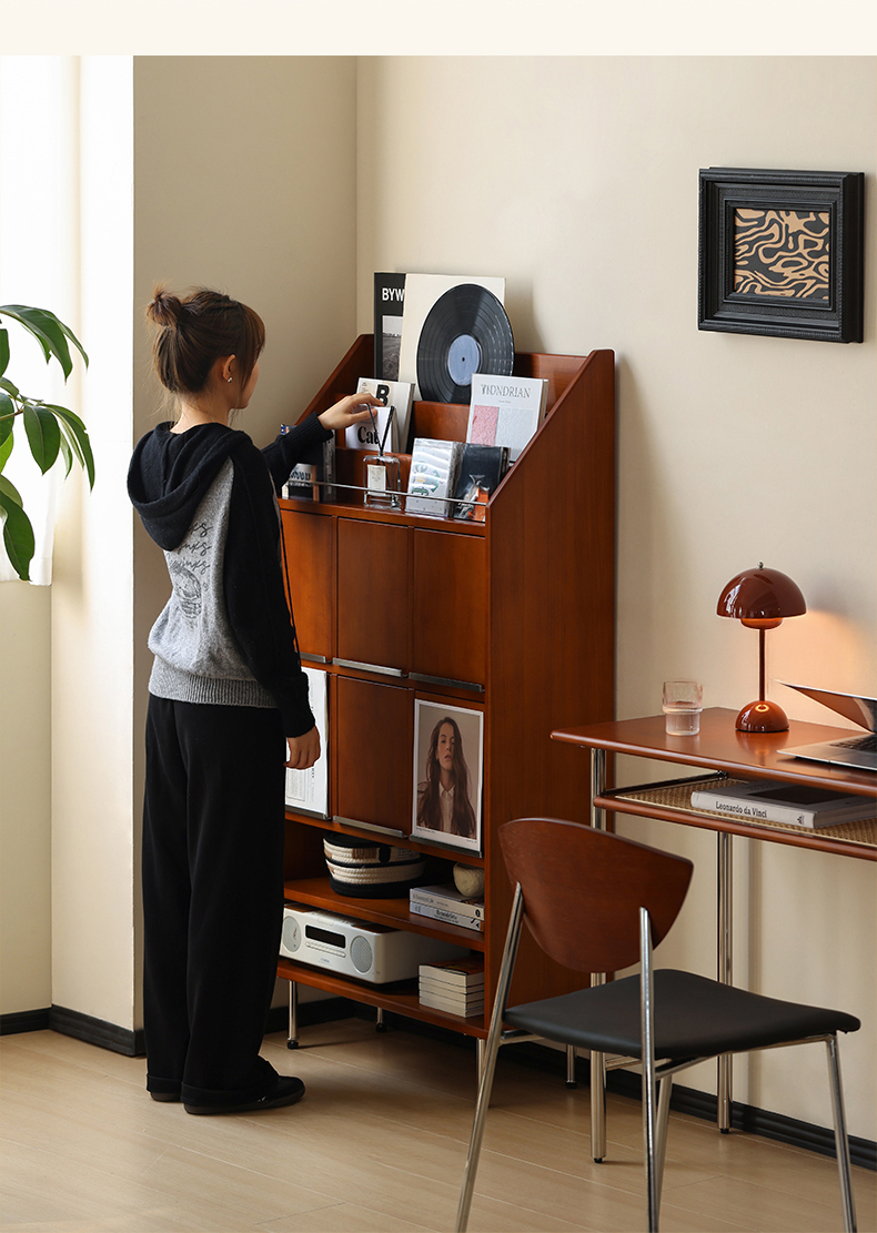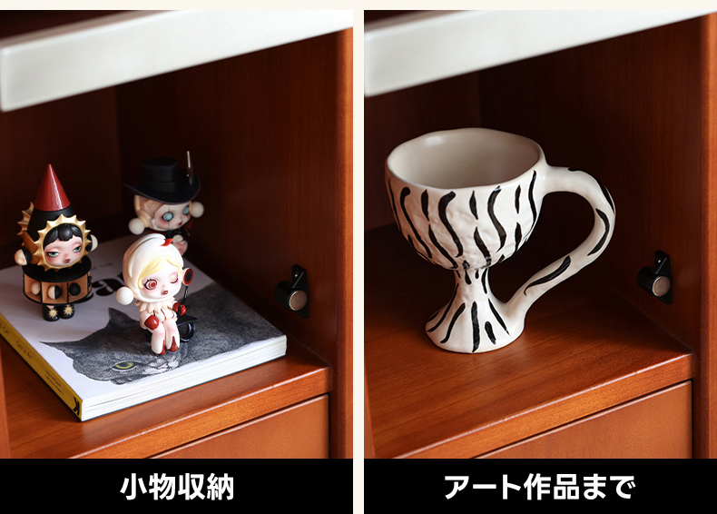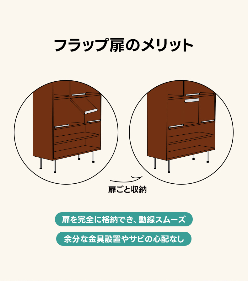 - 【多機能収納力】このディスプレイキャビネットは、フラップ扉付きで見せる収納と隠す収納を自由にレイアウト可能。3段のオープン収納は雑誌やレコードのディスプレイに最適で、必要面積はわずか0.23㎡と省スペース設計です。