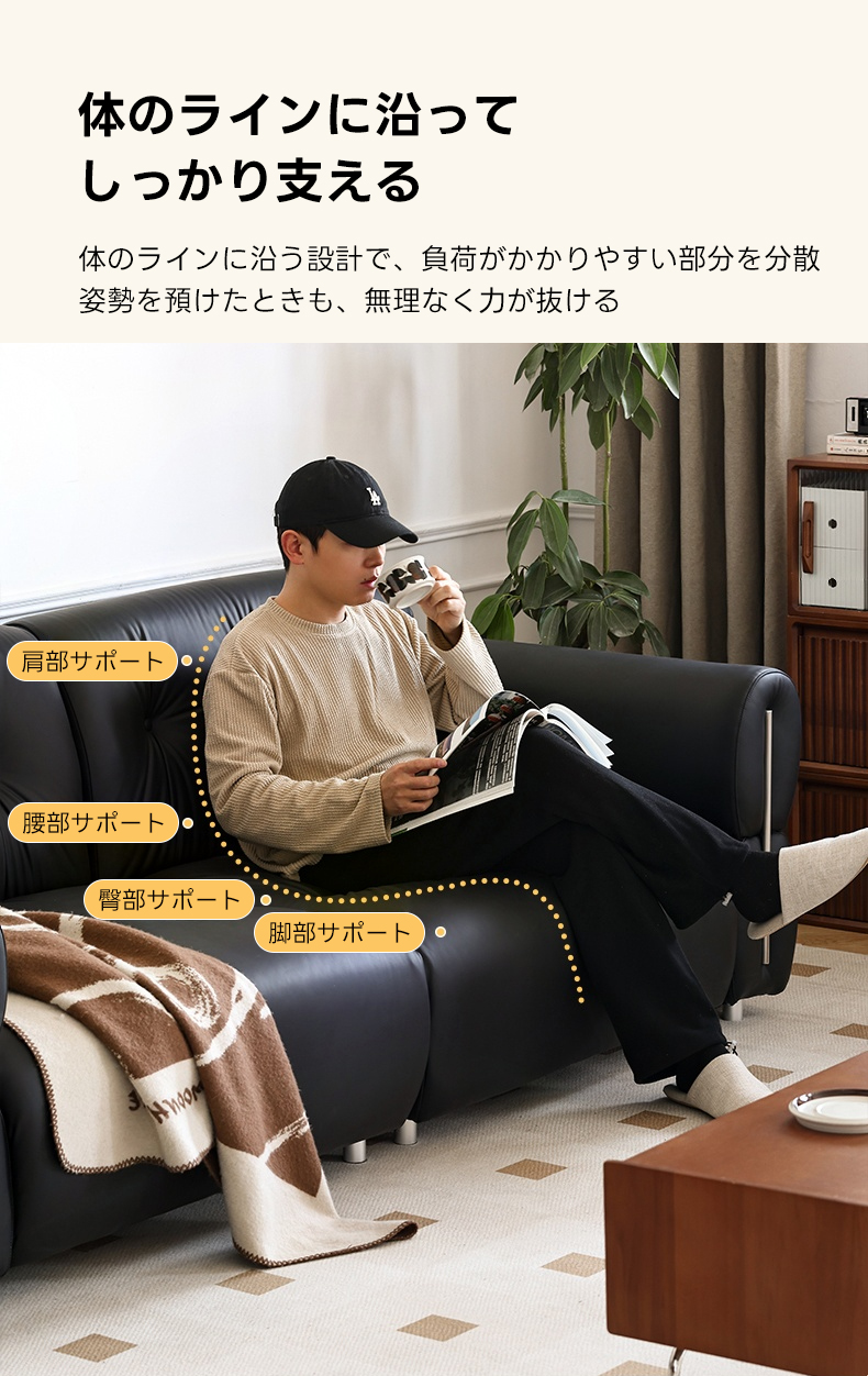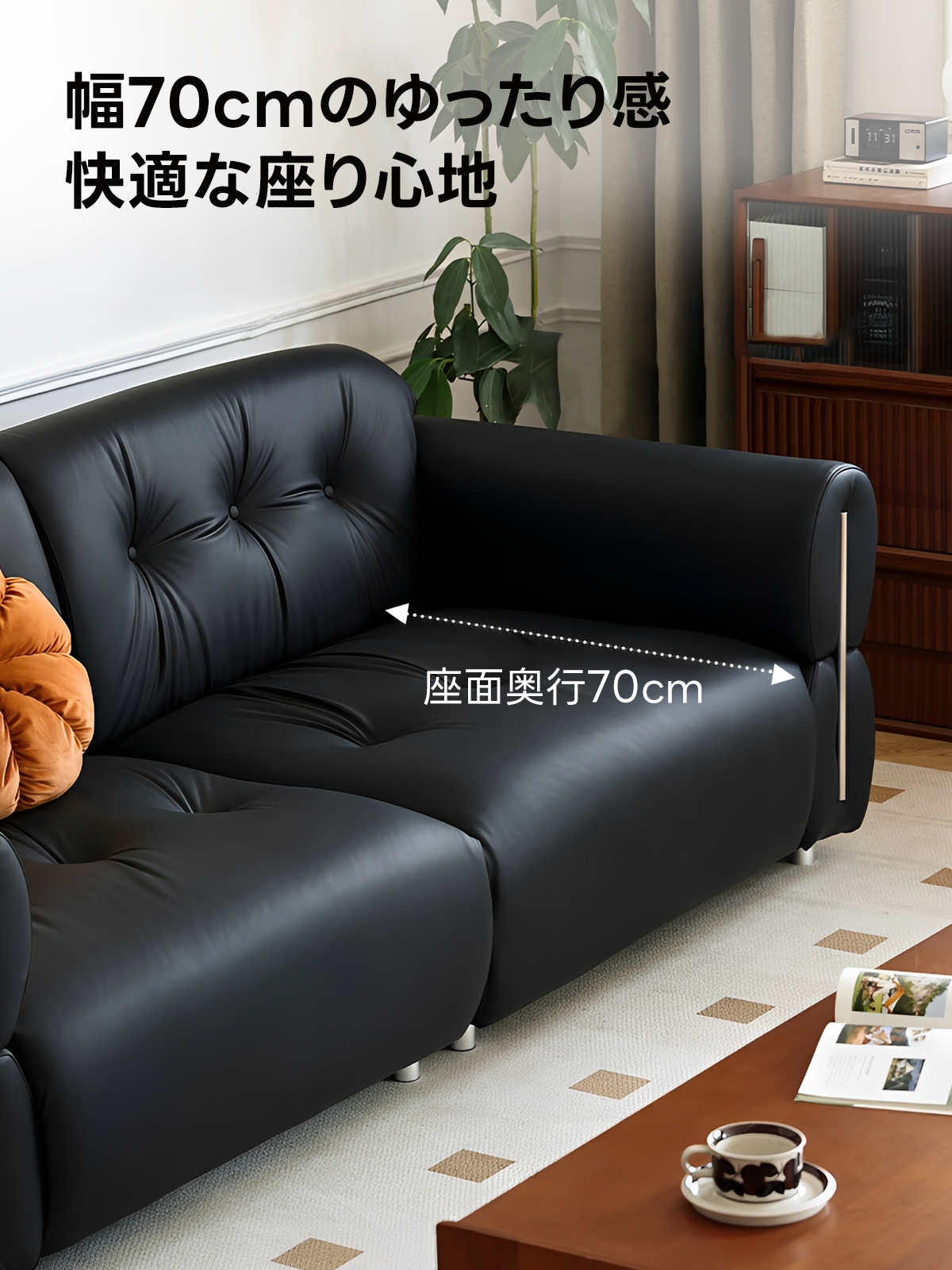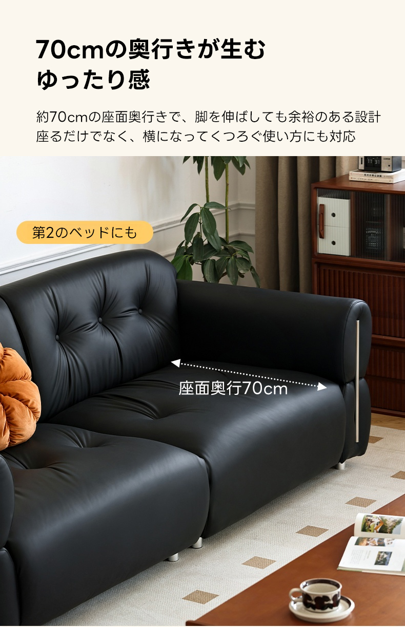 - 【リビングに最適なソファ】:このソファは、リビングにぴったりのサイズで、カップルやファミリー向けに設計されています。70cmの座面奥行きで、足を伸ばしてゆったりとくつろげます。