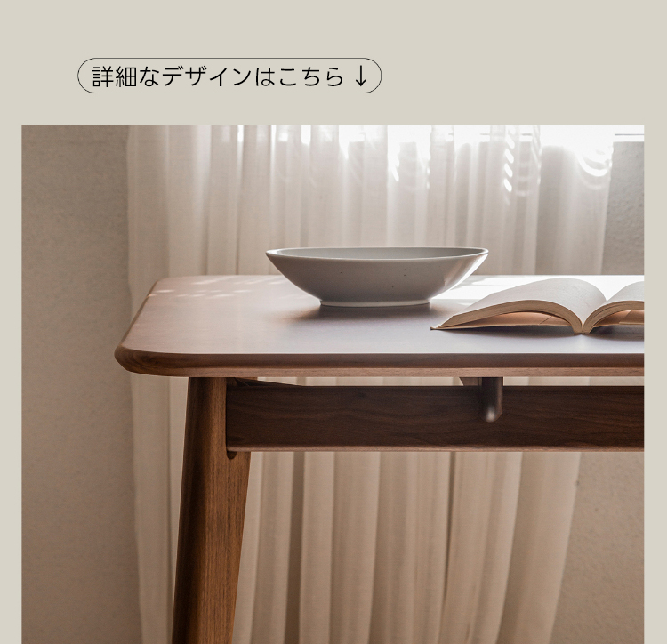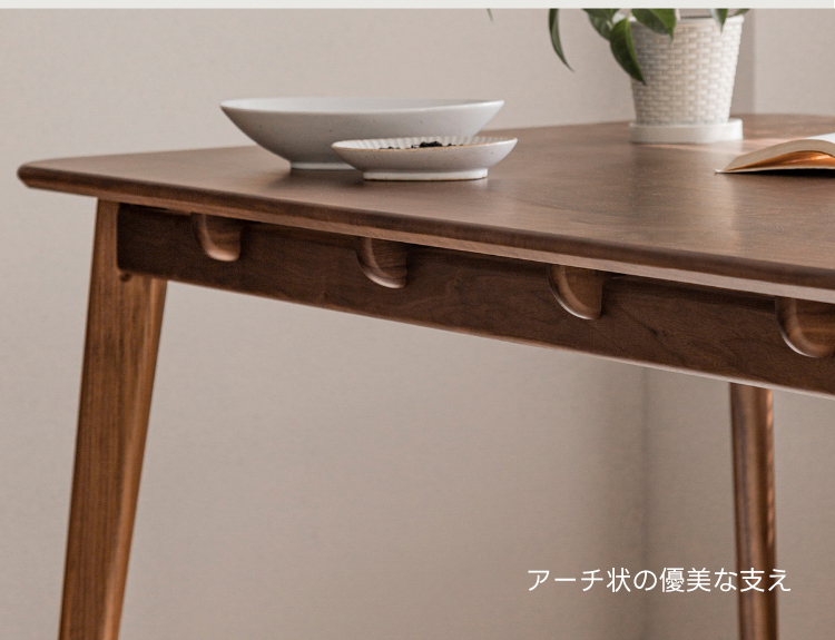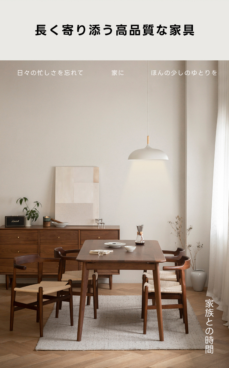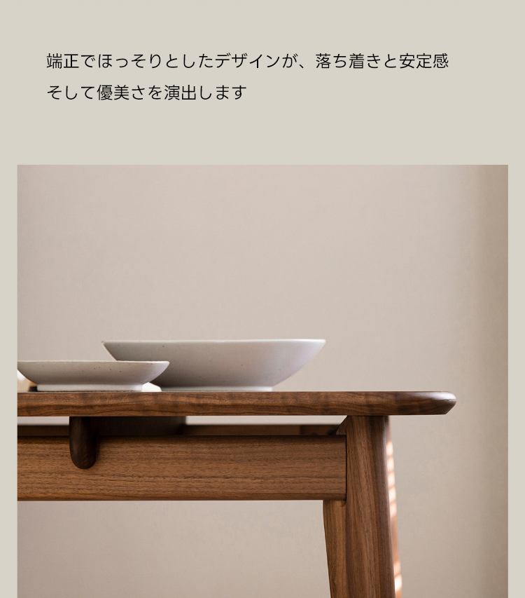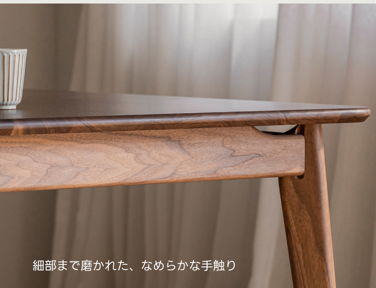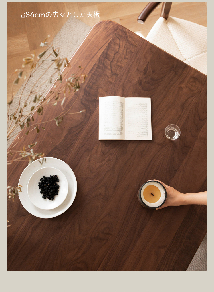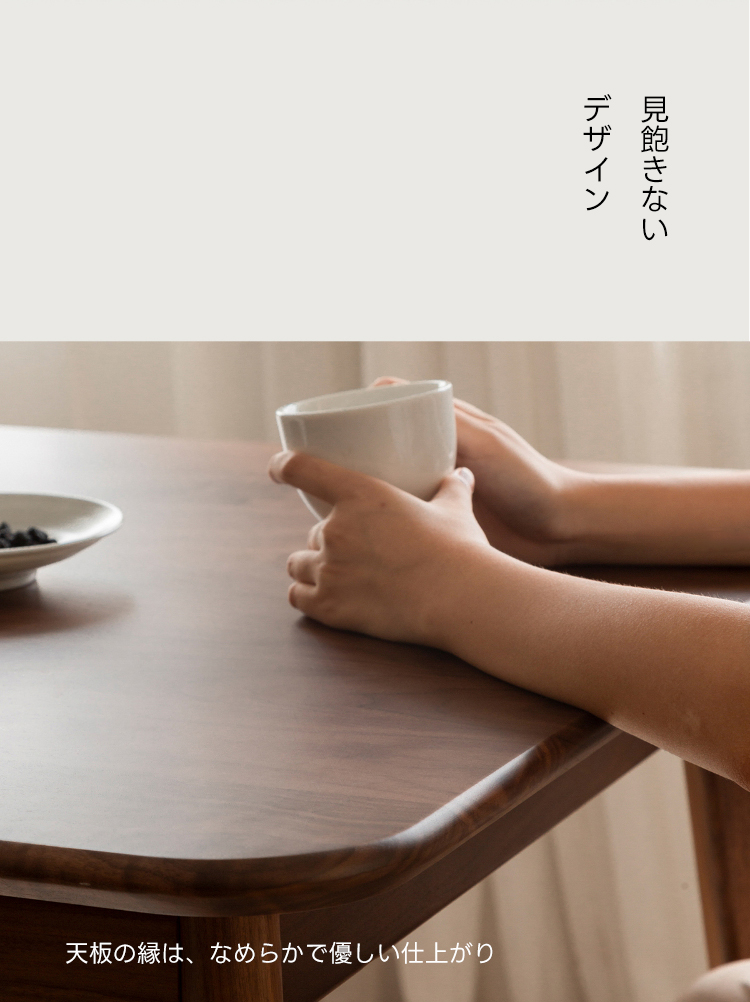 - 【高級ウォールナット材使用】北米産のFAS級ウォールナット材を使用し、美しい木目と耐久性を兼ね備えたダイニングテーブルです。色ムラや節が少なく、両面ともに良質な仕上がりが特徴です。