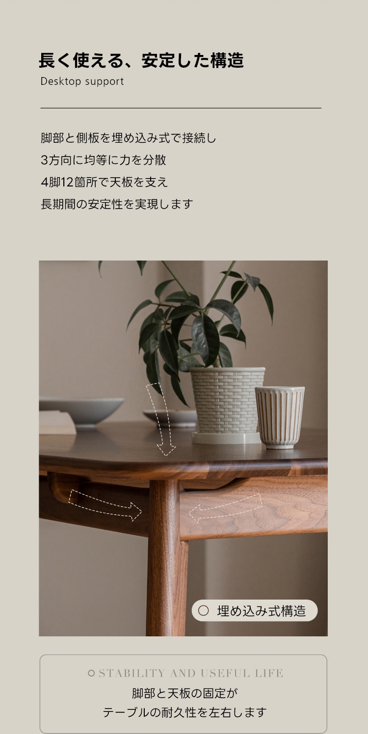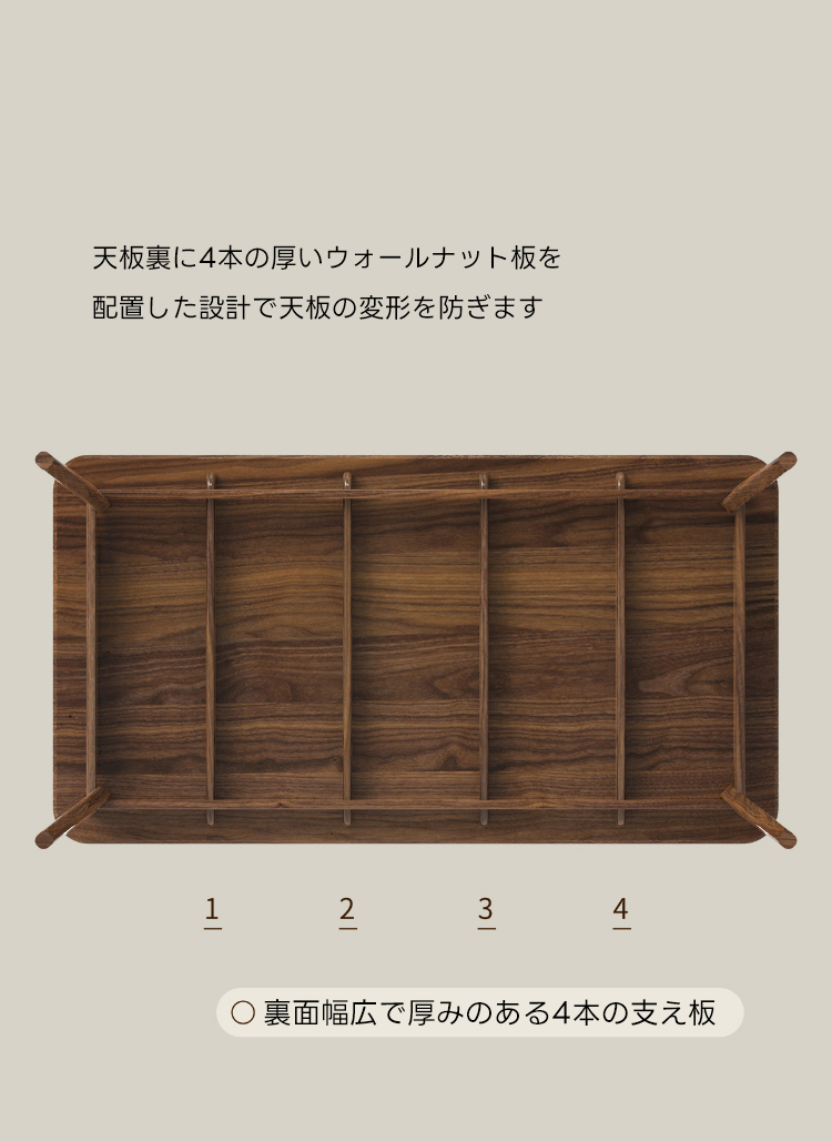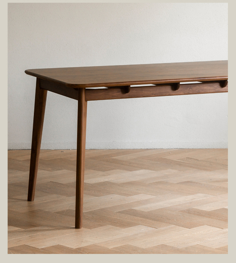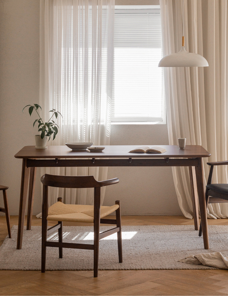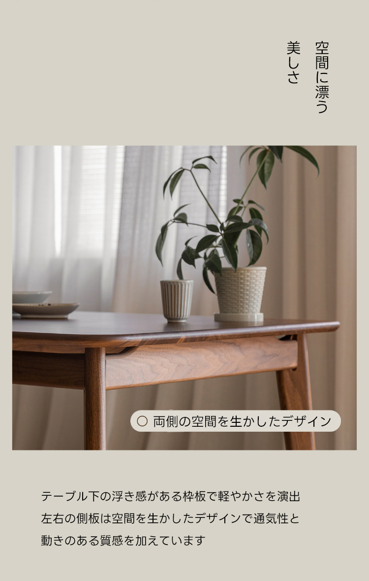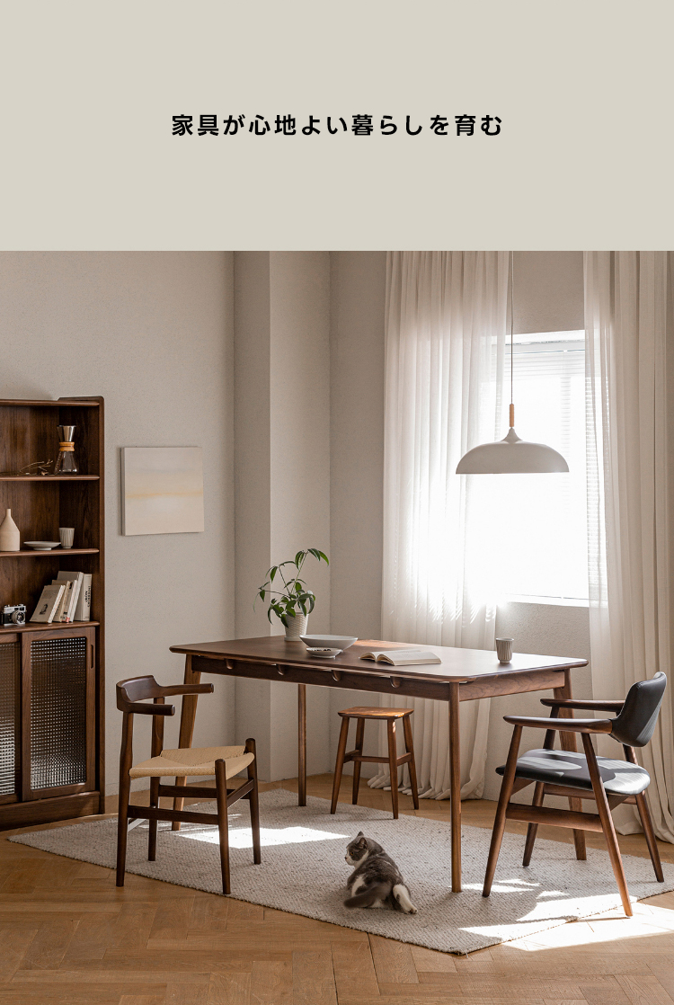 - 【高級ウォールナット材使用】北米産のFAS級ウォールナット材を使用し、美しい木目と耐久性を兼ね備えたダイニングテーブルです。色ムラや節が少なく、両面ともに良質な仕上がりが特徴です。