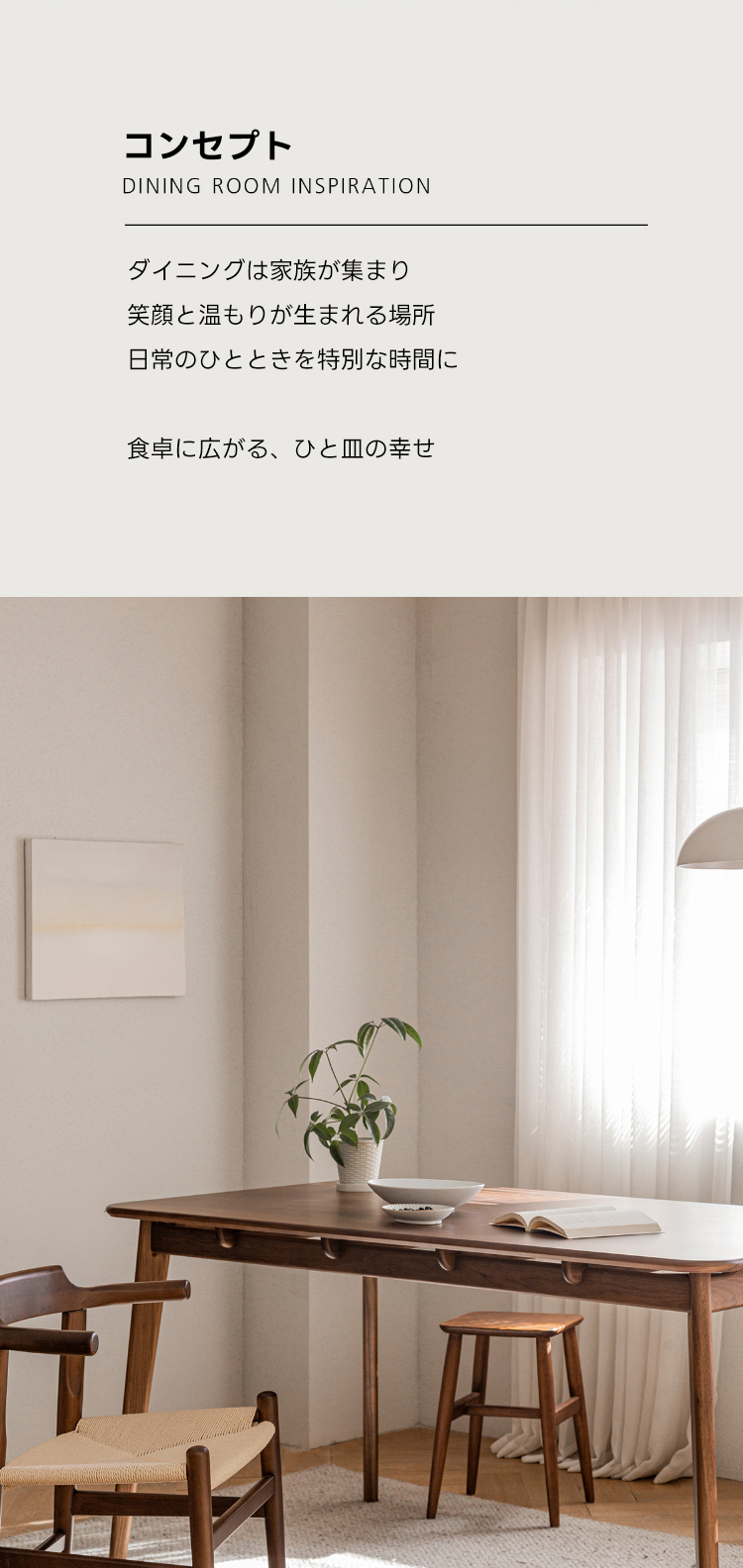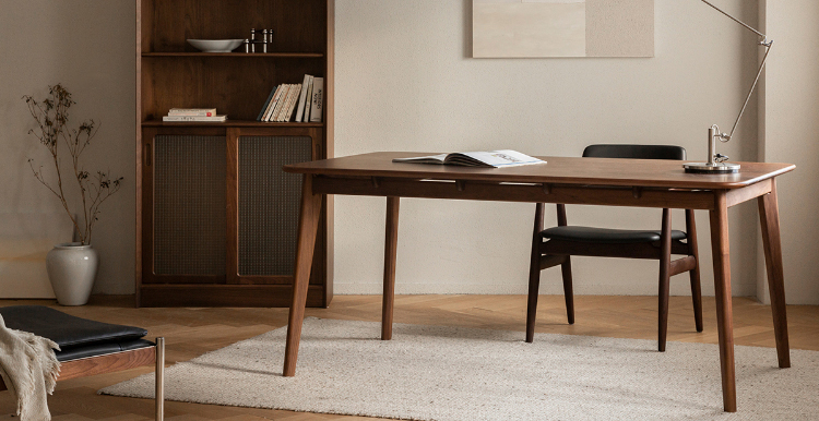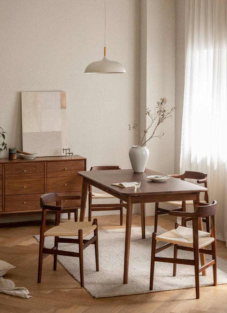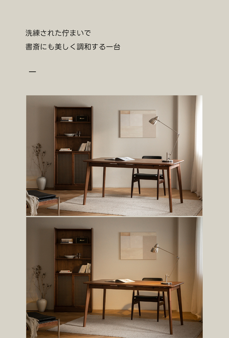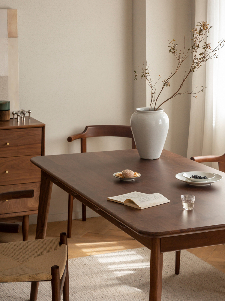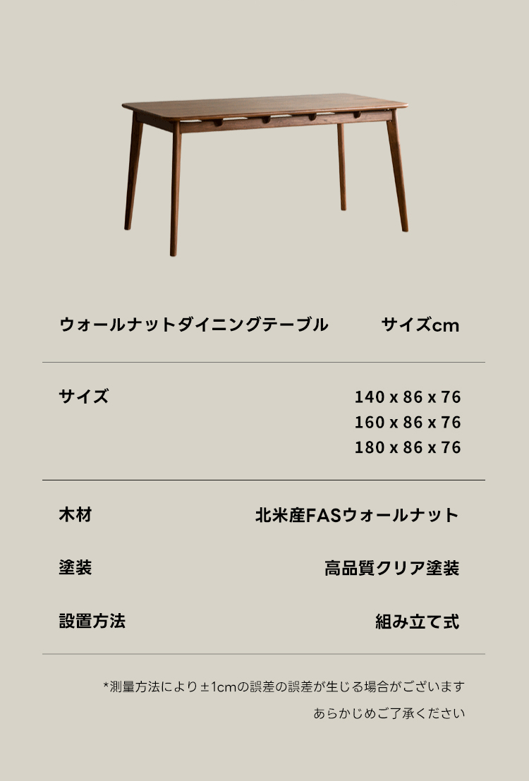 - 【高級ウォールナット材使用】北米産のFAS級ウォールナット材を使用し、美しい木目と耐久性を兼ね備えたダイニングテーブルです。色ムラや節が少なく、両面ともに良質な仕上がりが特徴です。