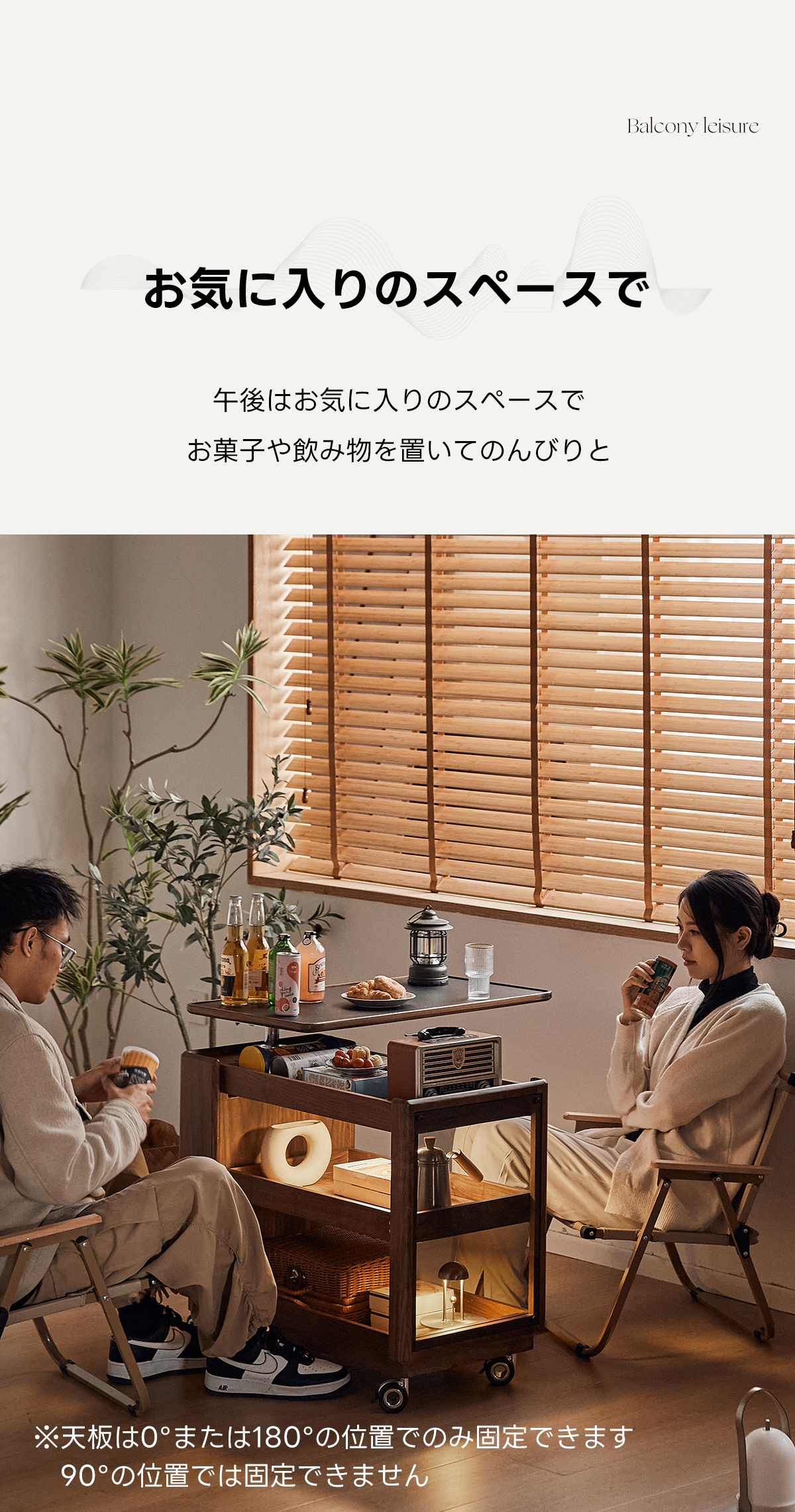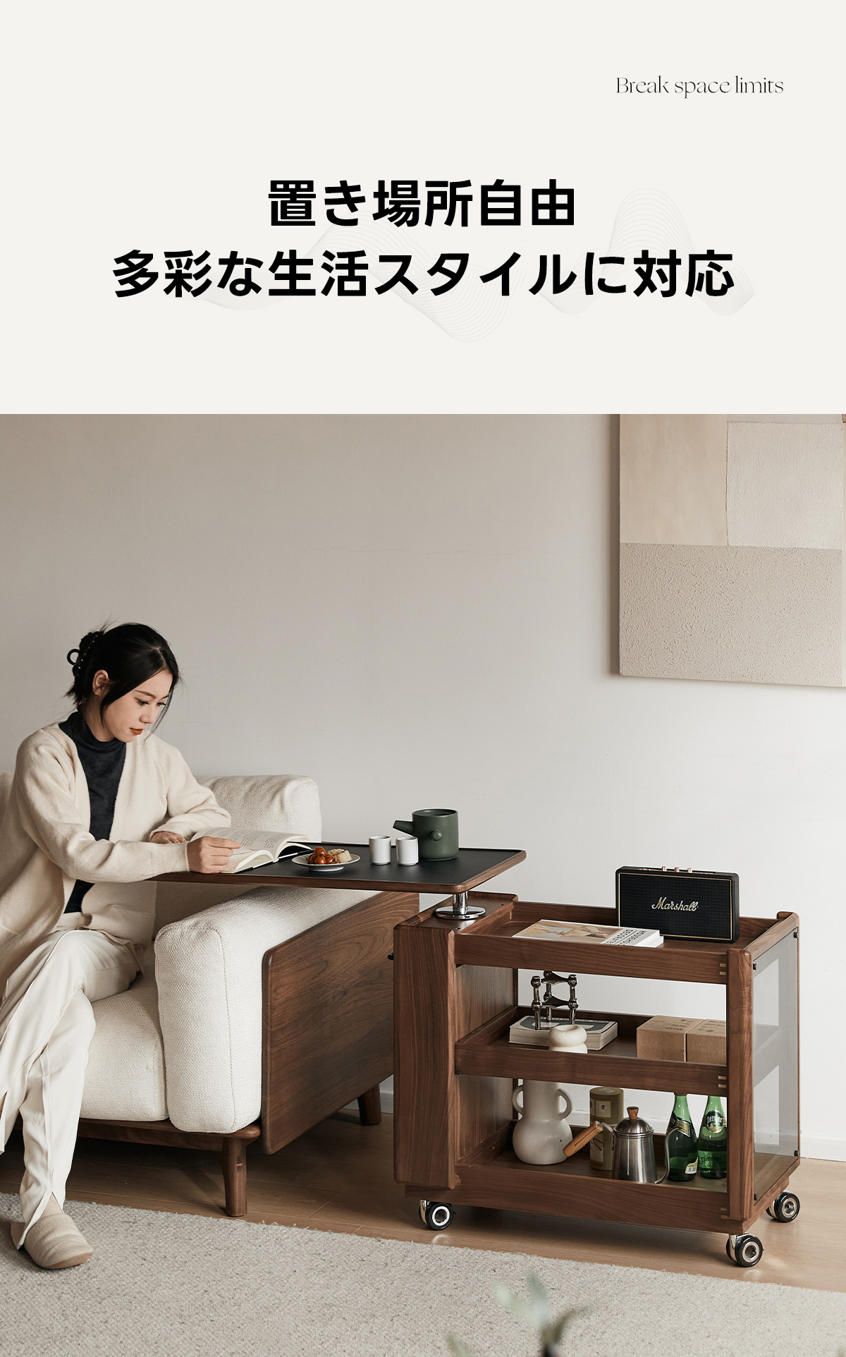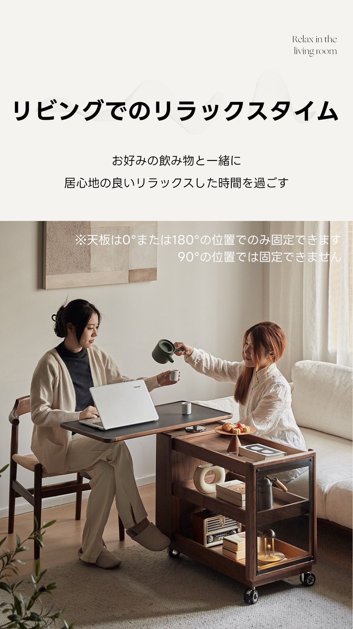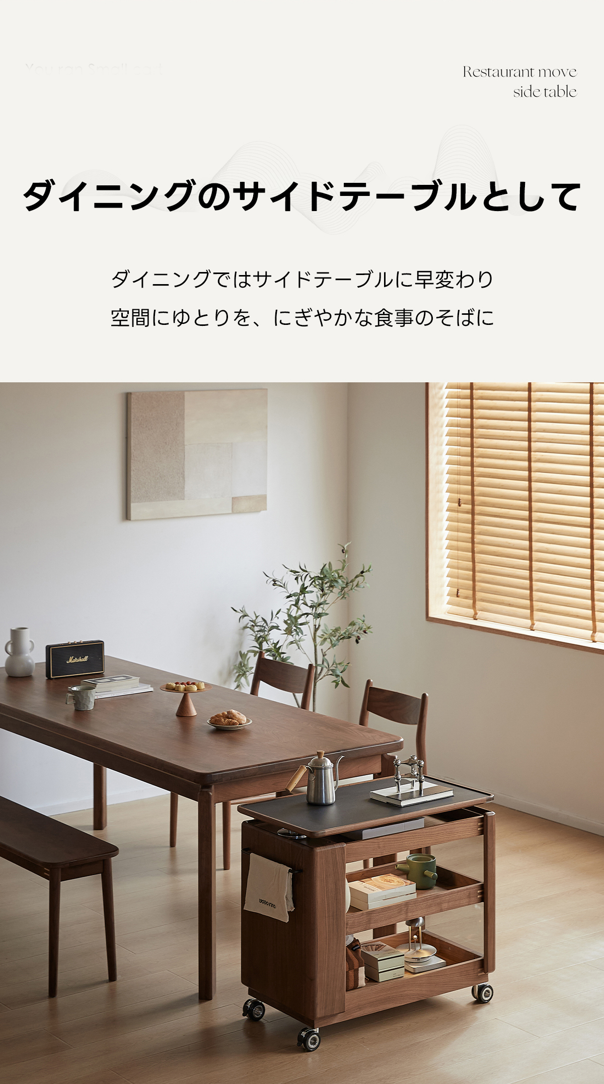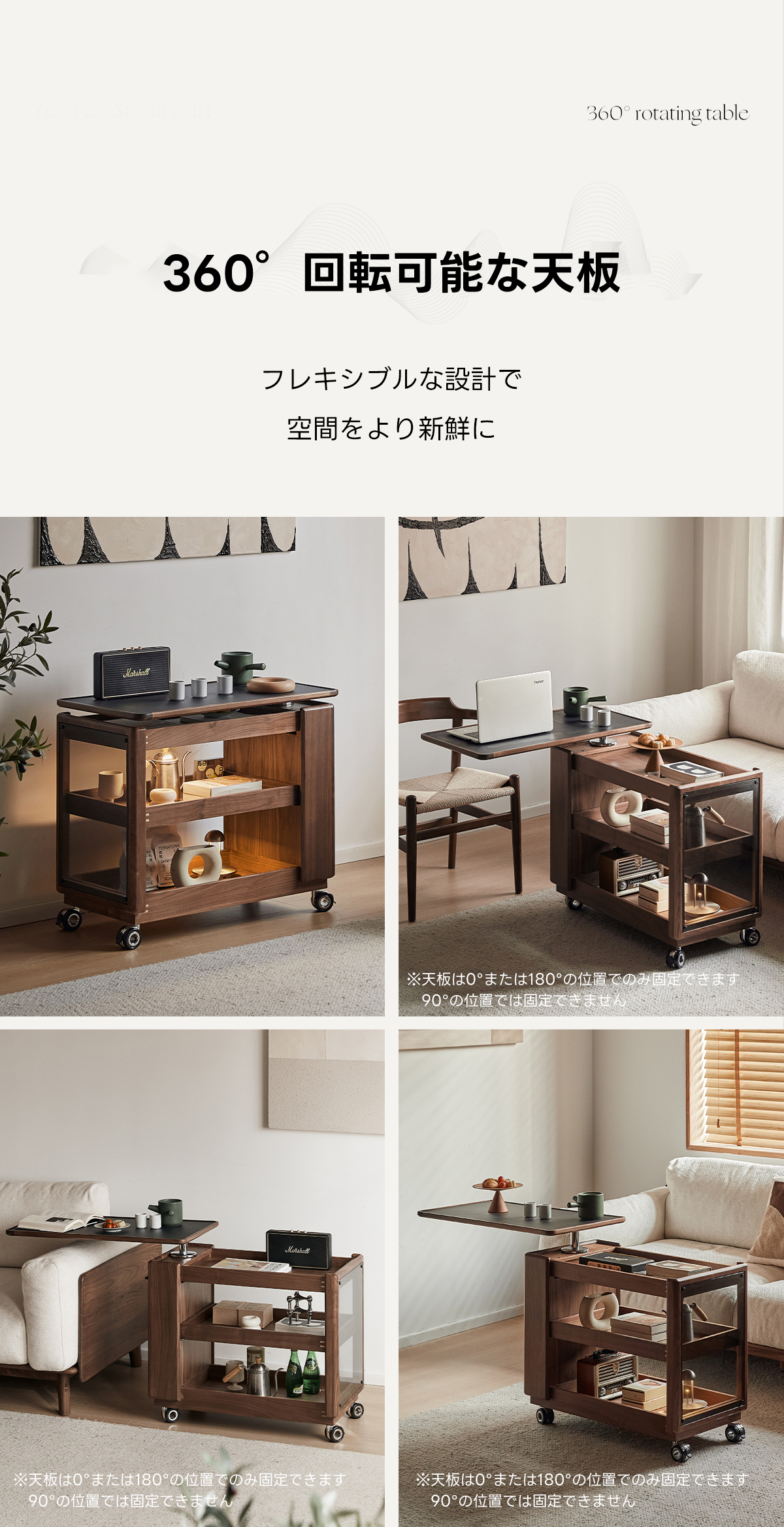 - 【多機能デザイン】ウォールナット材を使用したこのワゴンは、360度回転可能な天板と高さ調節機能を備えています。作業台やテーブルとして自由に使用でき、リビングやキッチンでの活用が可能です。キャスター付きで移動も簡単、どんな場所でも便利に使えます。